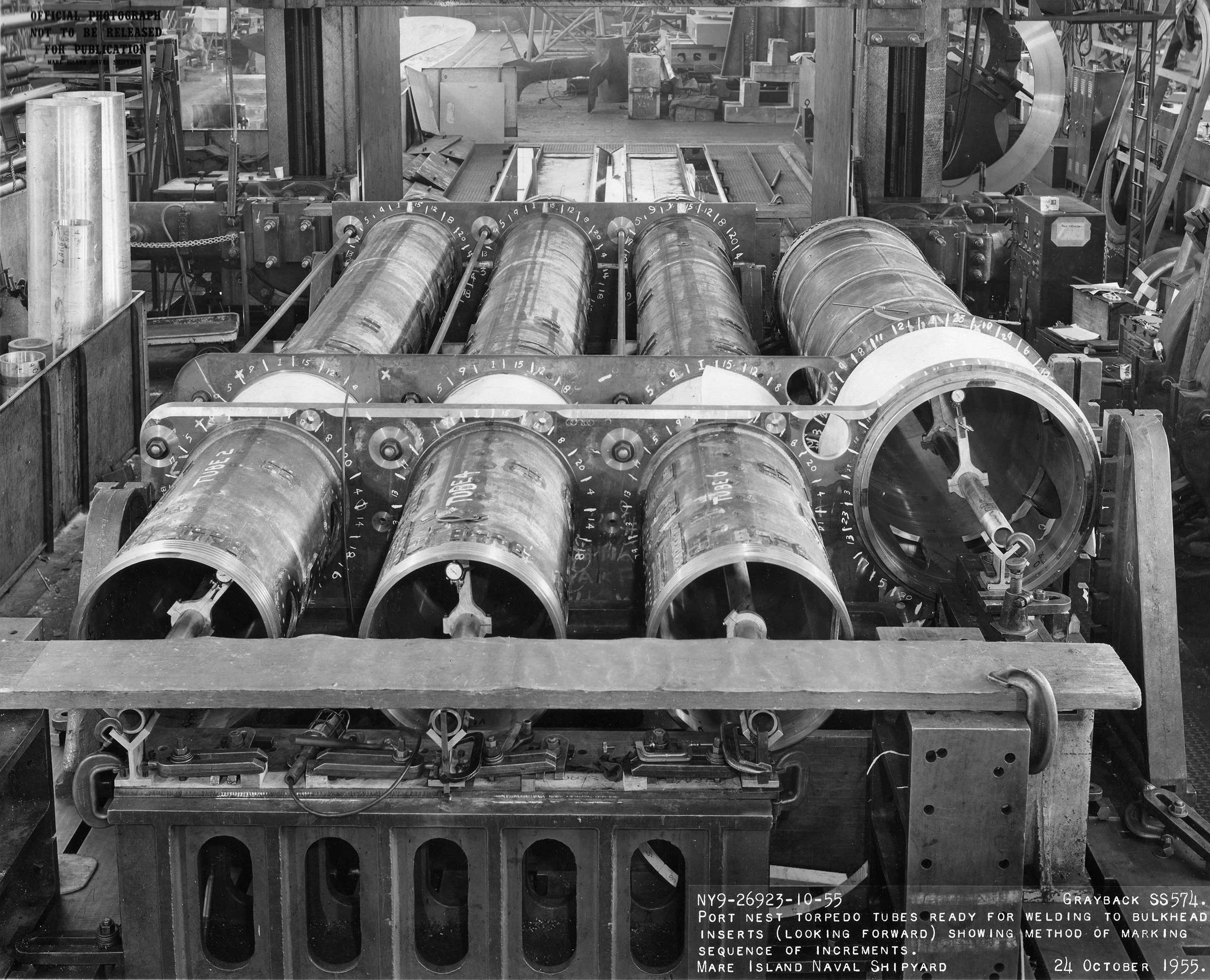 ![]() | 1.10k | Port nest torpedo tube tubes ready for welding to bulkhead inserts (looking forward) showing method of marking sequence of increments on 24 October 1955. | USN photo # 26923-10-55, courtesy of Darryl L. Baker. | |