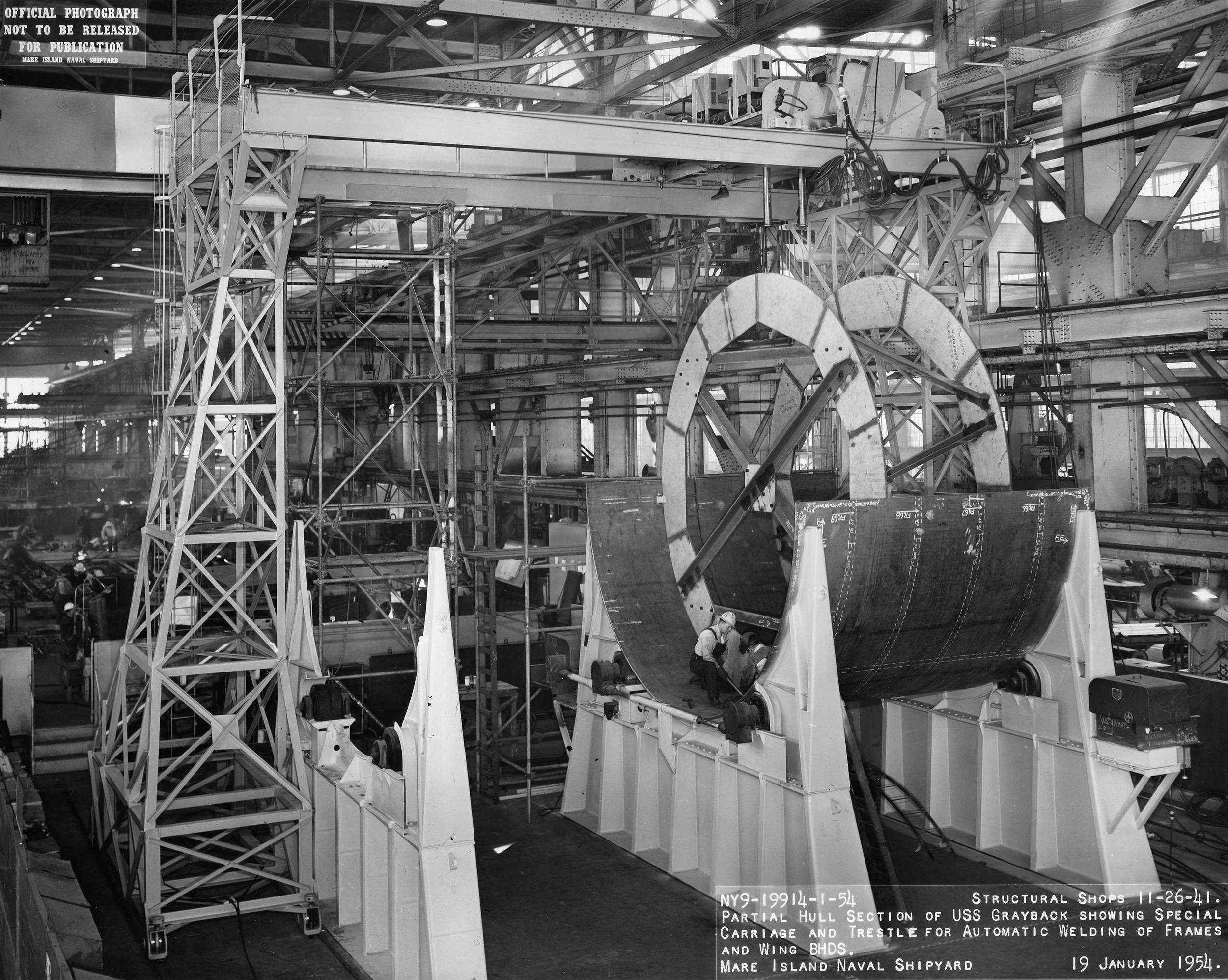 ![]() | 1.10k | Partial hull section of Grayback (SS-574) showing special carriage and trestle for automatic welding of frames and wing bulkheads on 19 January 1954. | USN photo # 19914-1-54, courtesy of Darryl L. Baker. | |