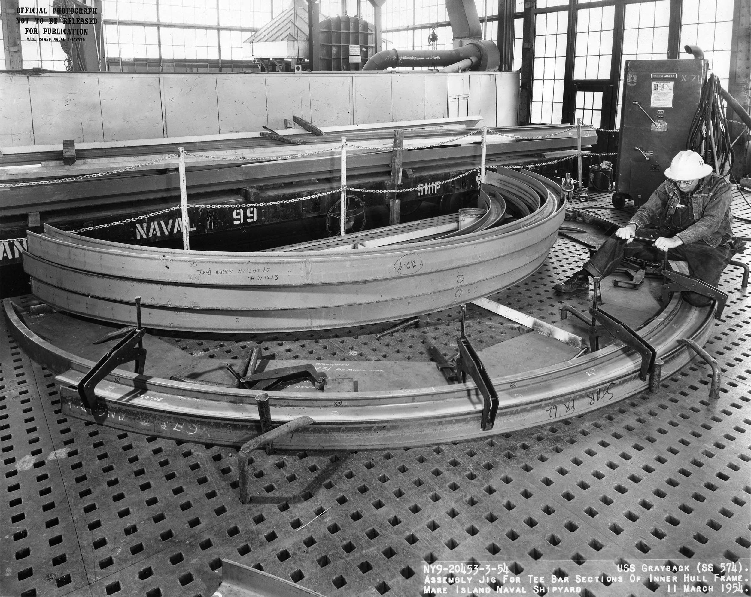 ![]() | 1.10k | Assembly jig for tee bar sections of inner hull frame on 11 March 1954. | USN photo # 20453-5-54, courtesy of Darryl L. Baker. | |