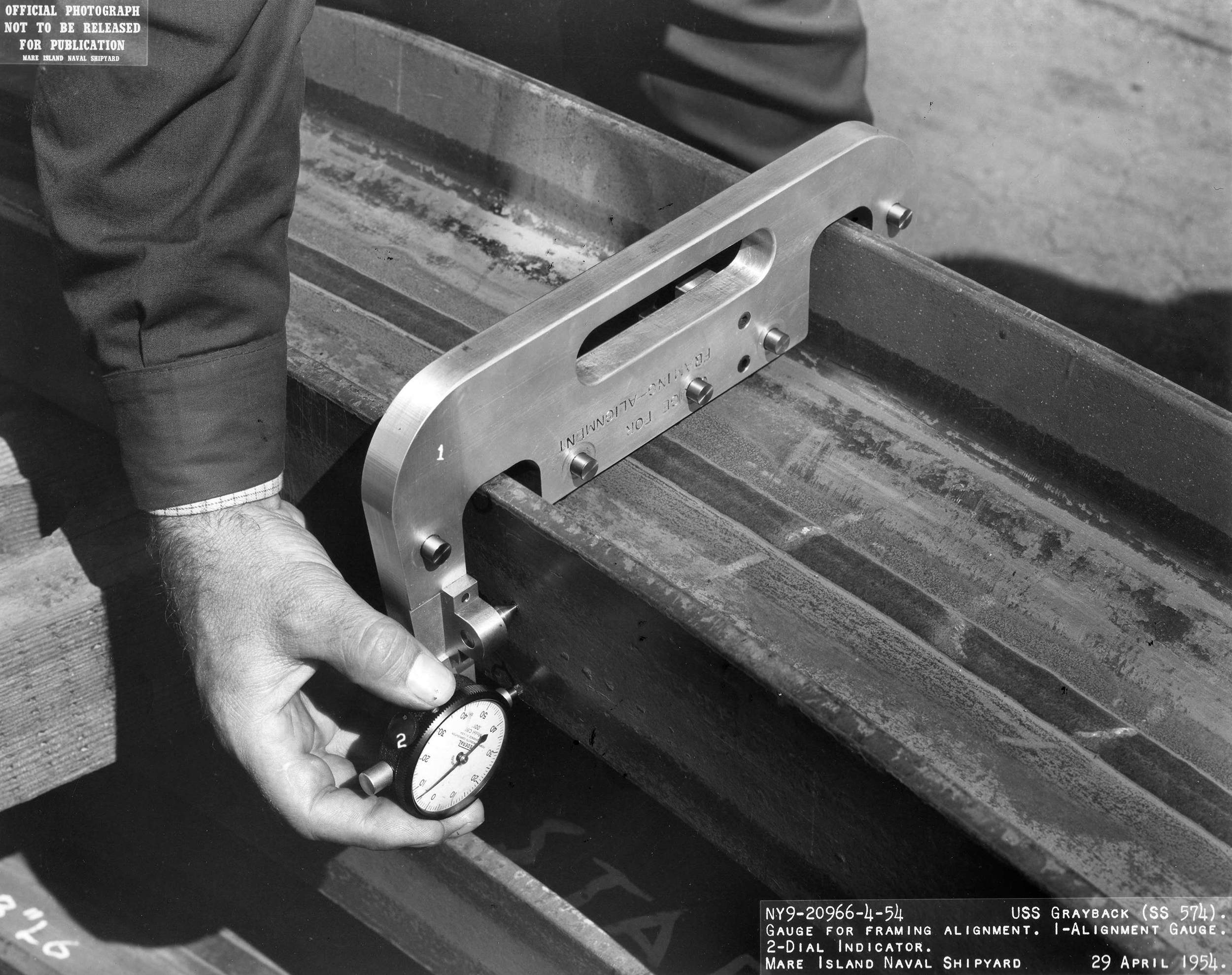 ![]() | 961k | Gauge for framing alignment. 1 – Is the alignment gauge; 2 is the dial indicator; 29 April 1954. | USN photo # 20966-4-54, courtesy of Darryl L. Baker. | |