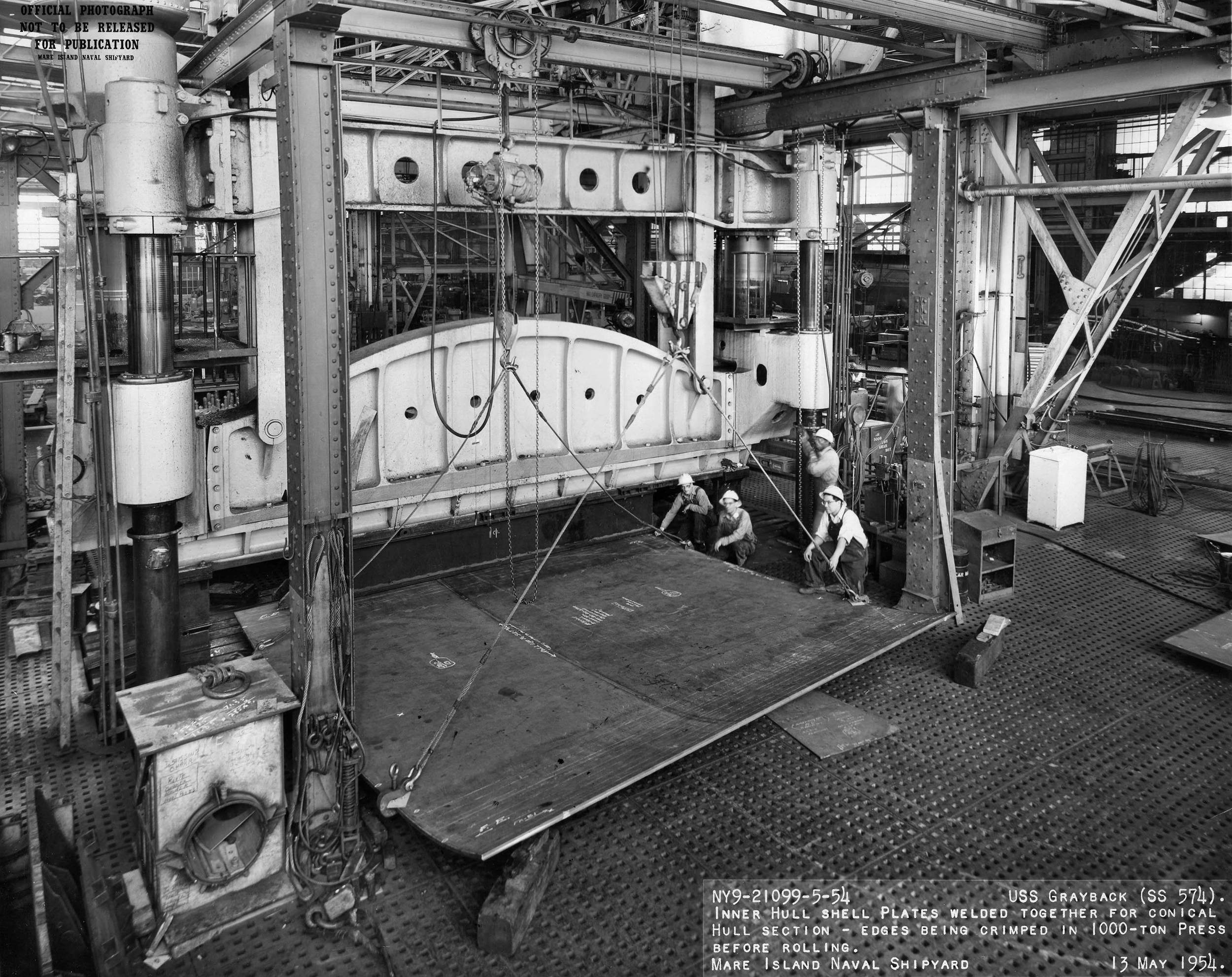![]() | 1.20k | Inner hull shell plates welded together for conical hull section – edges being crimped in 1000 ton press before rolling on 13 May 1954. | USN photo # 21099-5-54, courtesy of Darryl L. Baker. | |