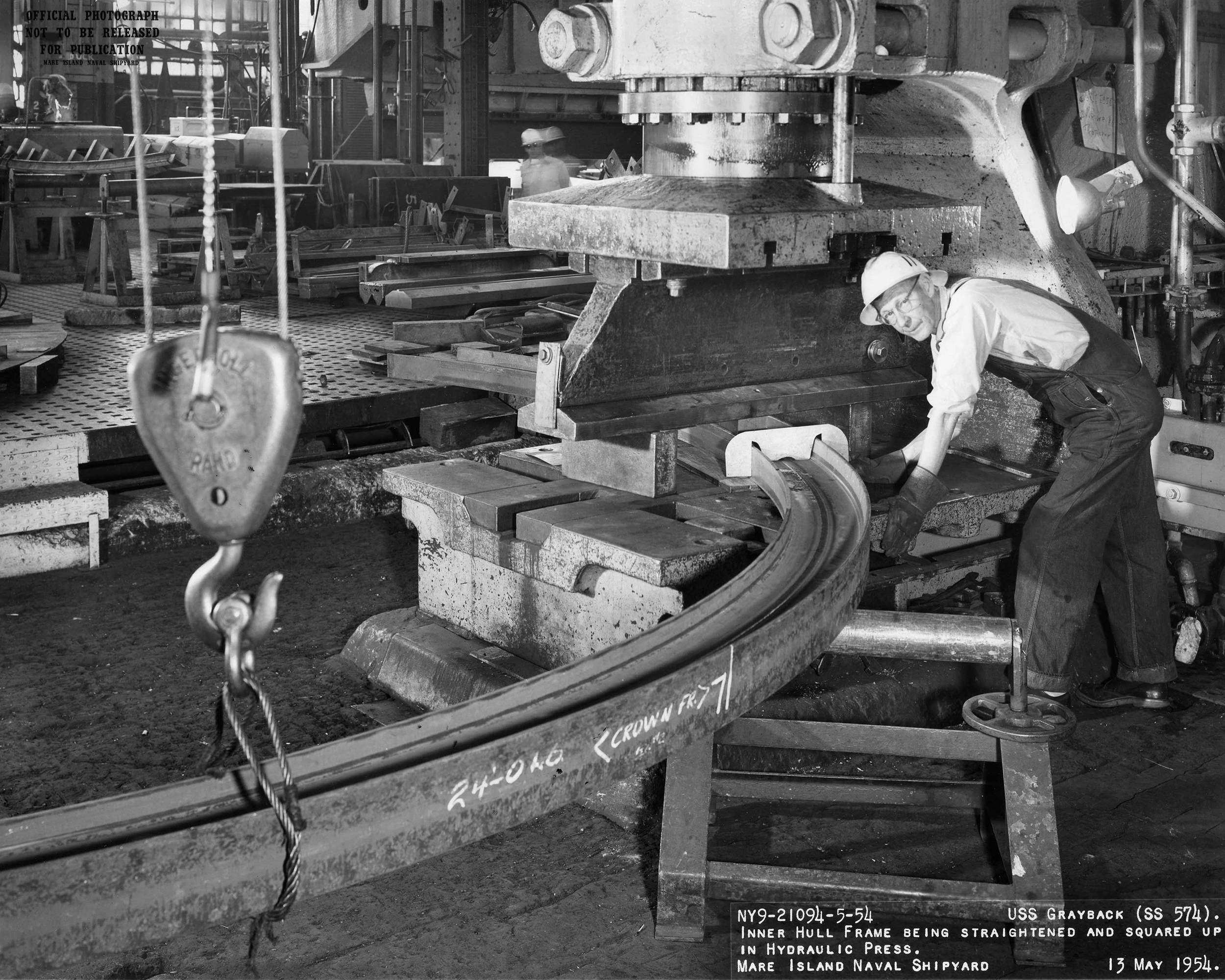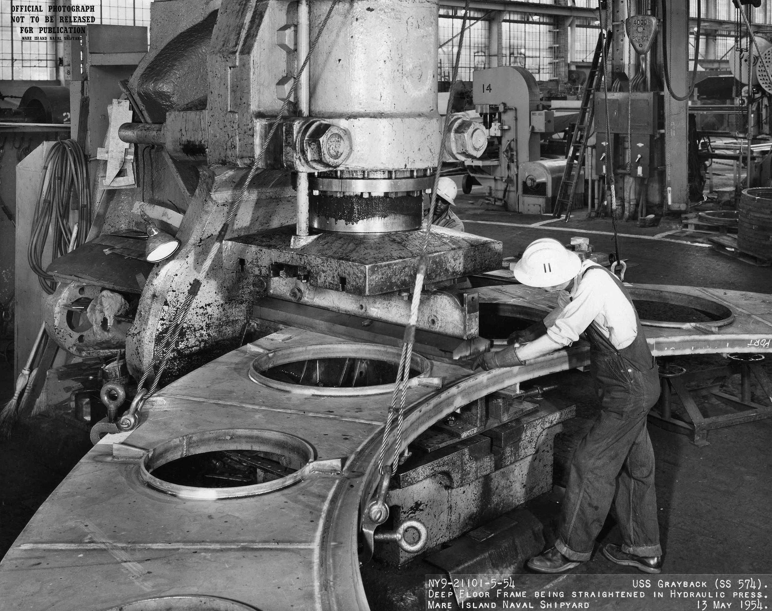 ![]() | 1.10k | Deep floor frame being straightened in hydraulic press on 13 May 1954. | USN photo # 21101-5-54, courtesy of Darryl L. Baker. | |