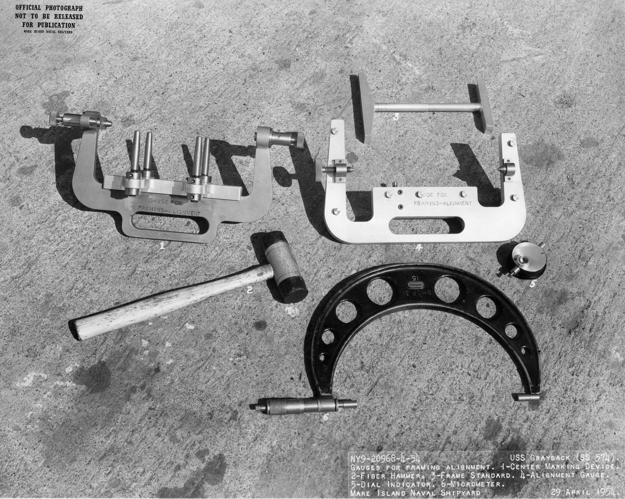 ![]() | 570k | Gauges for framing alignment. 1 – Center marking device. 2 – Fiber hammer. 3 – Frame standard. 4 – Alignment gauge. 5 – Dial indicator, and 6 – Micrometer on 29 April 1954. | USN photo # 20968-4-54, courtesy of Darryl L. Baker. | |