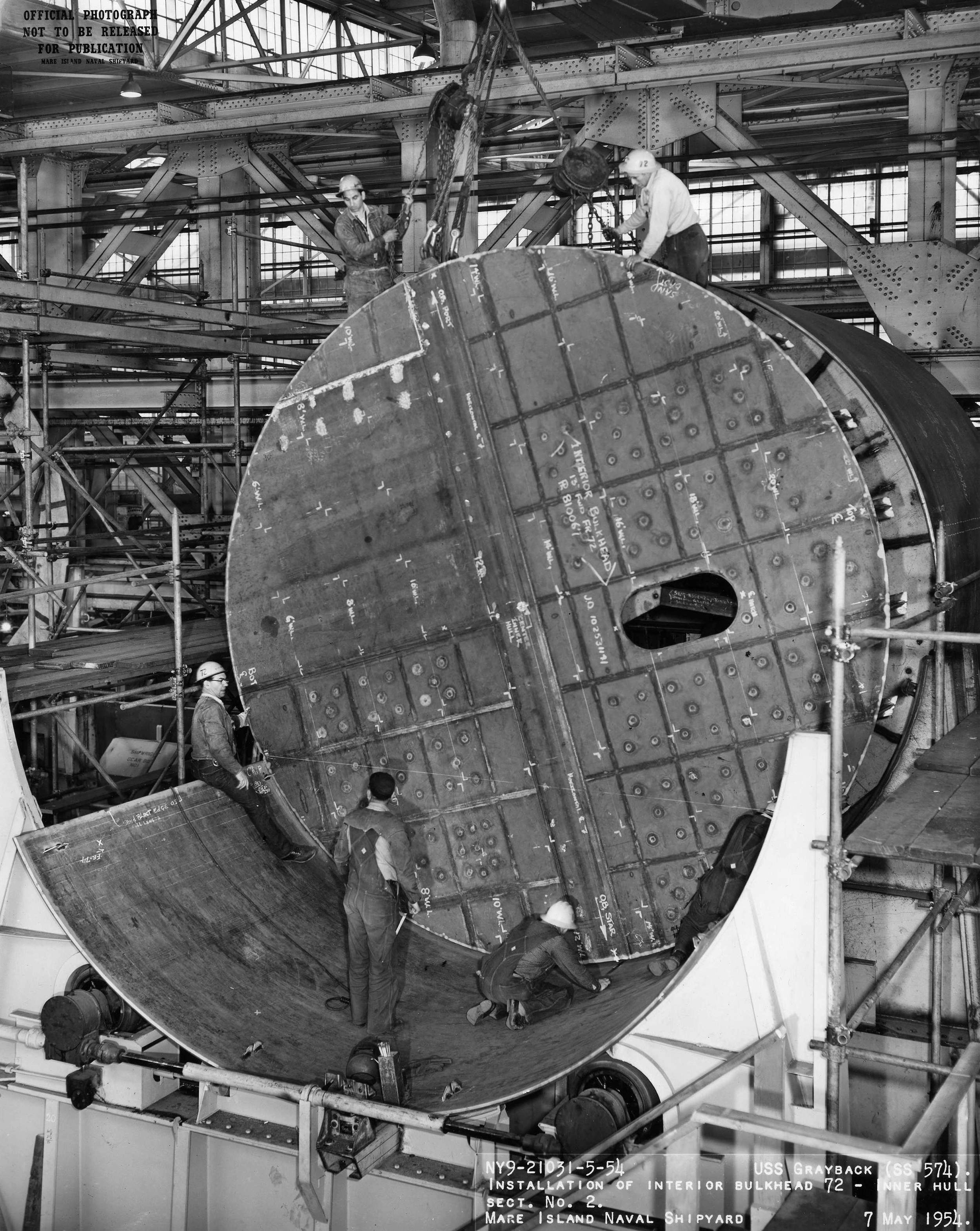 ![]() | 1.10k | Installation of interior bulkhead #72 – Inner hull section #2 on 7 May 1954. | USN photo # 21031-5-54, courtesy of Darryl L. Baker. | |