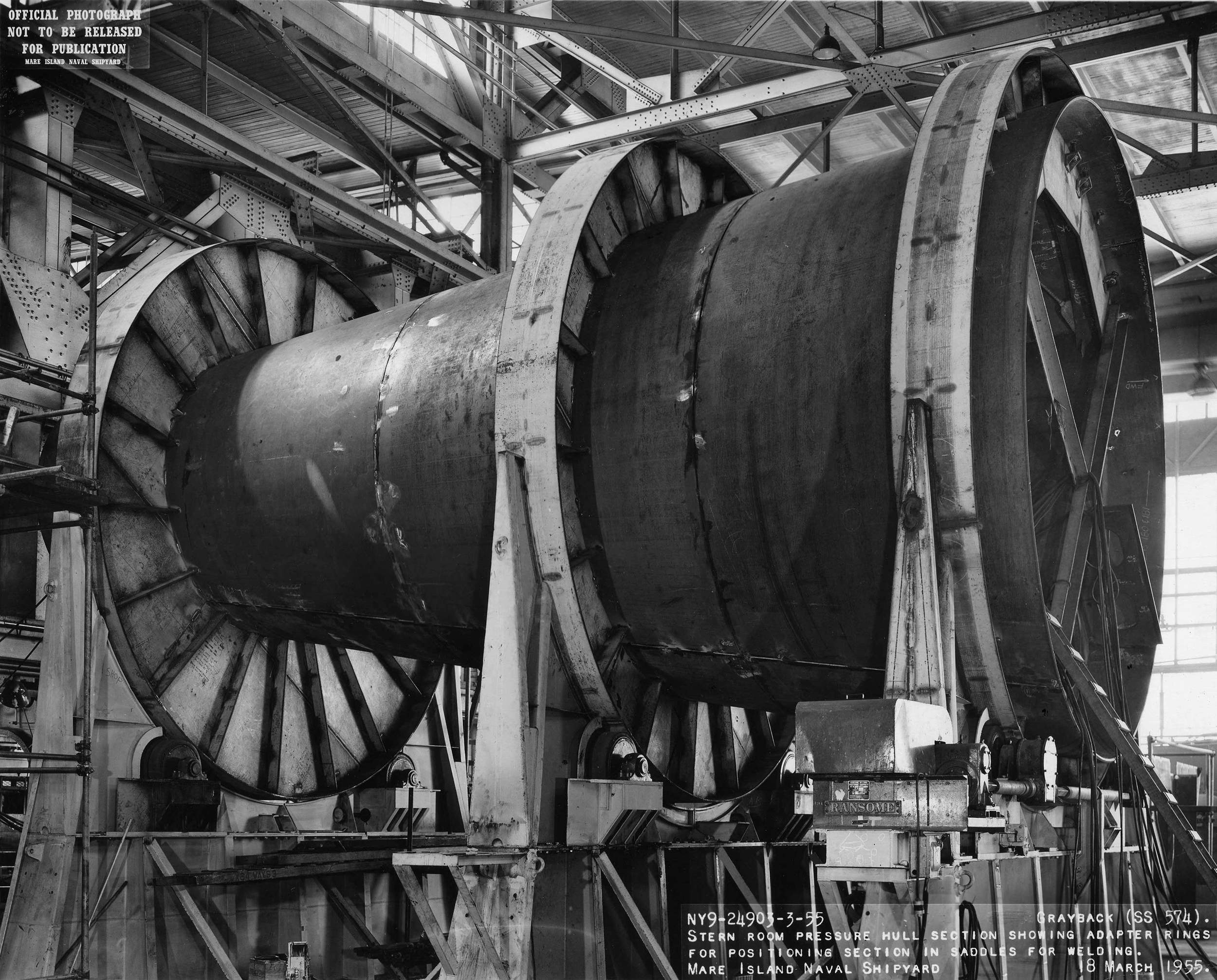 ![]() | 1.10k | Stern room pressure hull section showing adapter wings for positioning section in cradle for welding on 18 March 1955. | USN photo # 24903-3-55, courtesy of Darryl L. Baker. | |