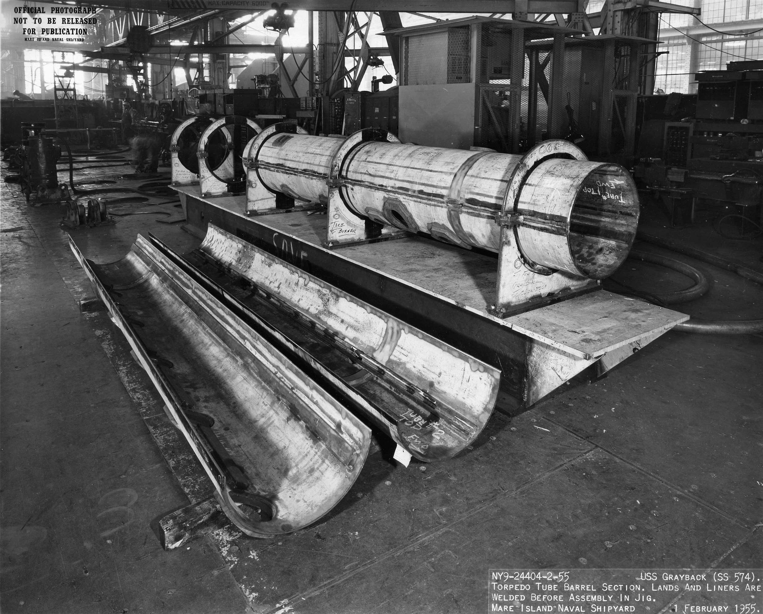 ![]() | 1.10k | Torpedo tube barrel section. Lands and liners are welded before assembly in jig on 1 February 1955. | USN photo # 24404-2-55, courtesy of Darryl L. Baker. | |