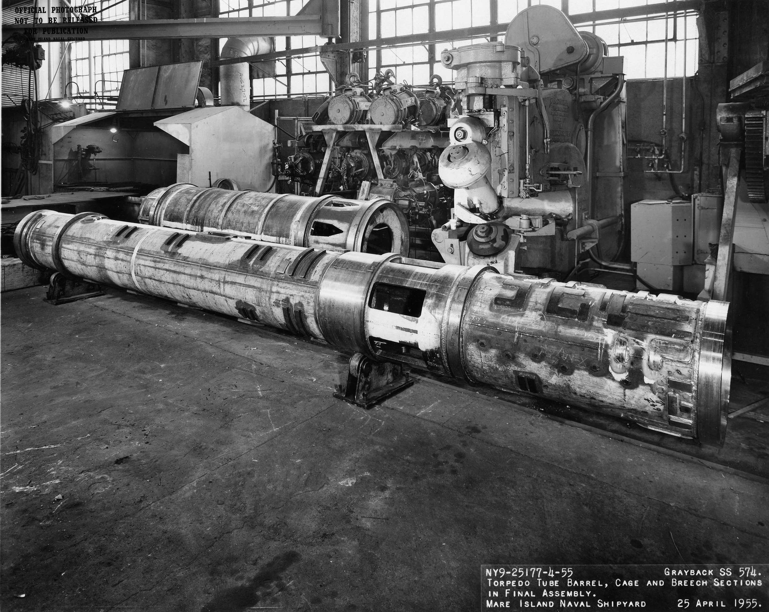 ![]() | 1.20k | Torpedo tube barrel, cage and breech sections in final assembly on 25 April 1955. | USN photo # 25177-4-55, courtesy of Darryl L. Baker. | |