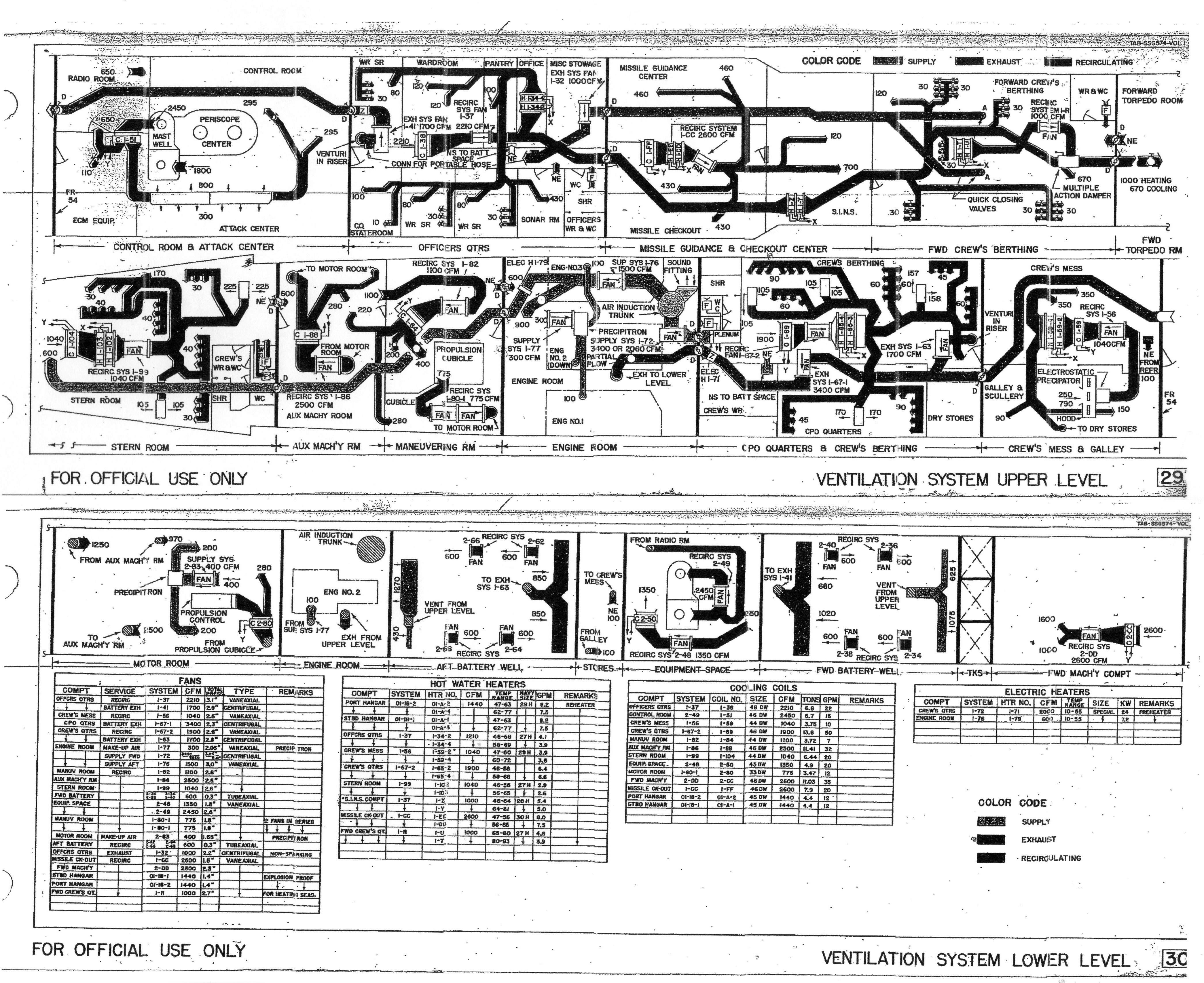 ![]() 0857423 | 1.94k | Ventilation System 1958 for Grayback (SSG-574). This was a converted Tang/Darter class sketch. The Grayback was about 80% ready for launching when the yard cut off her bow and installed the missile hangers. | USN photo courtesy of Darryl L. Baker. | |