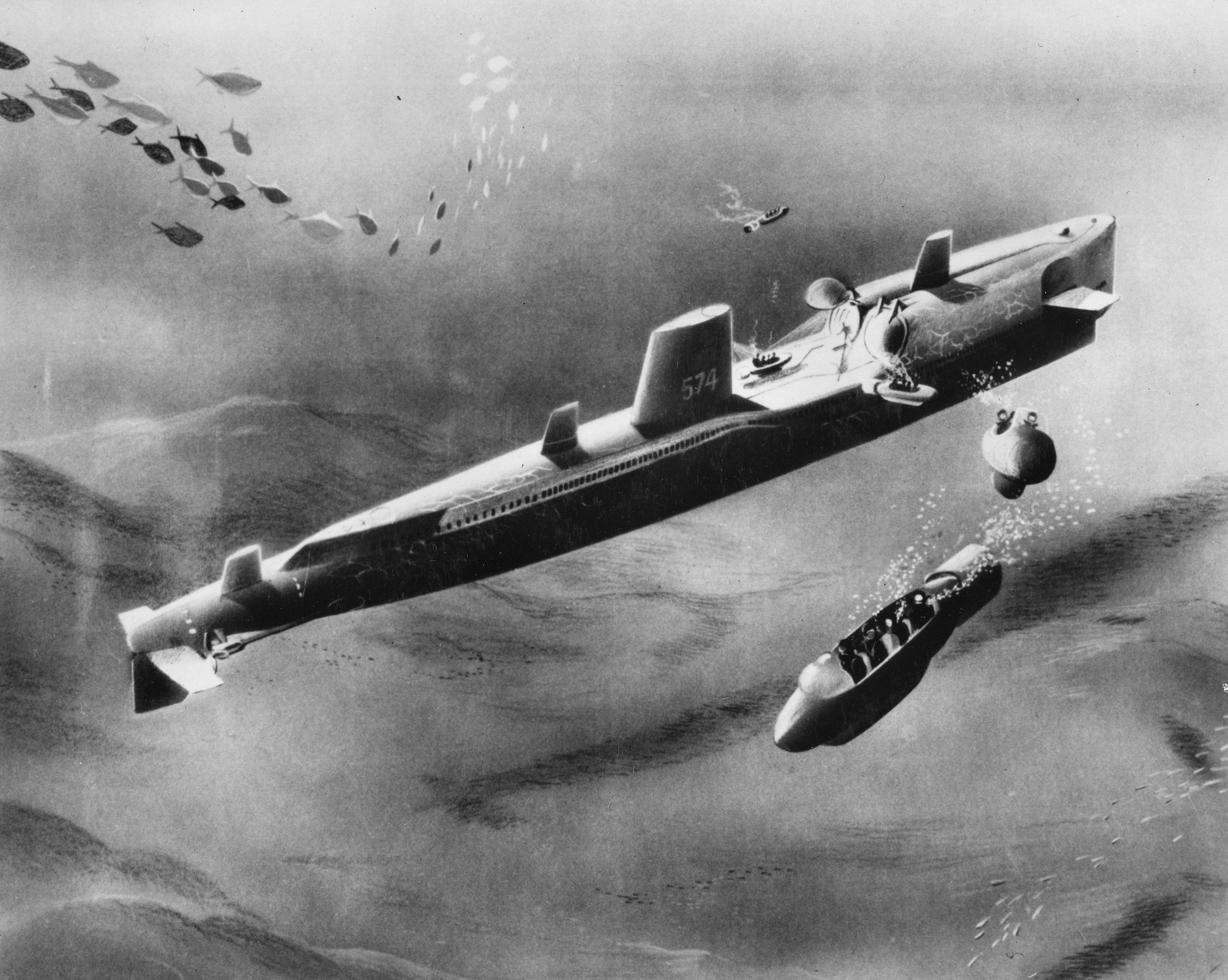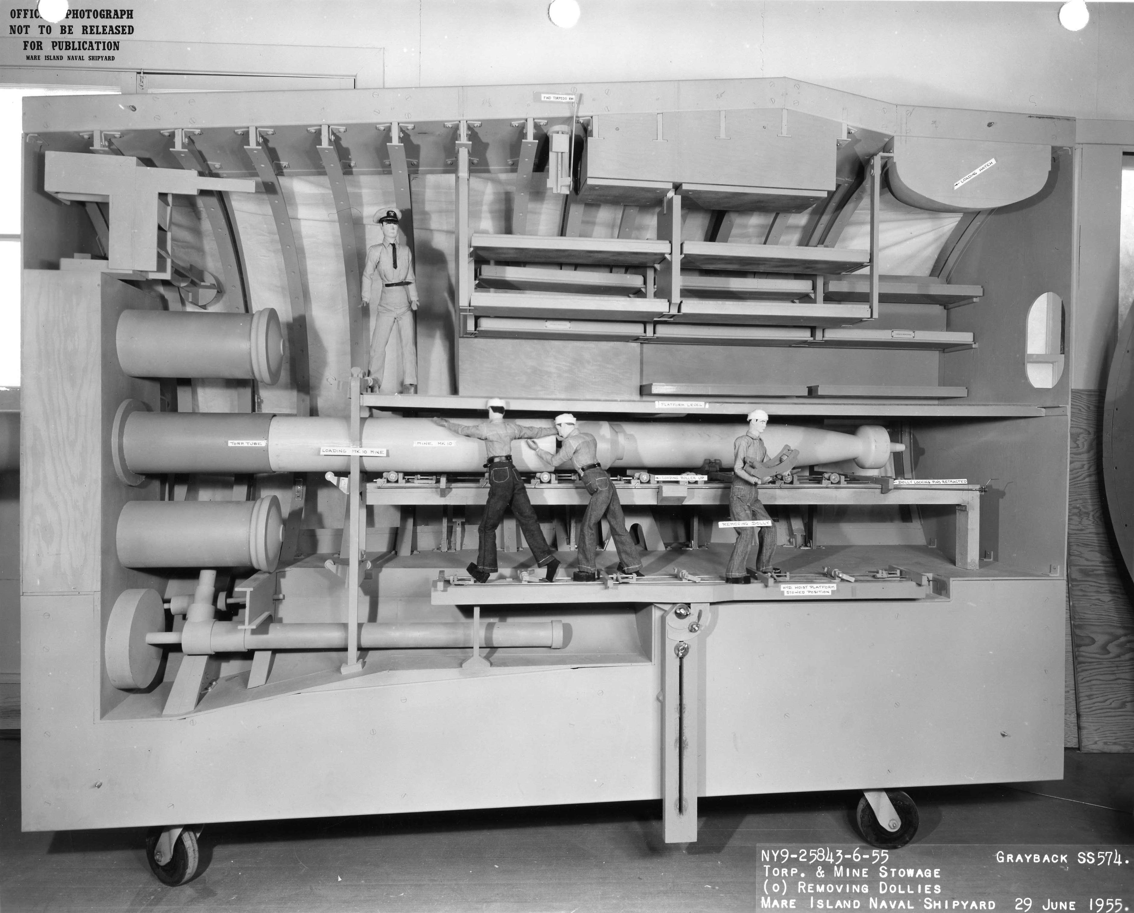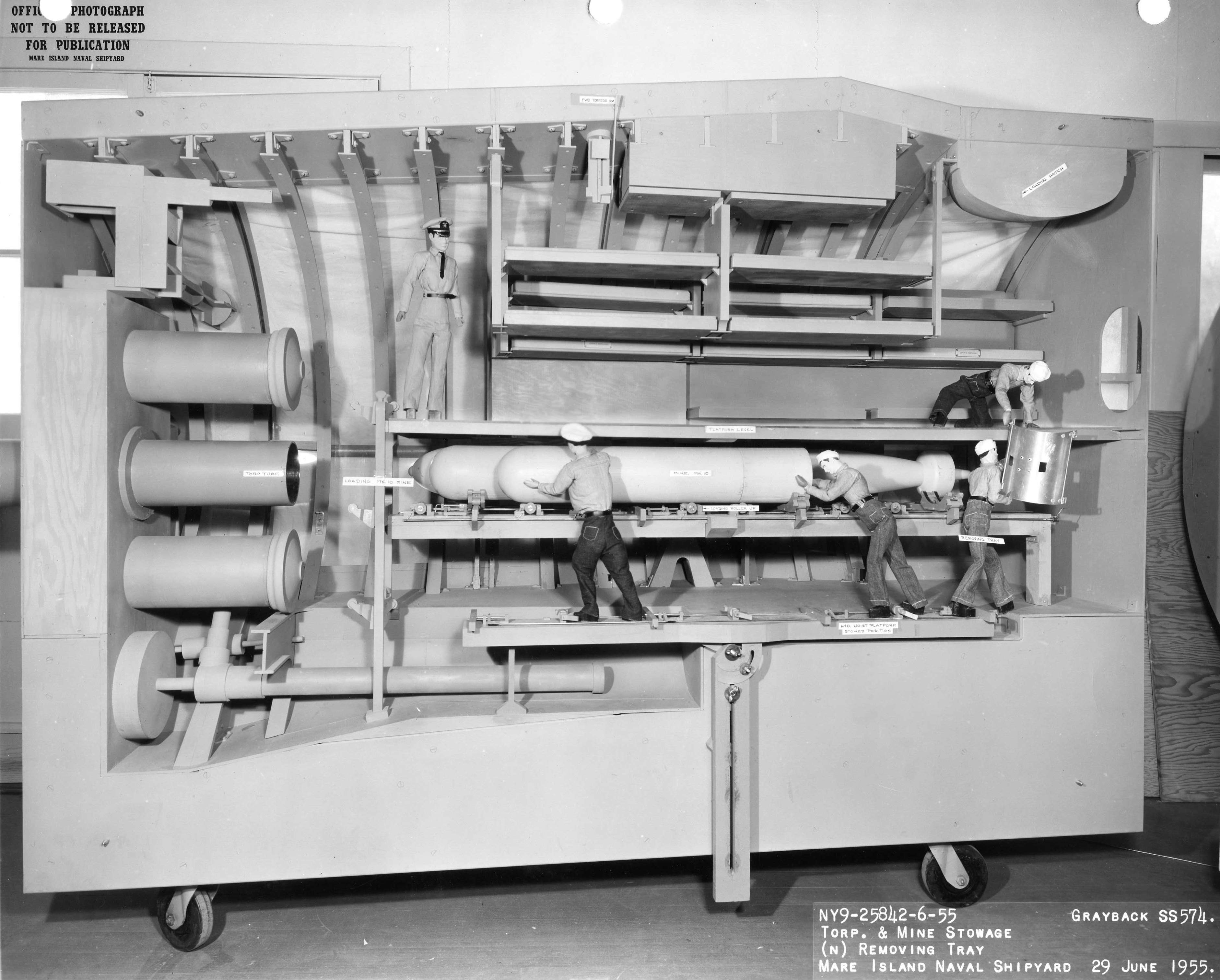 ![]() | 683k | Mk-10 Mine is seen being handling in the forward torpedo room mock-up of Mare Island's SS configuration mock-up of Grayback (SSG-574). | U.S. Navy / Mare Island Photo # 25842-6-55, courtesy of Darryl L. Baker. | |