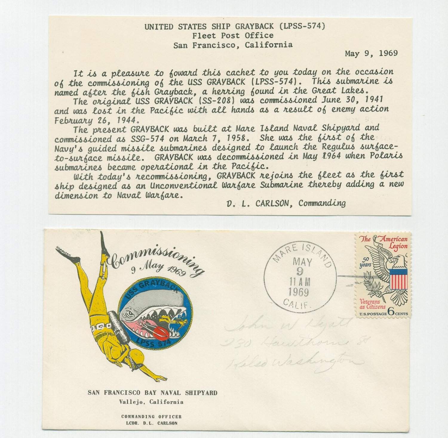 ![]() | 200k | First day issue of Grayback (LPSS-574) recommissioning at Mare Island Naval Shipyard on 9 May 1969. | Courtesy of John Hyatt. | |