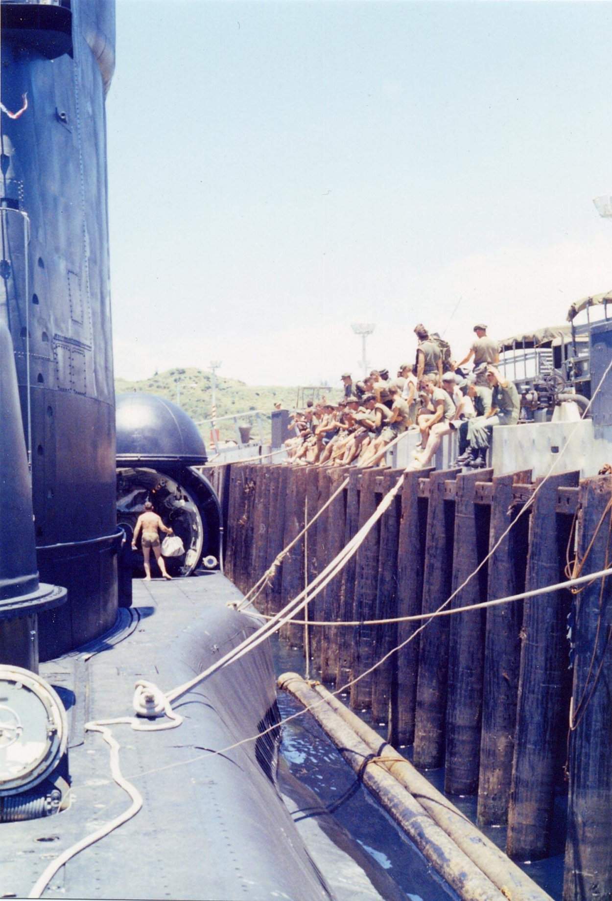 ![]() | 200k | Grayback (LPSS-574) at Subic Bay, Philippines in 1970 before underway ops. SEAL's on pier. Right side of submarine = open hanger doors & ships diver. | Courtesy of John Hyatt. | |