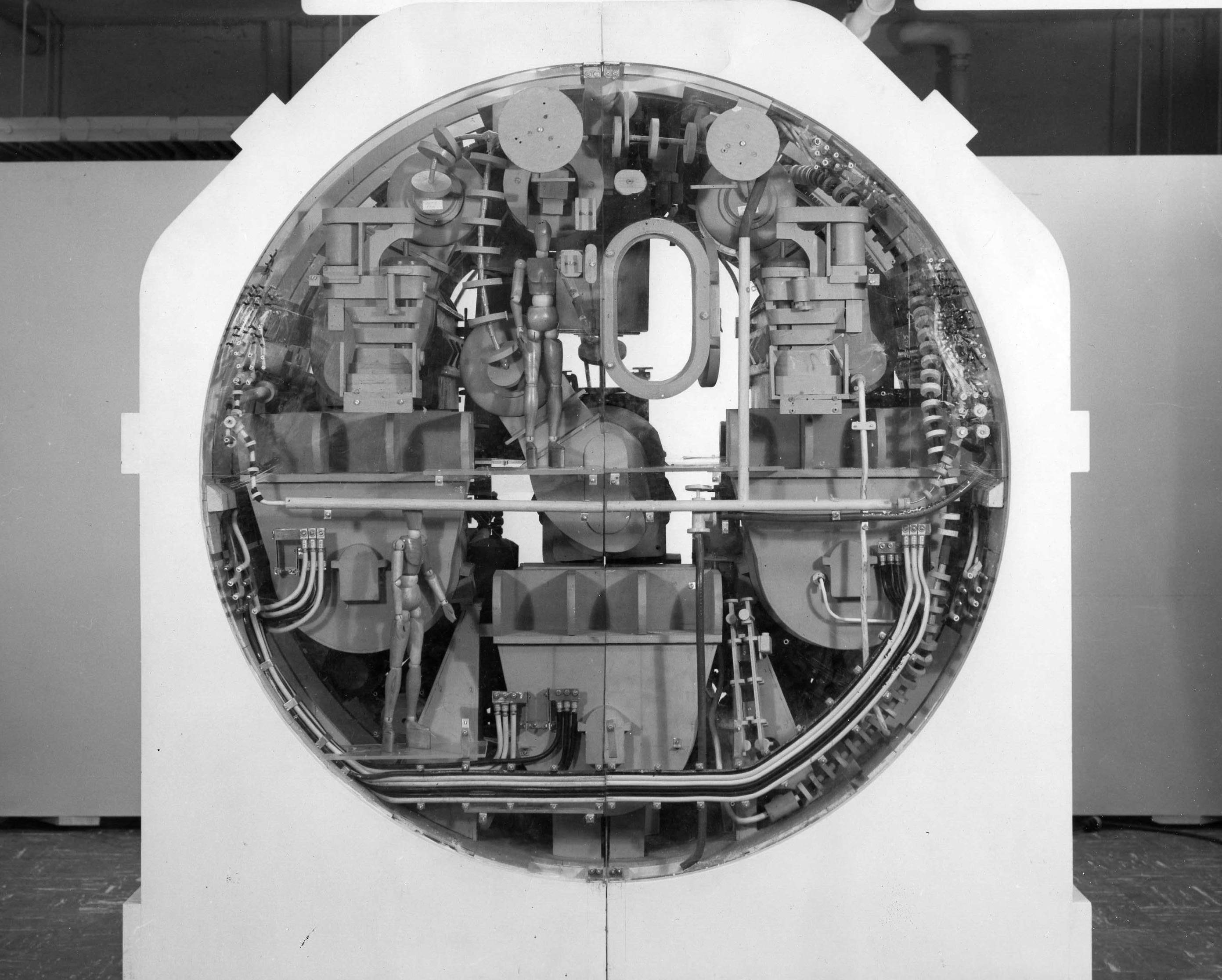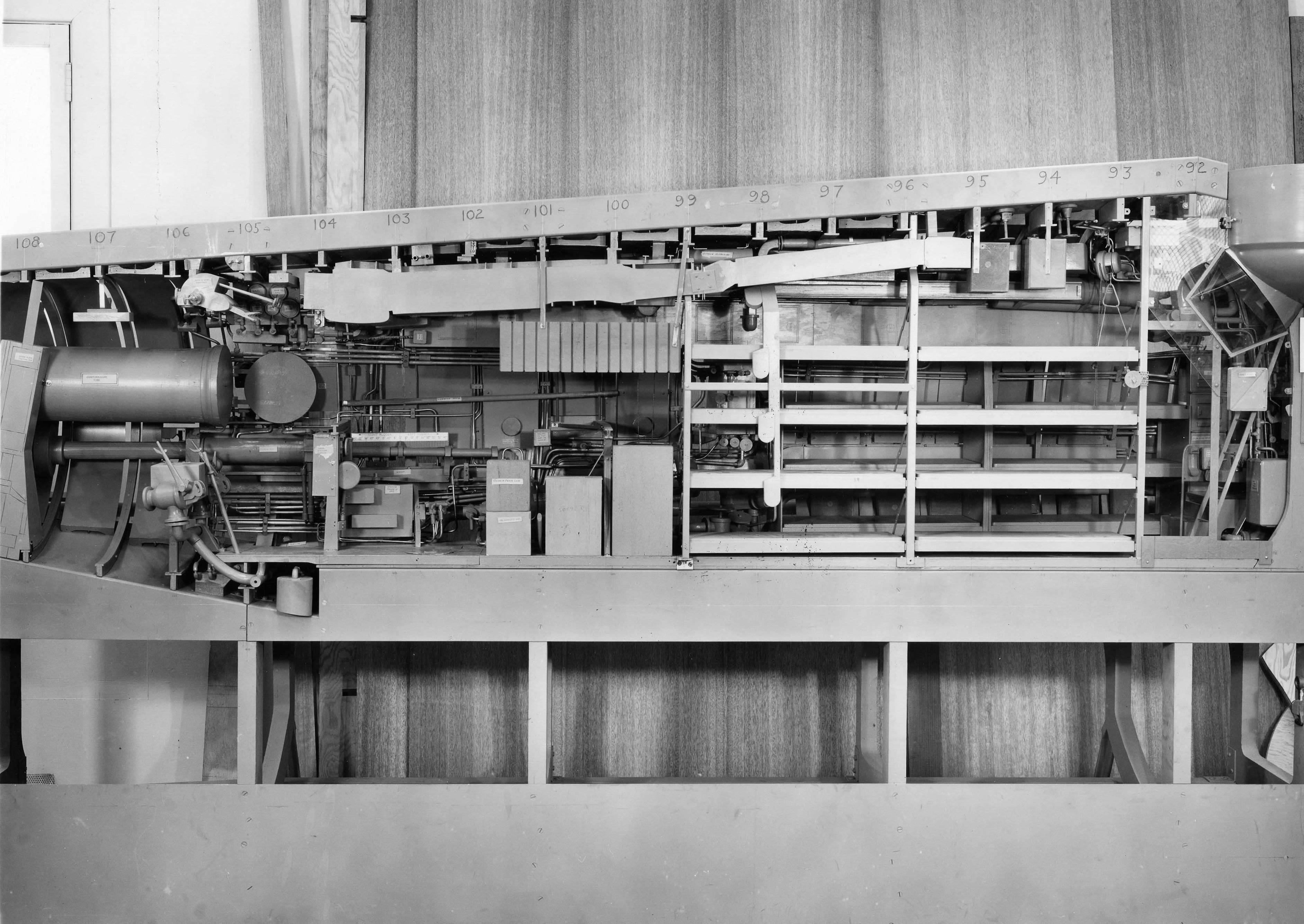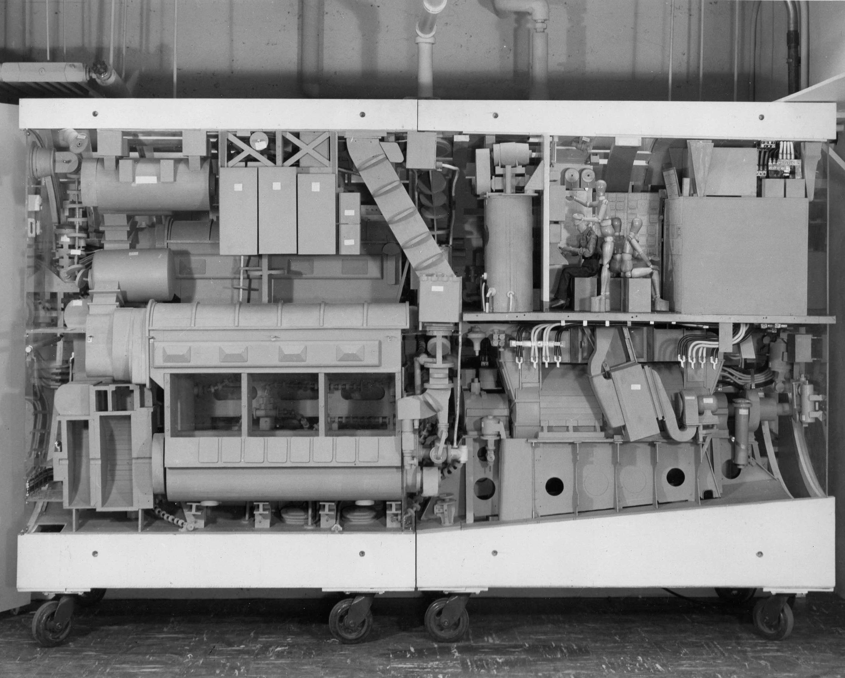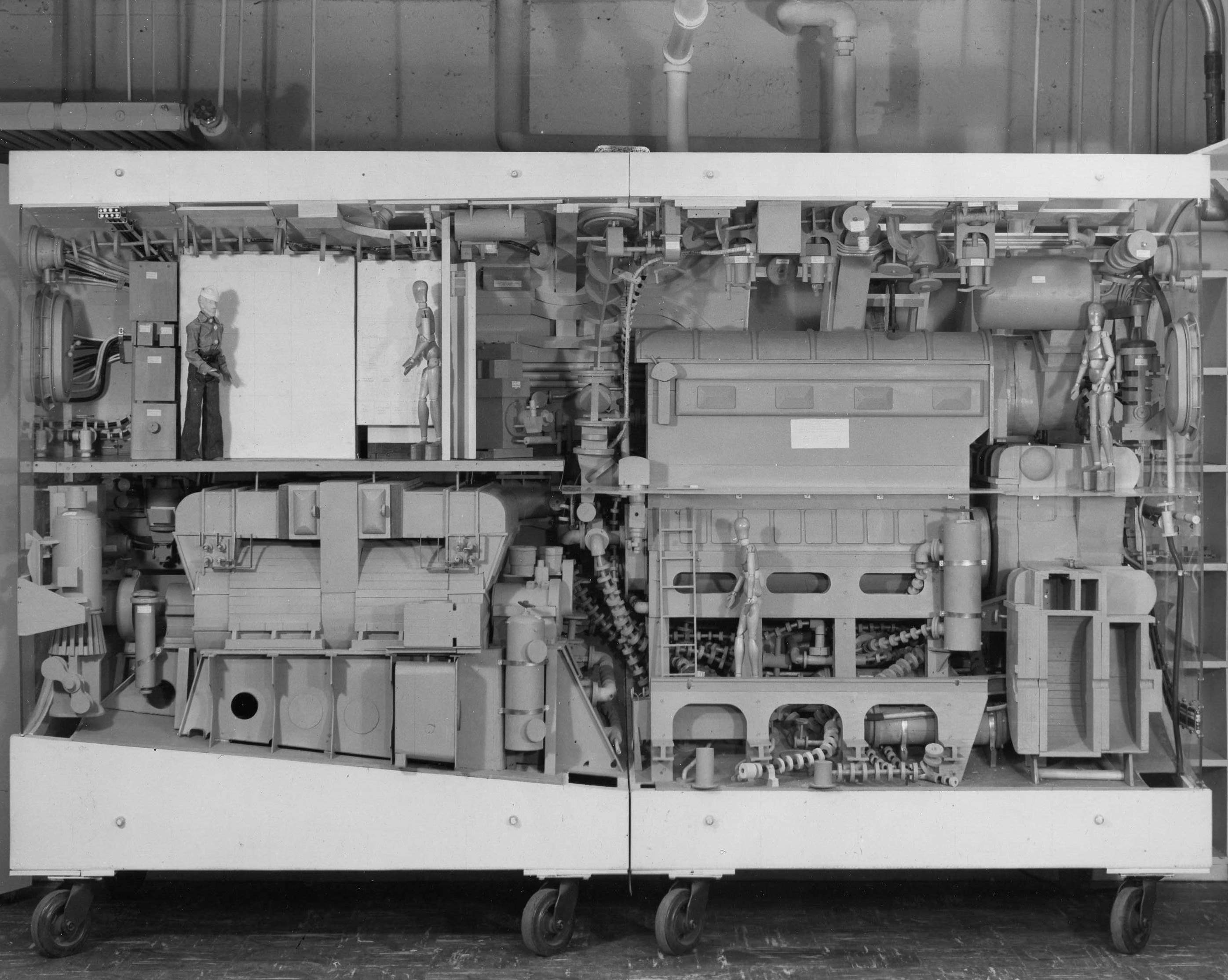 ![]() | 472k | Port side view of engine room of Grayback (SSG-574) 1/4 scale mock-up, circa 1953-54. | USN photo courtesy of Darryl L. Baker. | |