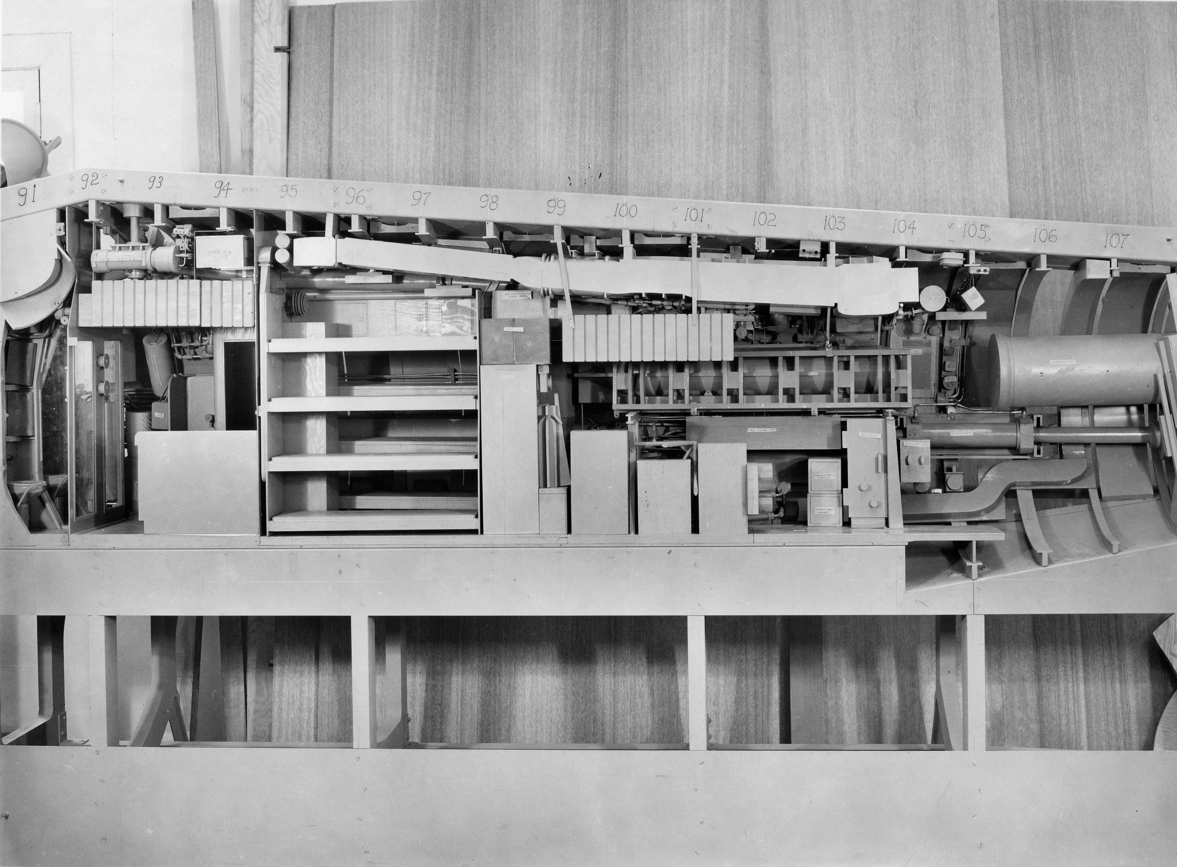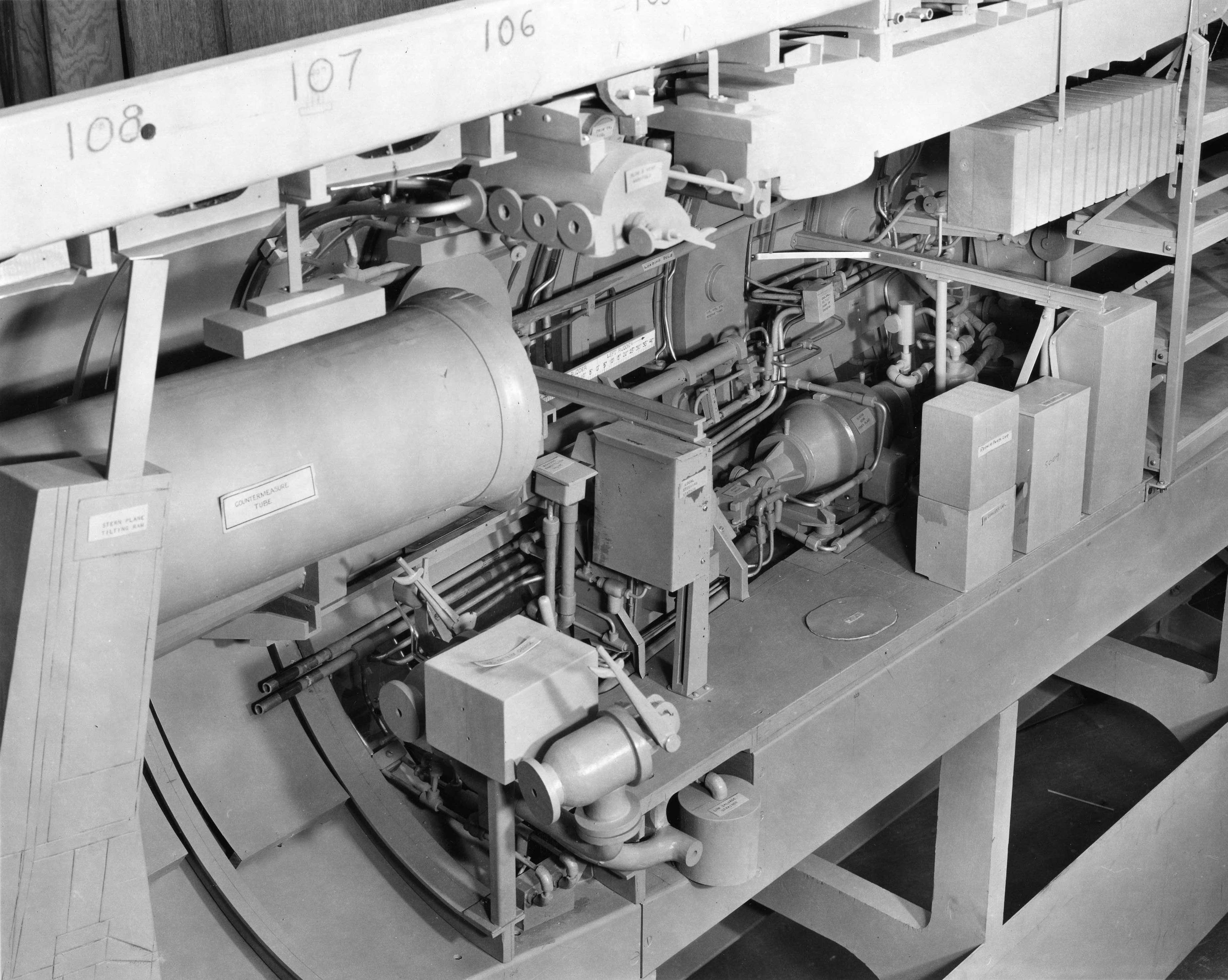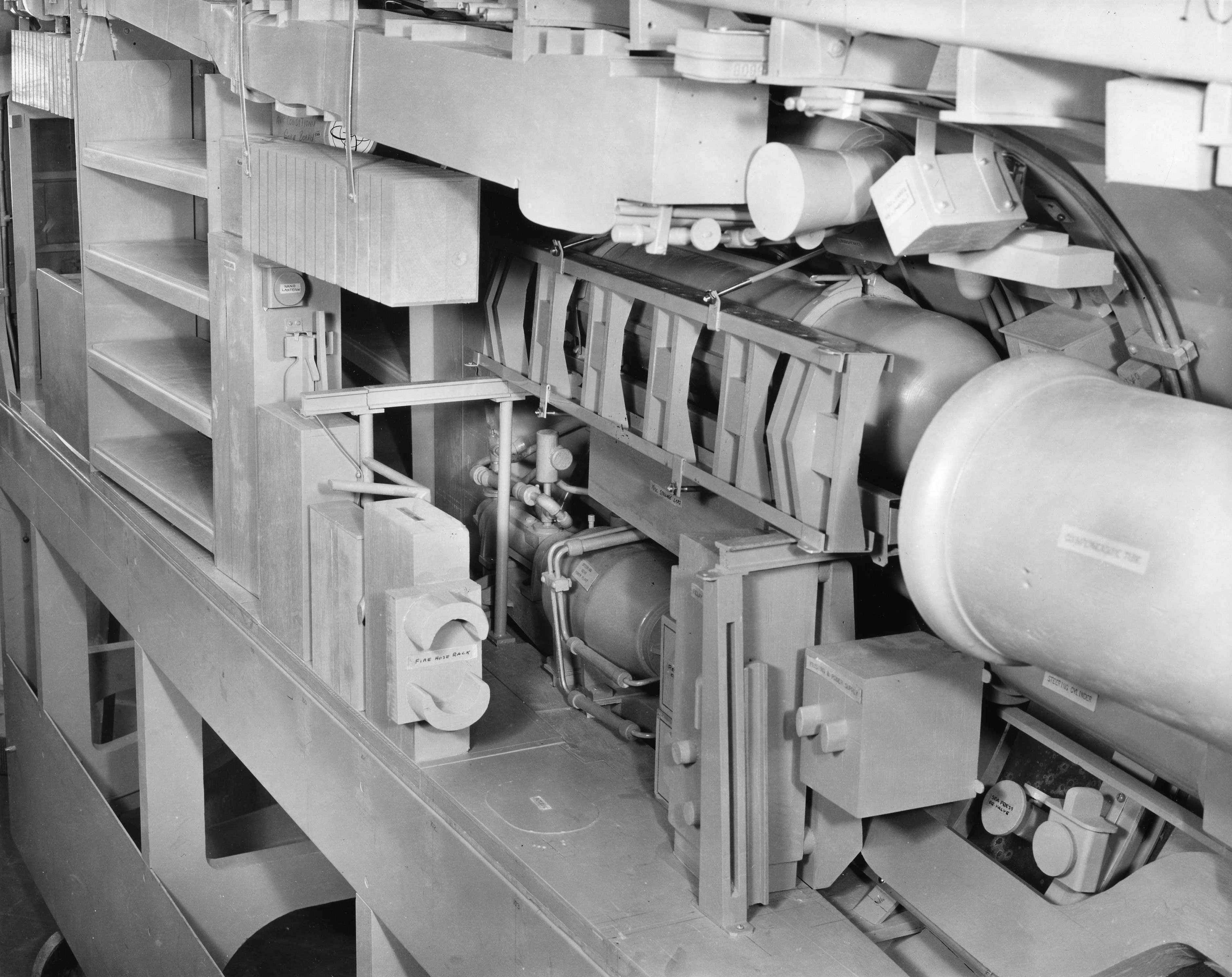 ![]() | 11.8k | 31 photo PDF 1/4 scale mock-up of the Grayback (SSG-574) circa 1953-54. The photos from this point down to the Construction section are in PDF format. Cross section view of engine room. | USN photo courtesy of Darryl L. Baker. | |