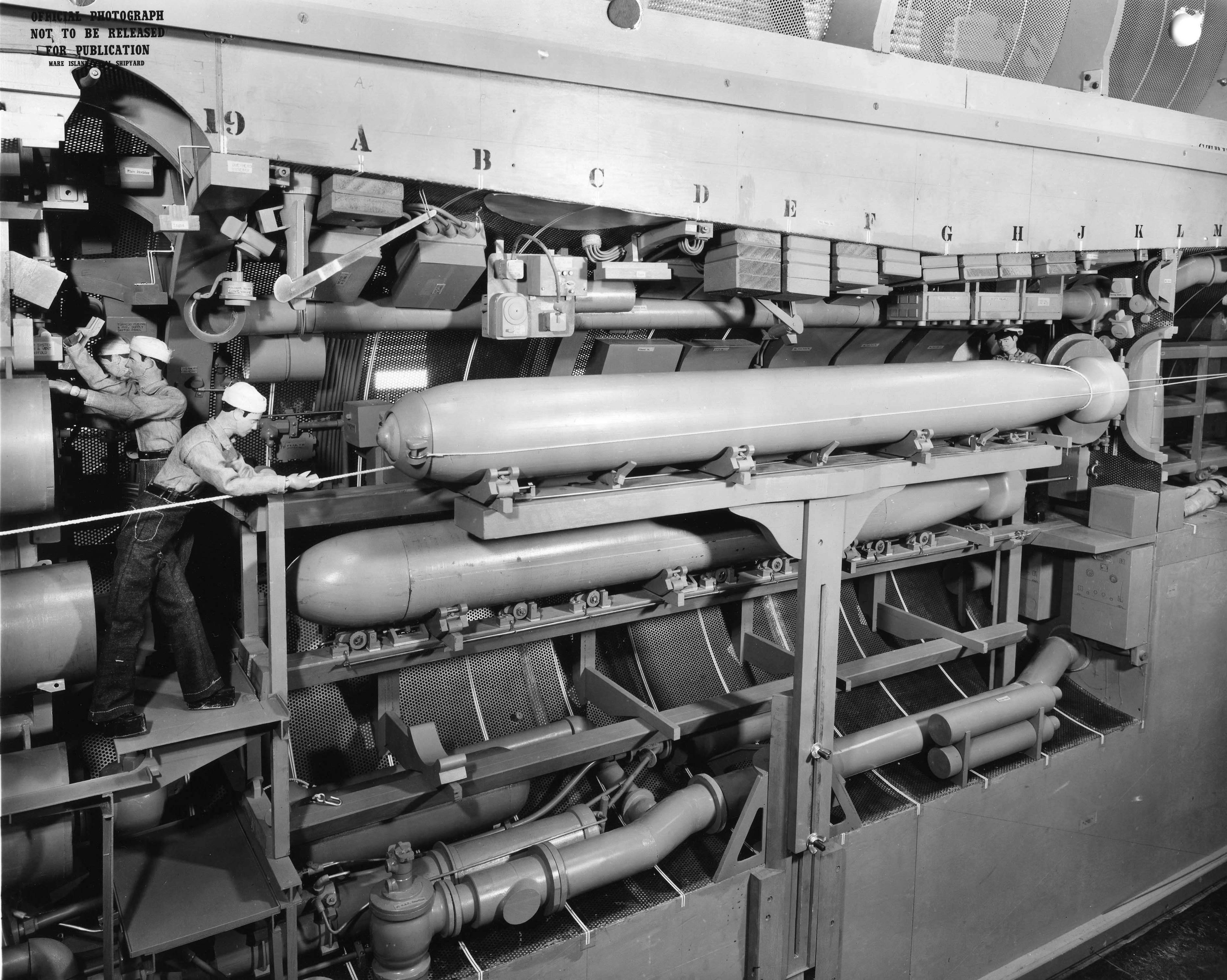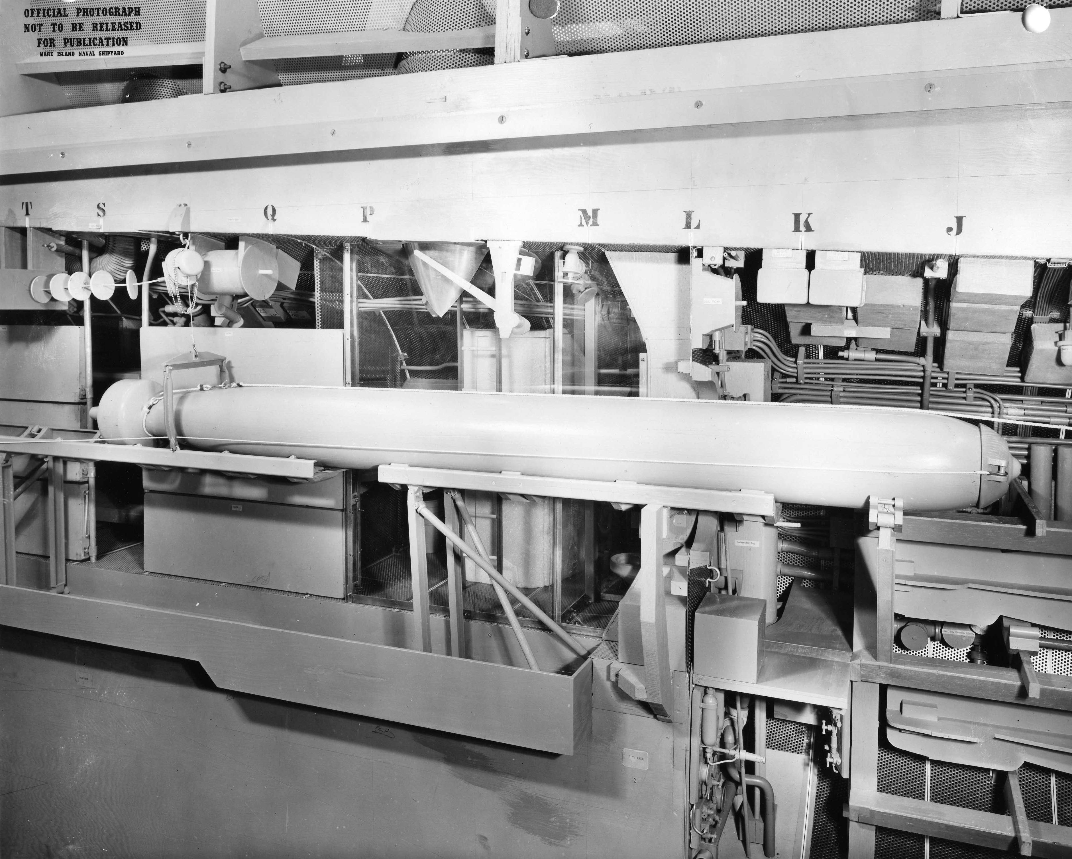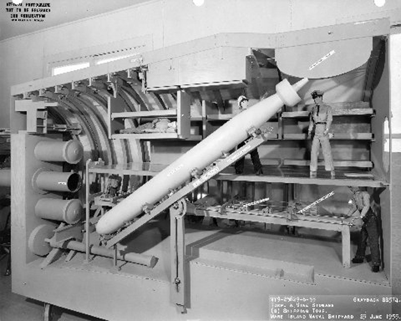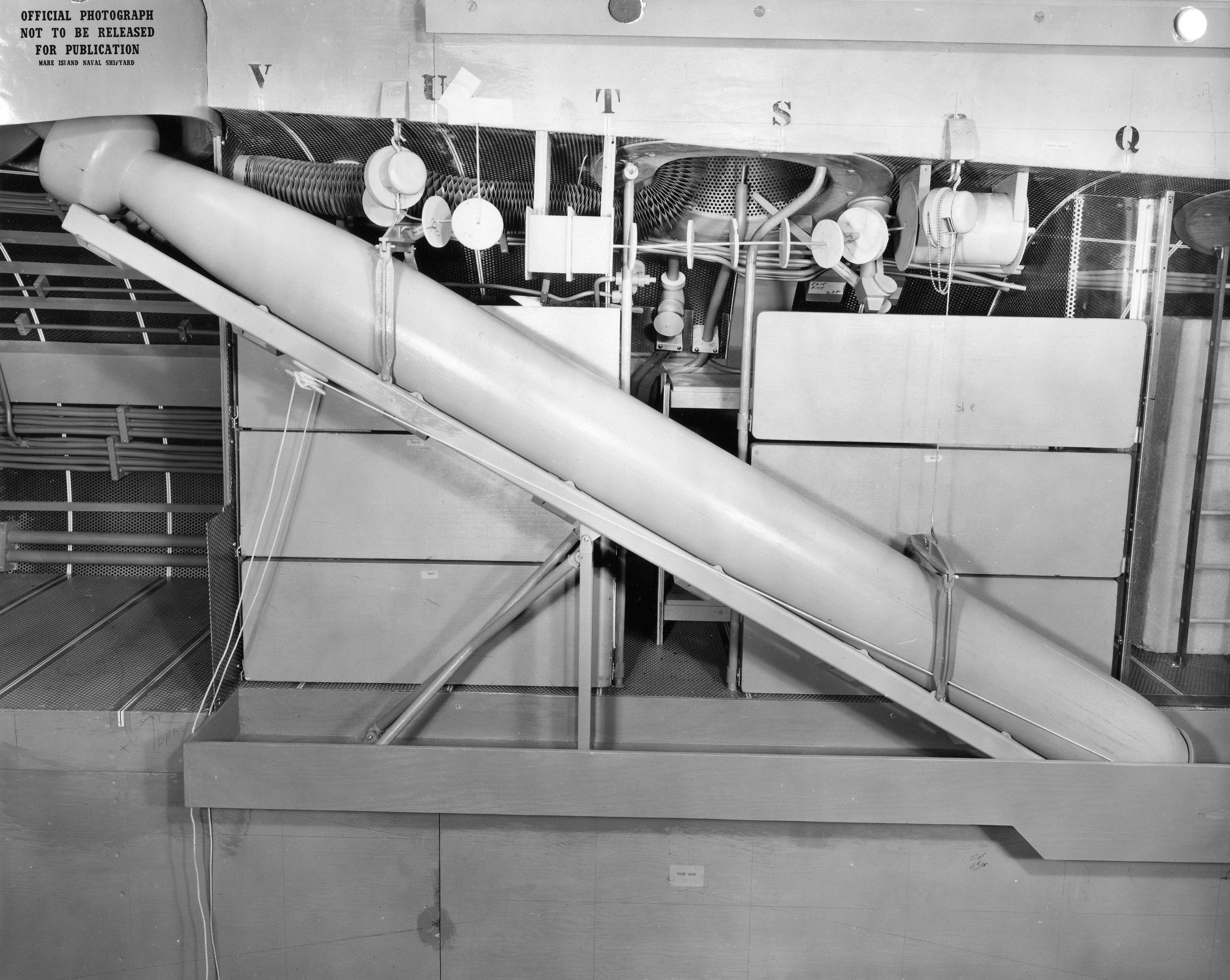 ![]() | 1.20k | Mk-16 torpedo is seen being loaded into the forward torpedo room mock-up of Mare Island's SSG configuration mock-up of Grayback (SSG-574). | U.S. Navy / Mare Island Photo # 32227-11-56, courtesy of Darryl L. Baker. | |