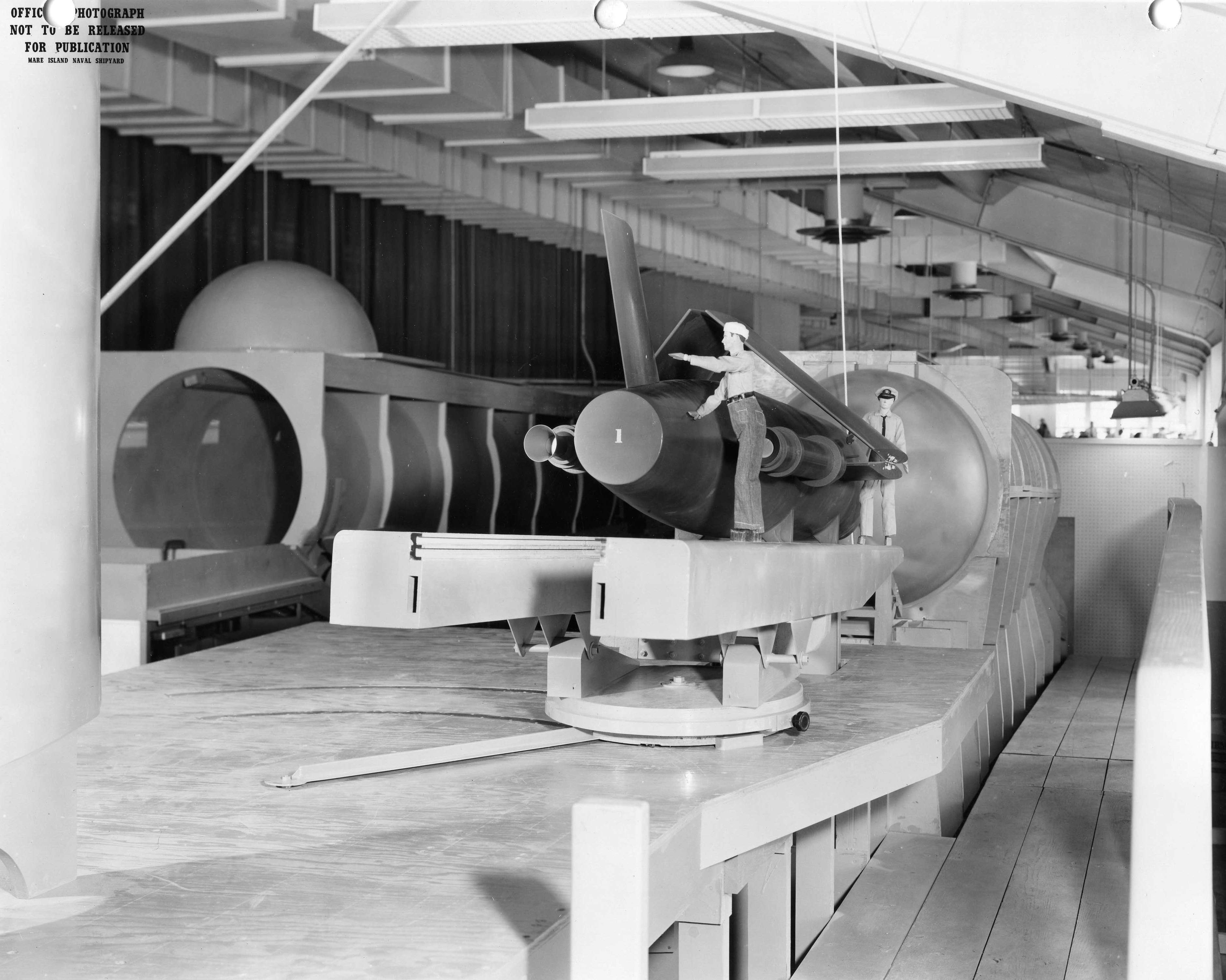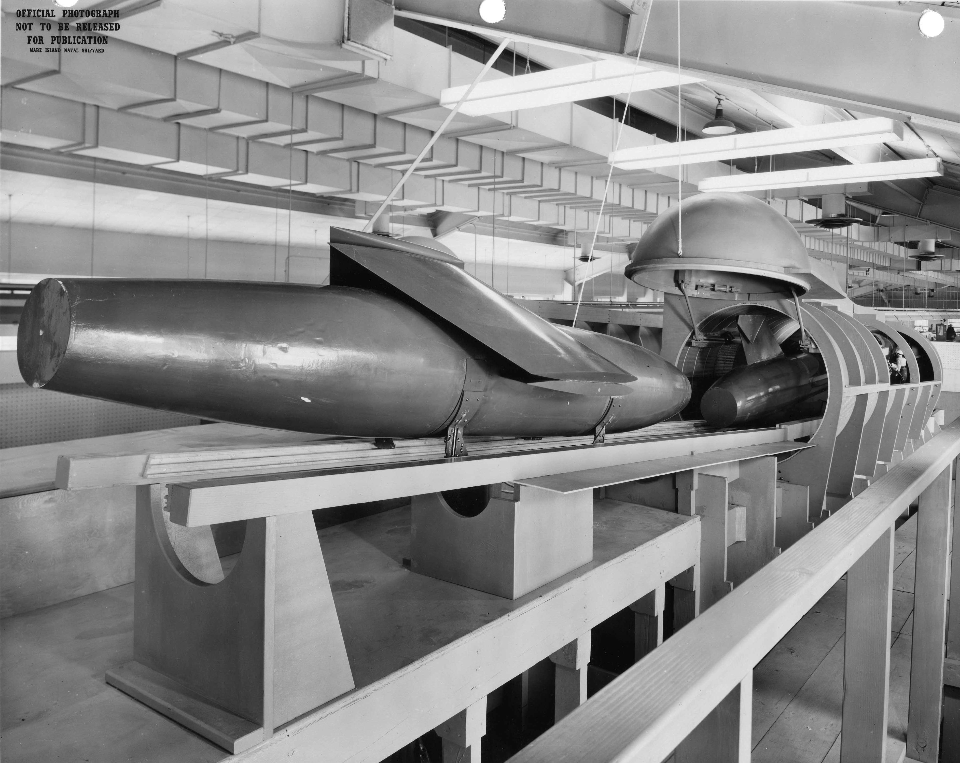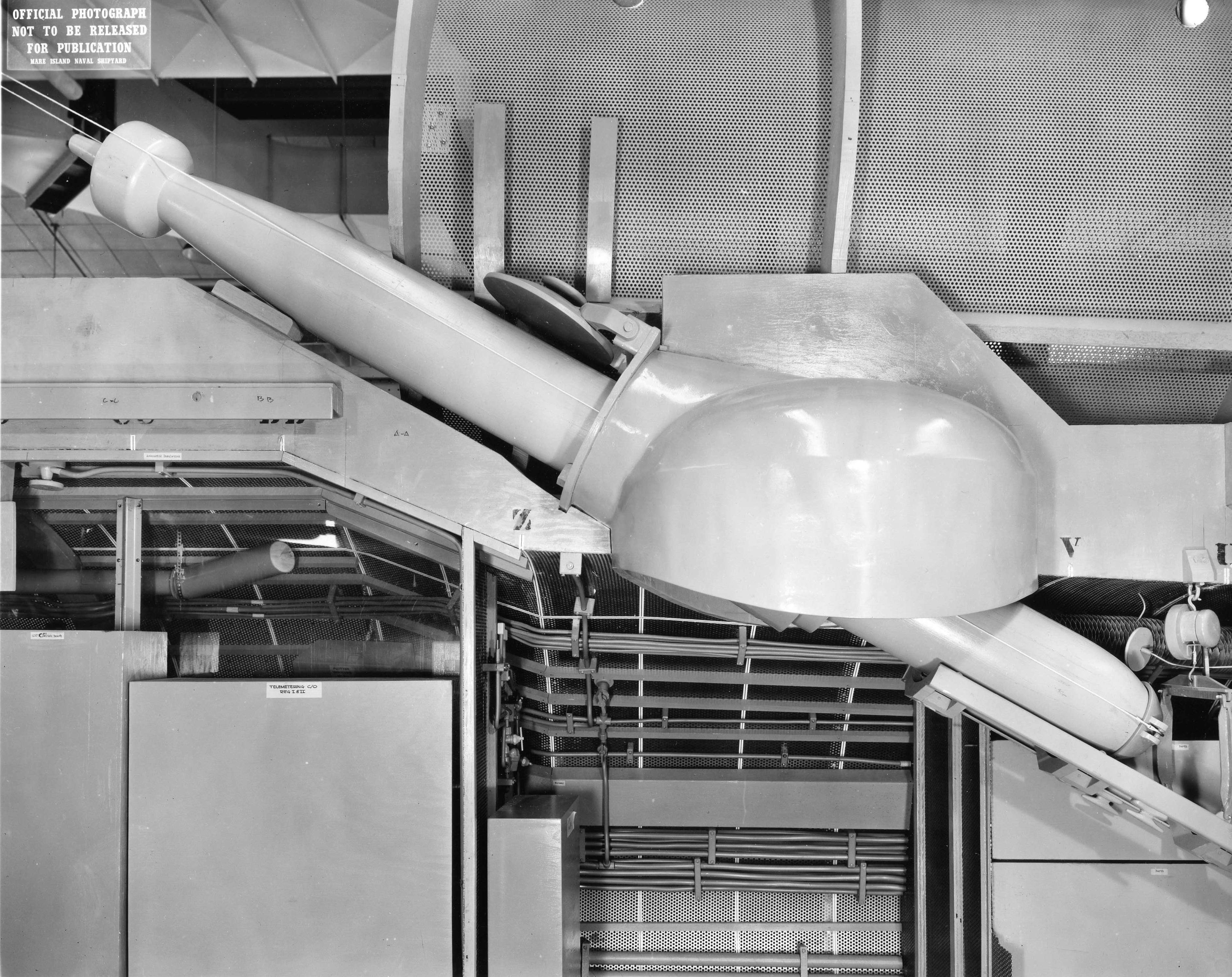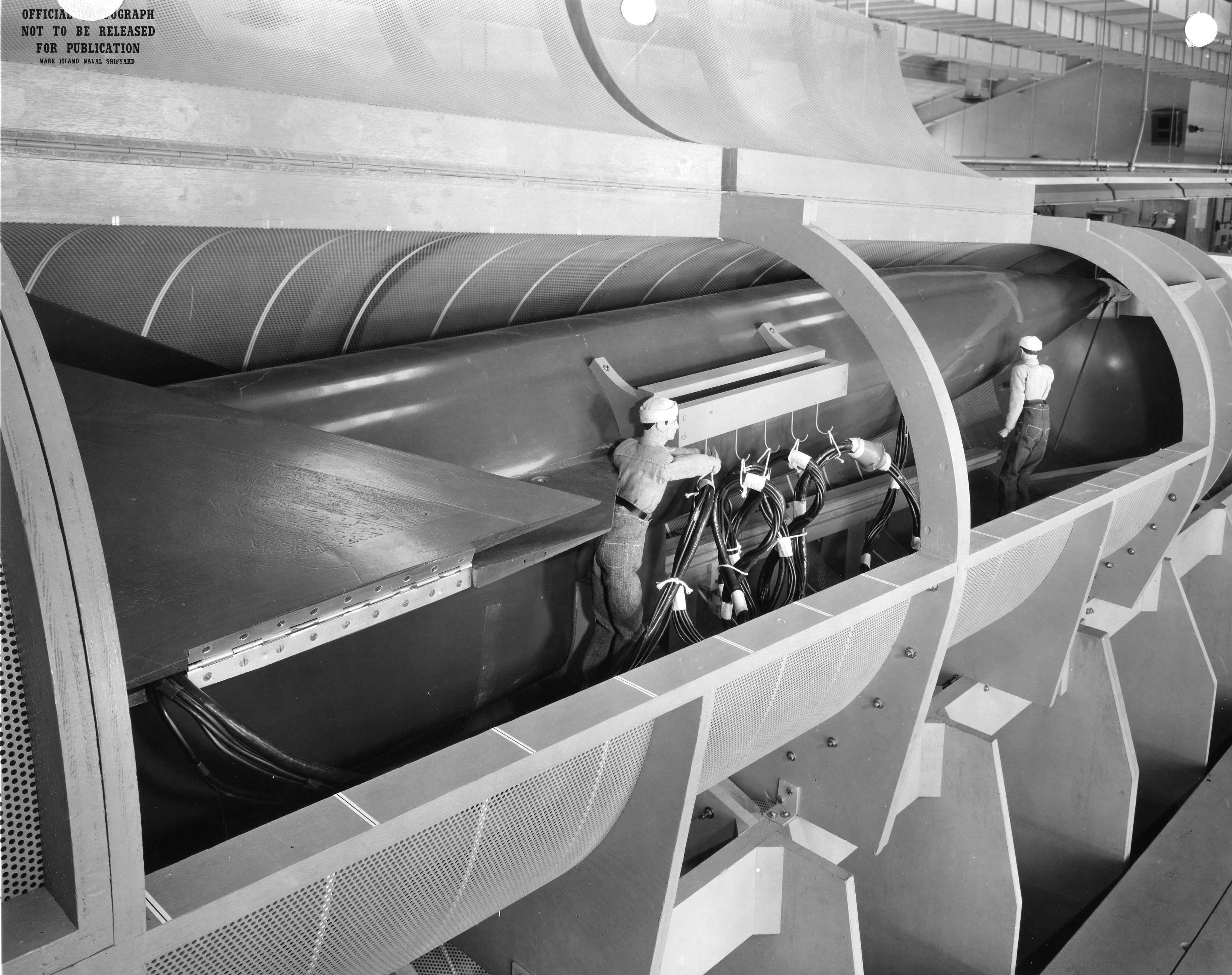 ![]() | 1.20k | Mk-16 torpedo is seen being loaded into the forward torpedo room mock-up of Mare Island's SSG configuration mock-up of Grayback (SSG-574). | U.S. Navy / Mare Island Photo # 32227-11-56, courtesy of Darryl L. Baker. | |