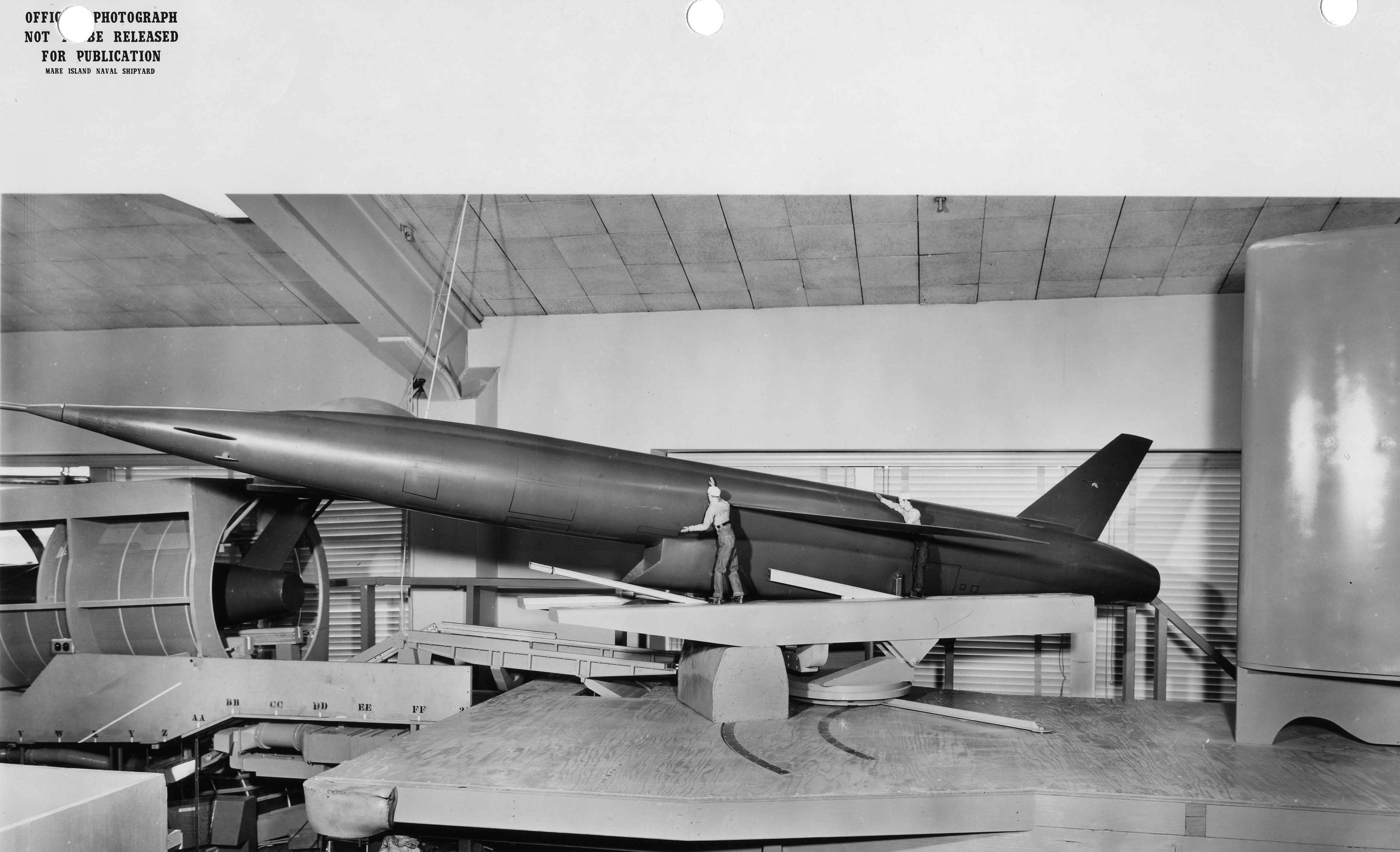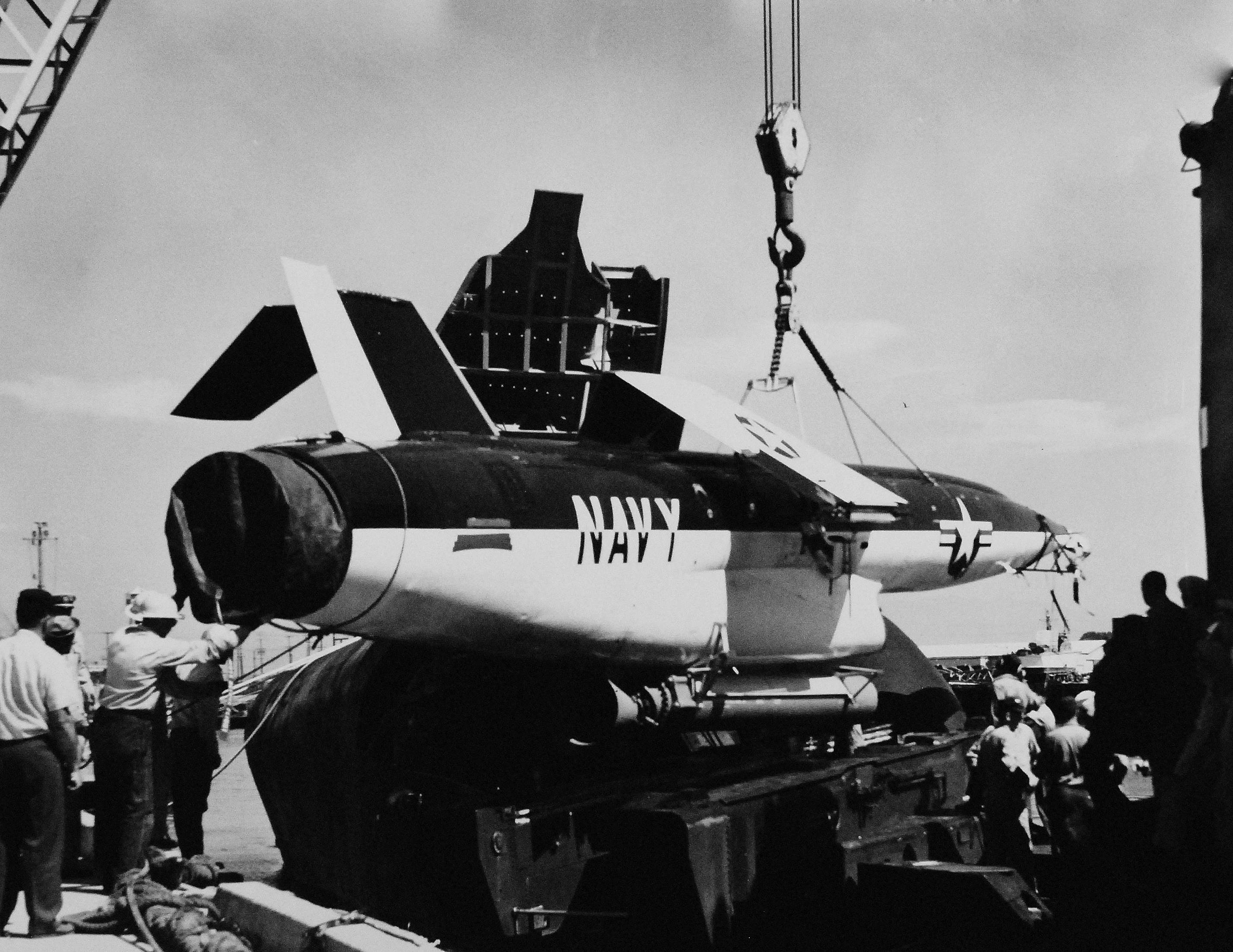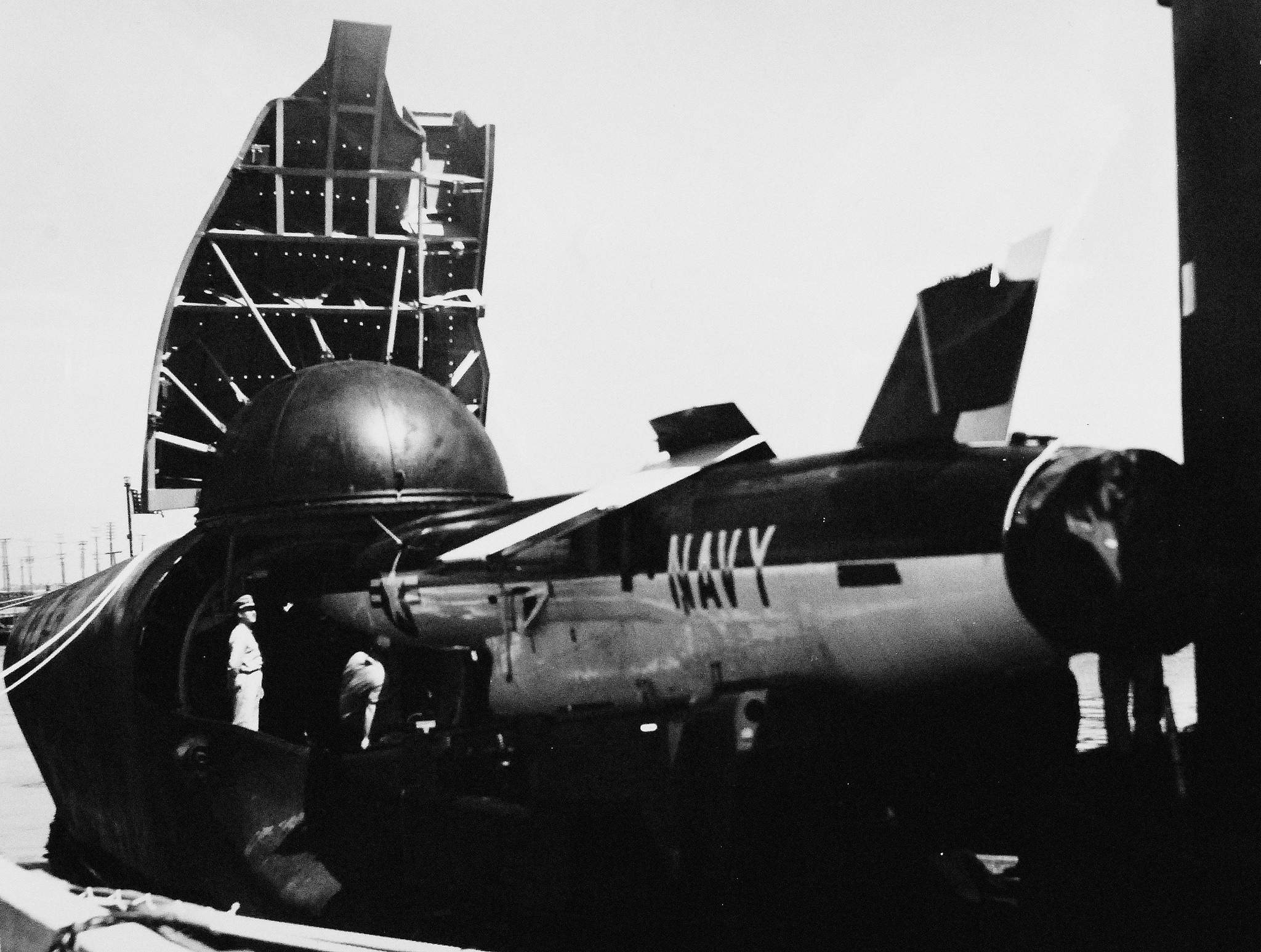 ![]() | 1.94k | The first Regulus II Missile to be fired from a submarine is moved into its hangar on deck of Grayback (SSG-574) in preparation for firing. The missile, built by Chance Vought aircraft, was fired from sea to Edwards Air Force Base, California. In the first test of its capability of being fired from submarines at sea against inland targets, Regulus II was flown some 200 miles. Its wings and rudder can be folded to facilitate its storage in the submarine hangar. A supersonic missile, the Regulus II flies at speeds greater than Mach 2. | USN photo # USN 710241, courtesy of the National Museum of the U.S. Navy, via flickr.com. | |