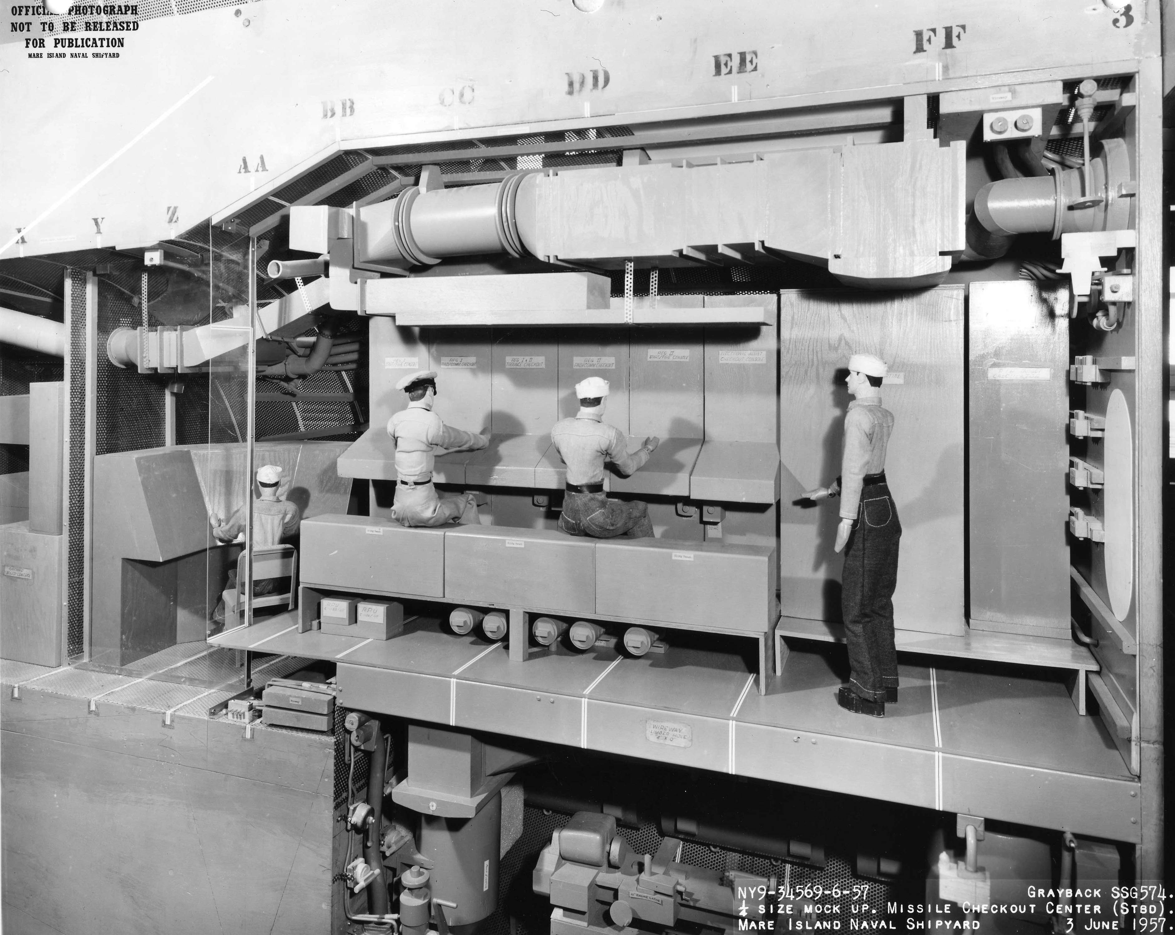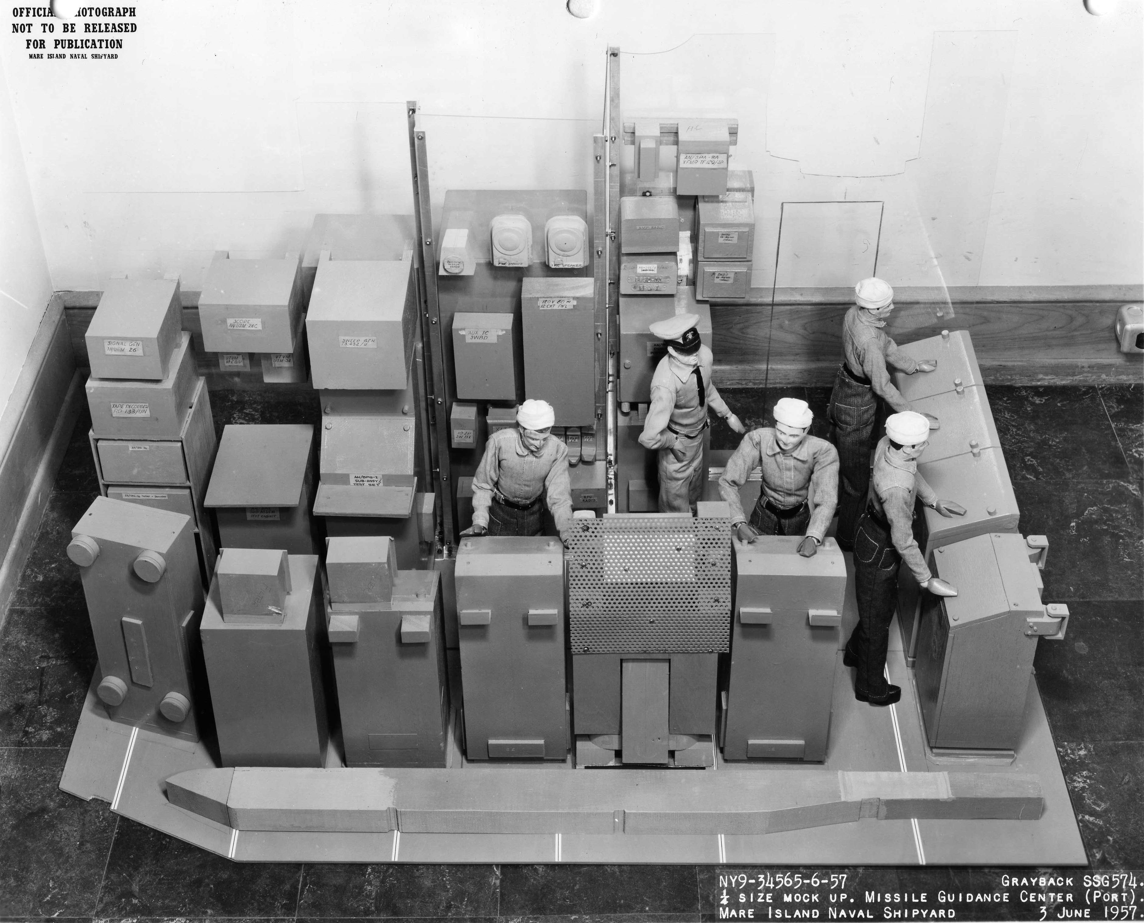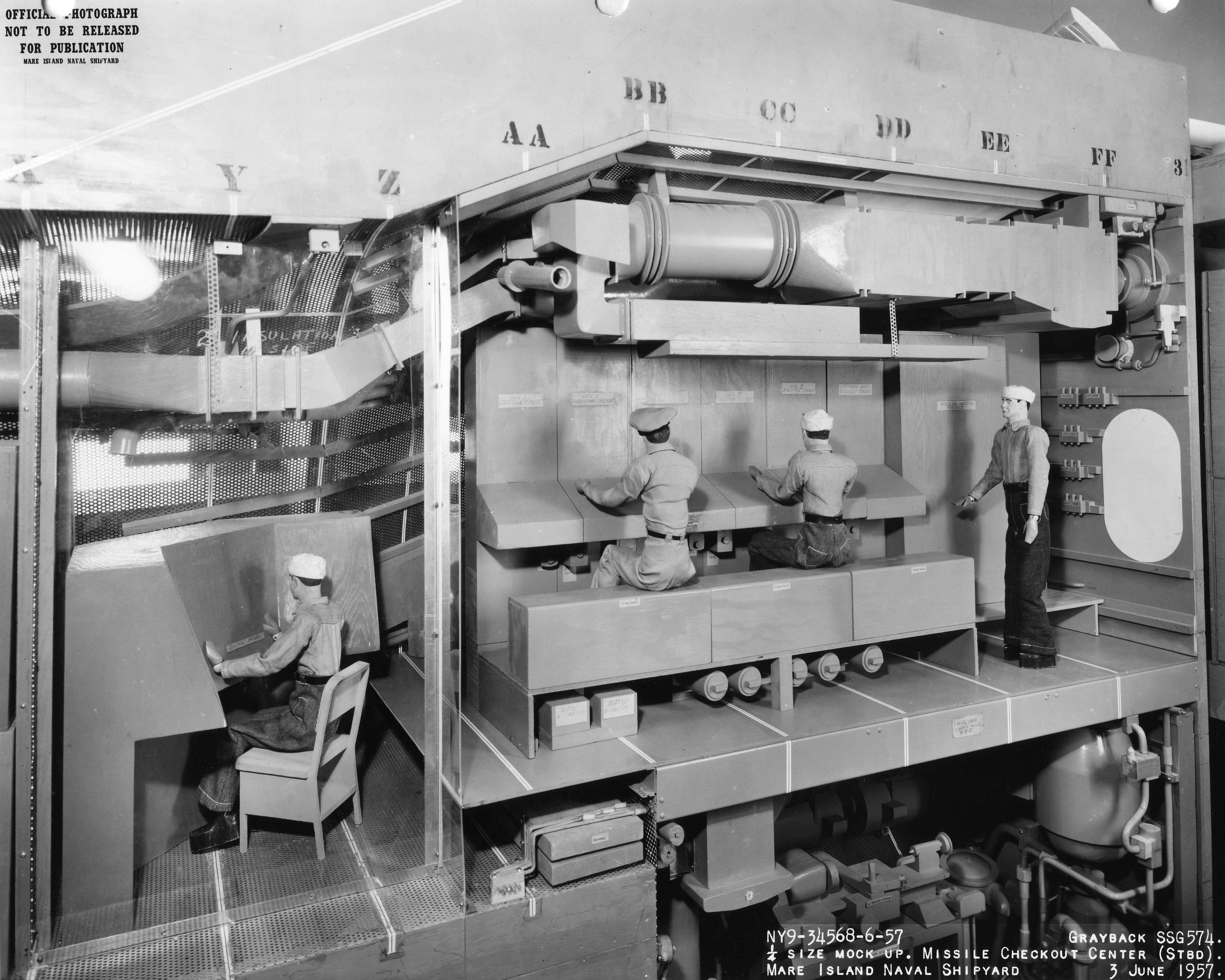 ![]() | 852k | 1/4 Size mockup of the missile checkout center aboard Grayback (SSG-574) taken at Mare Island in 3 June 1957. | USN photo # 34568-6-57, courtesy of Darryl L. Baker. | |