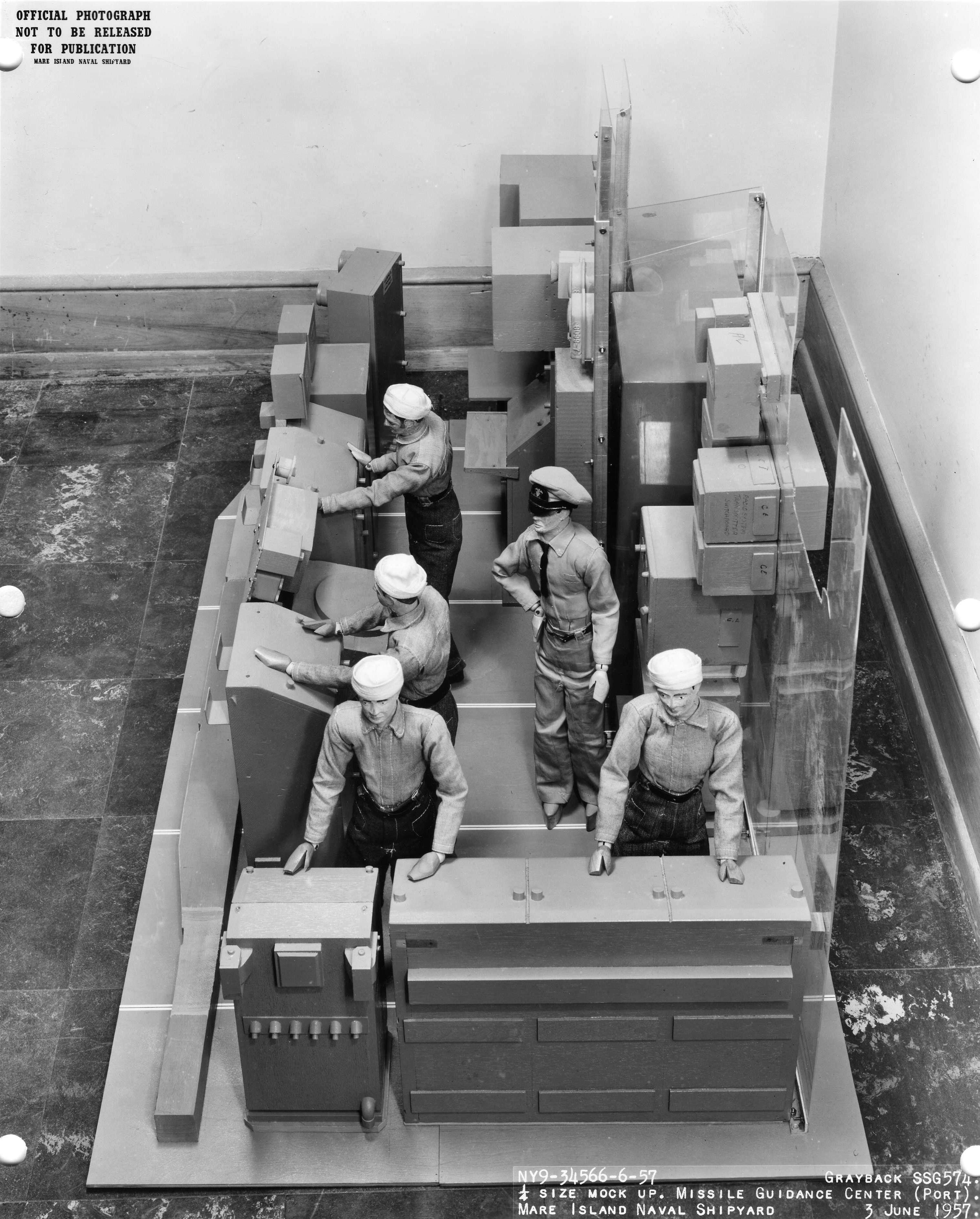 ![]() | 934k | 1/4 Size mock up of the missile guidance center arrangement for Grayback (SSG-574) taken at Mare Island in June 1957. | USN photo # 34566-6-57, courtesy of Darryl L. Baker. | |