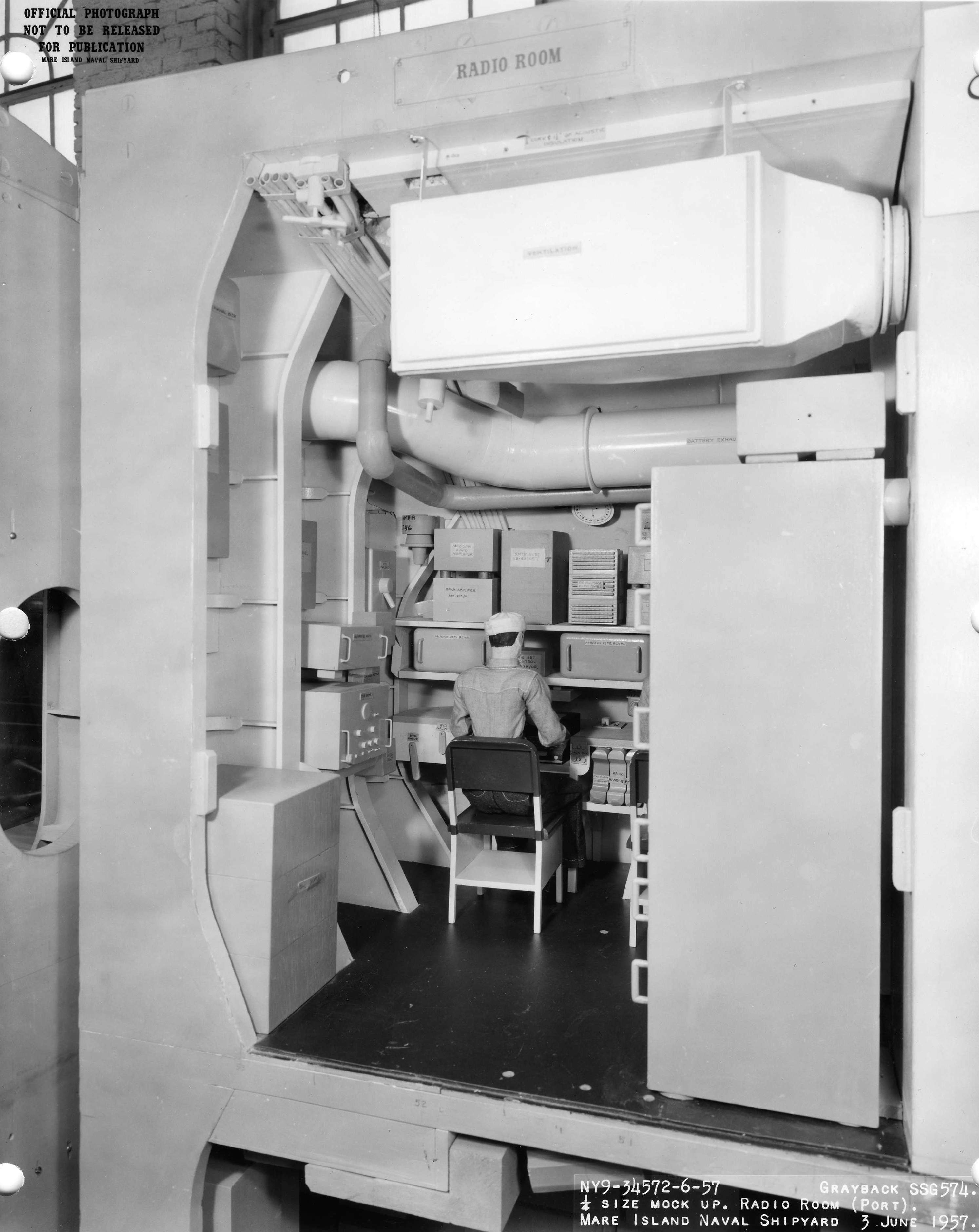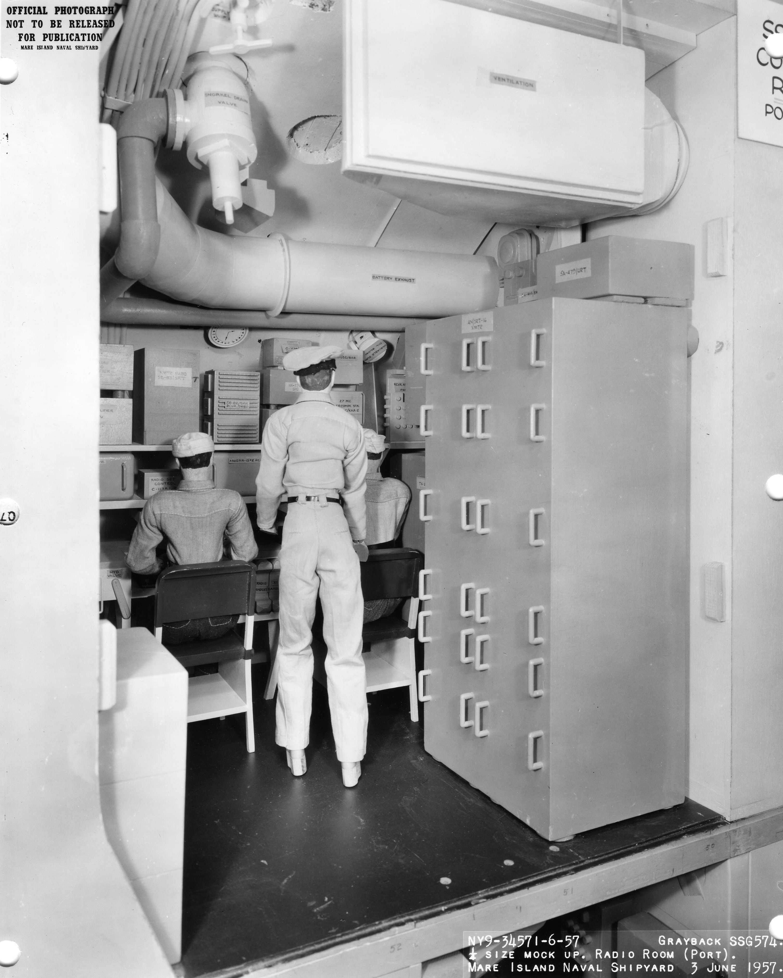 ![]() | 574k | 1/4 Size mockup of the radio room aboard Grayback (SSG-574) taken at Mare Island in 3 June 1957. | USN photo # 34571-6-57, courtesy of Darryl L. Baker. | |