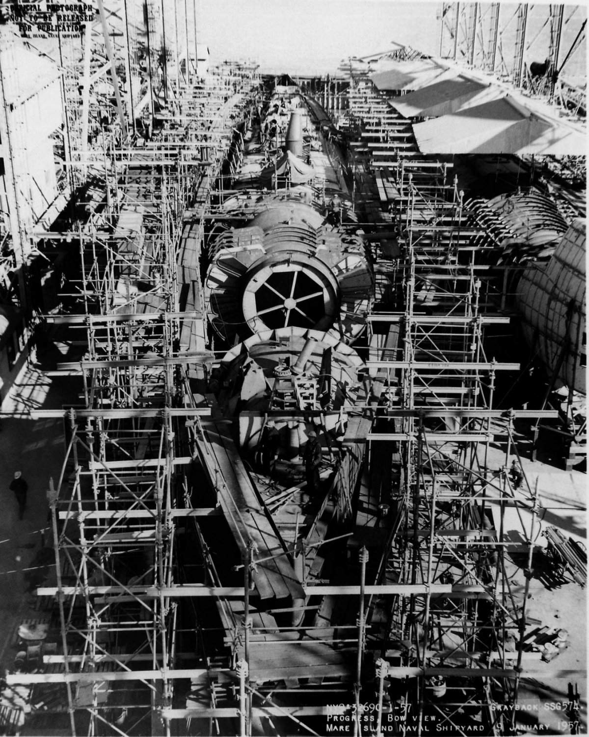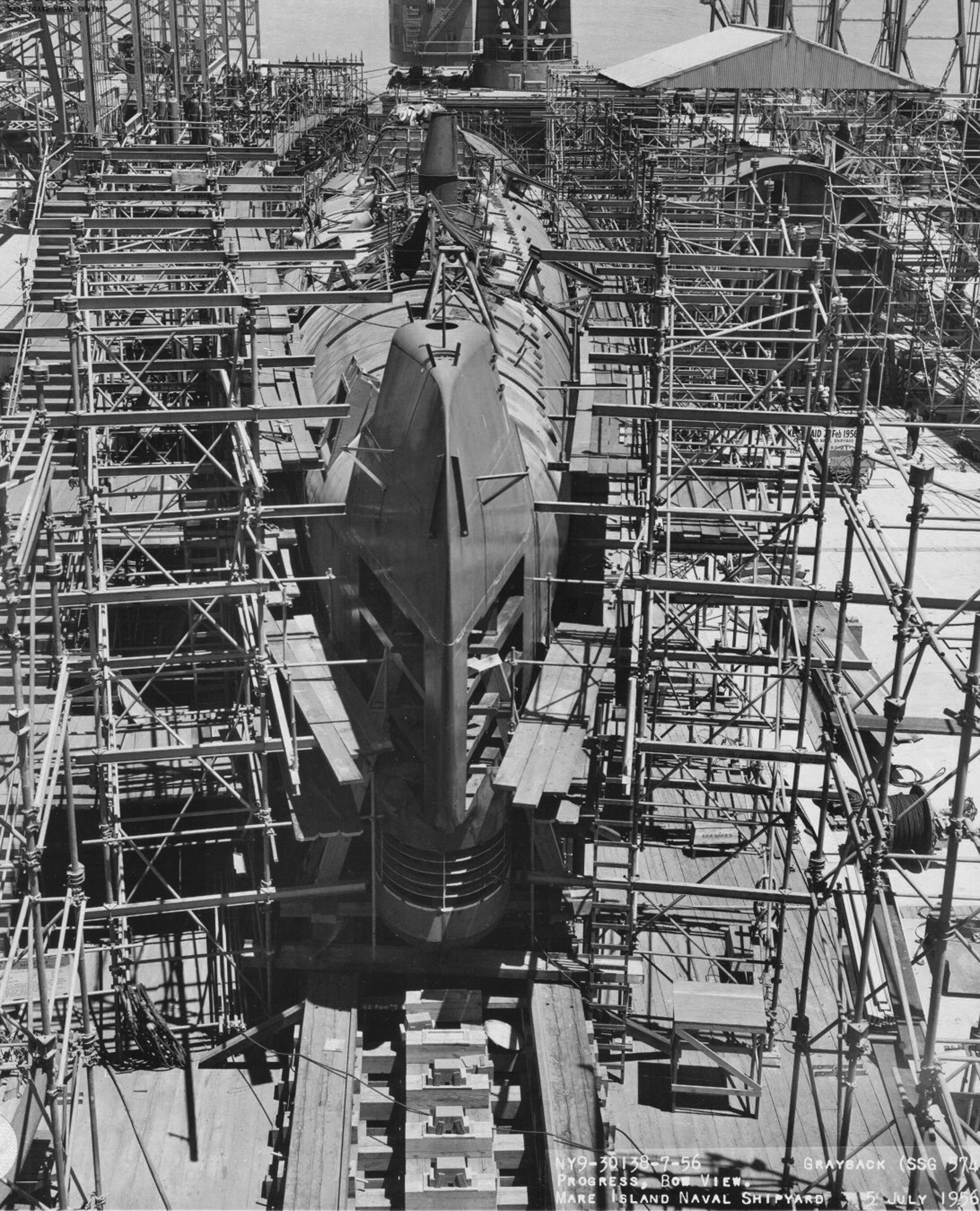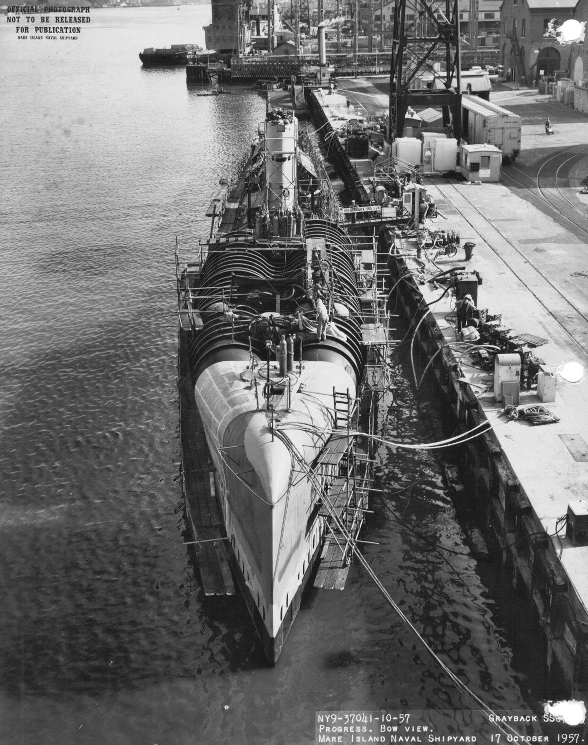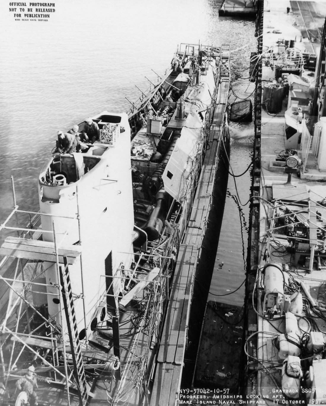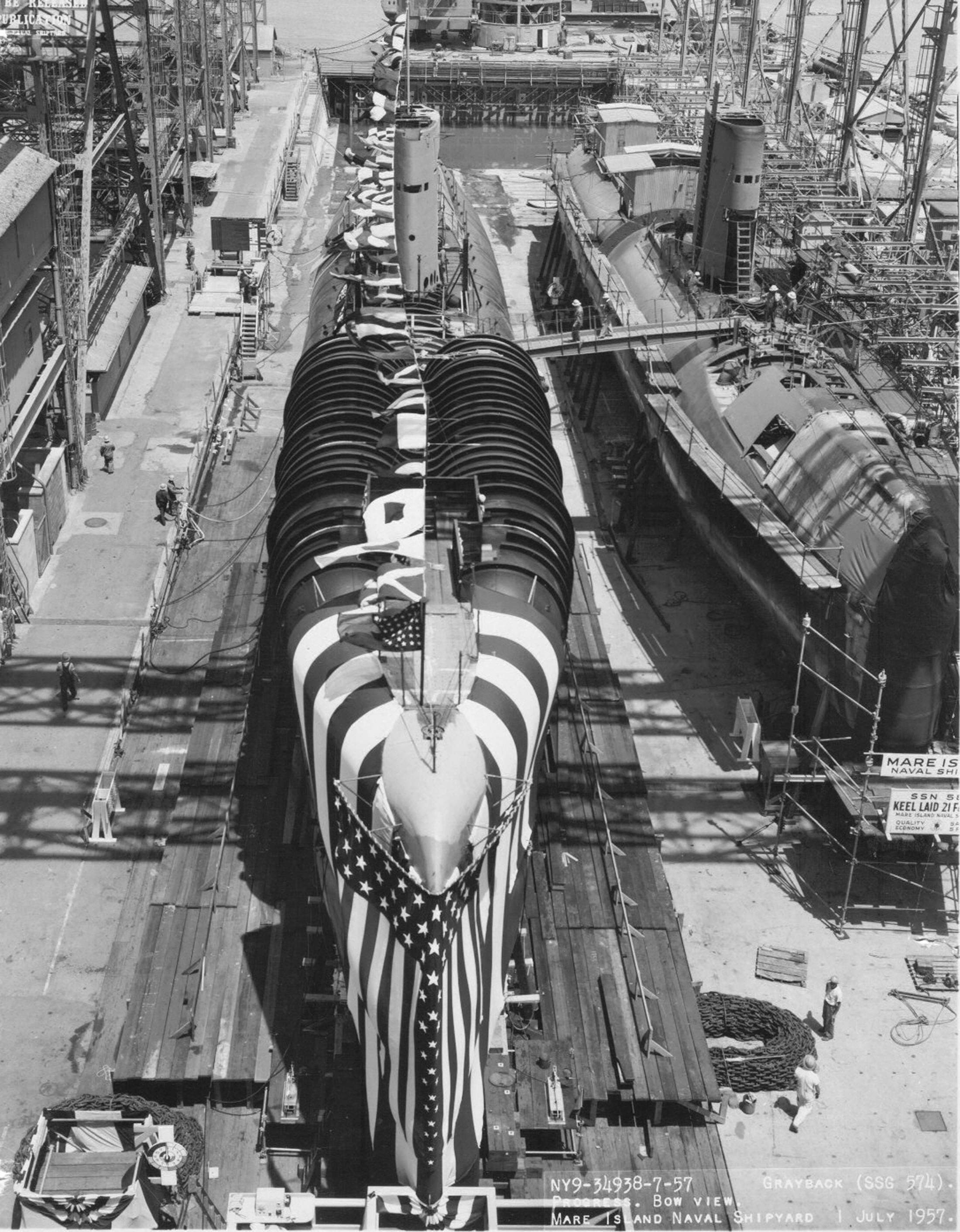 ![]() | 2.30k | Grayback (SSG-574) is seen ready for launching at Mare Island on 2 July 1957. The bow of the Sargo (SSN-583) is seen to the right. | USN photo # 35041-7-57 TH, courtesy of Vallejo Naval and Historical Museum via Darryl L. Baker. | |