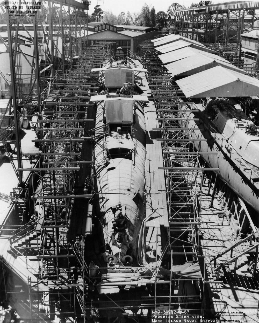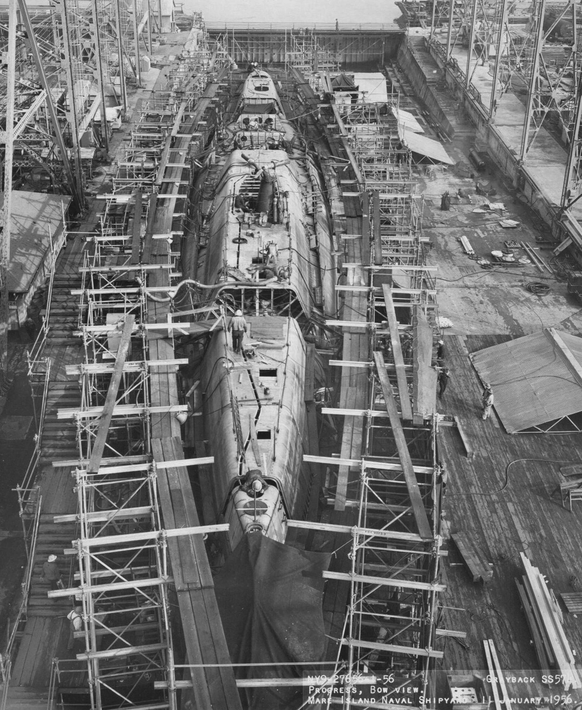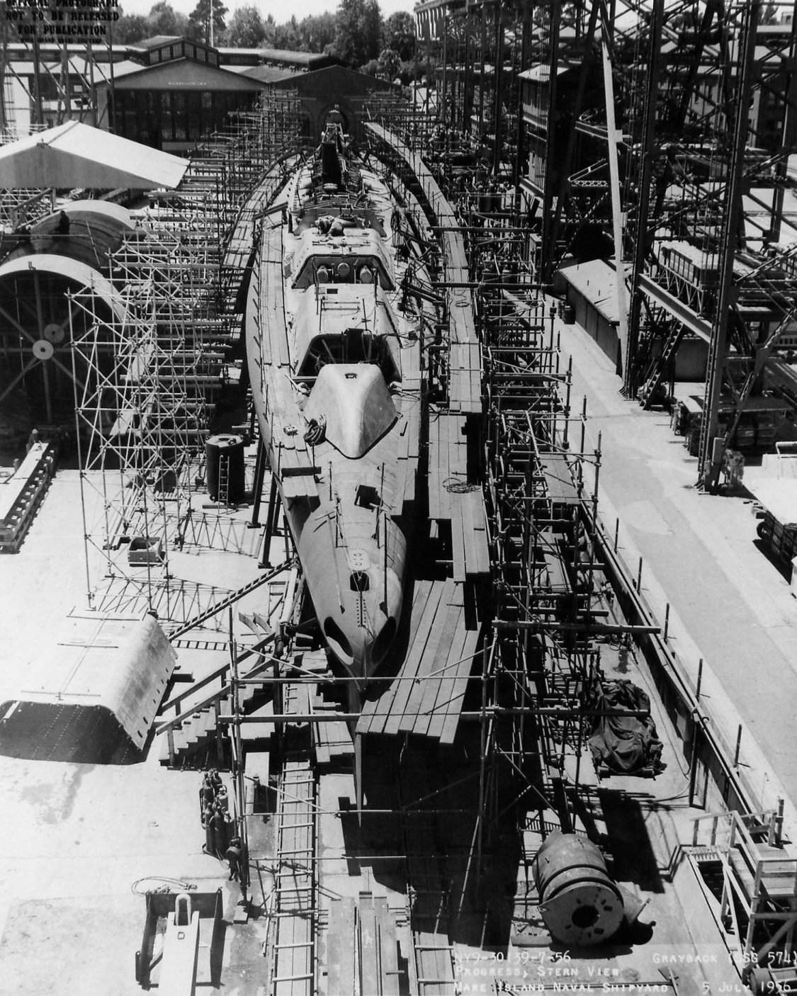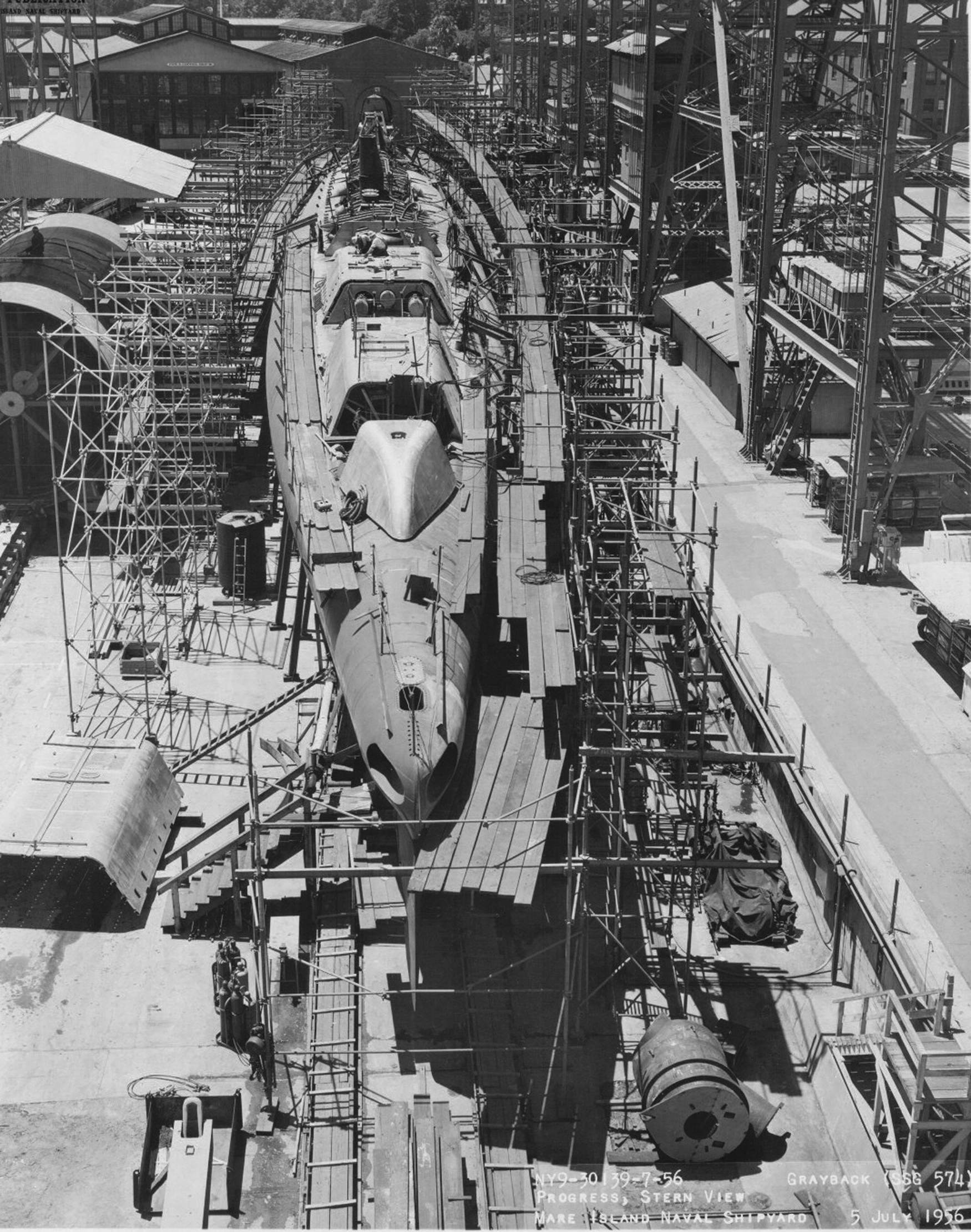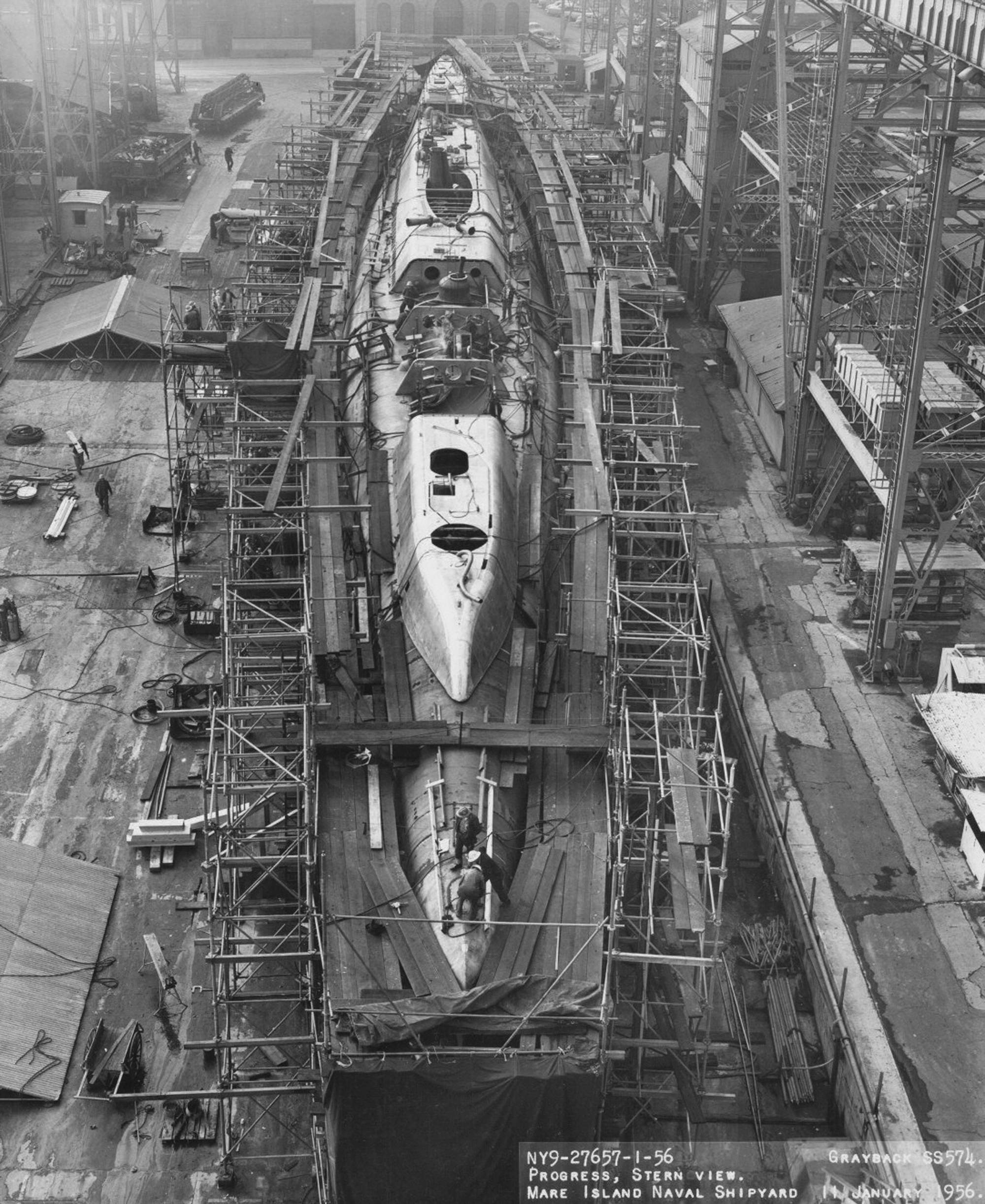 ![]() | 245k | Stern view of Grayback (SSG-574) on the ways at Mare Island on 3 April 1956. The Sargo (SSN-583) is under construction on the ways to the left. | USN photo # 30139-7-56, courtesy of Darryl L. Baker. | |