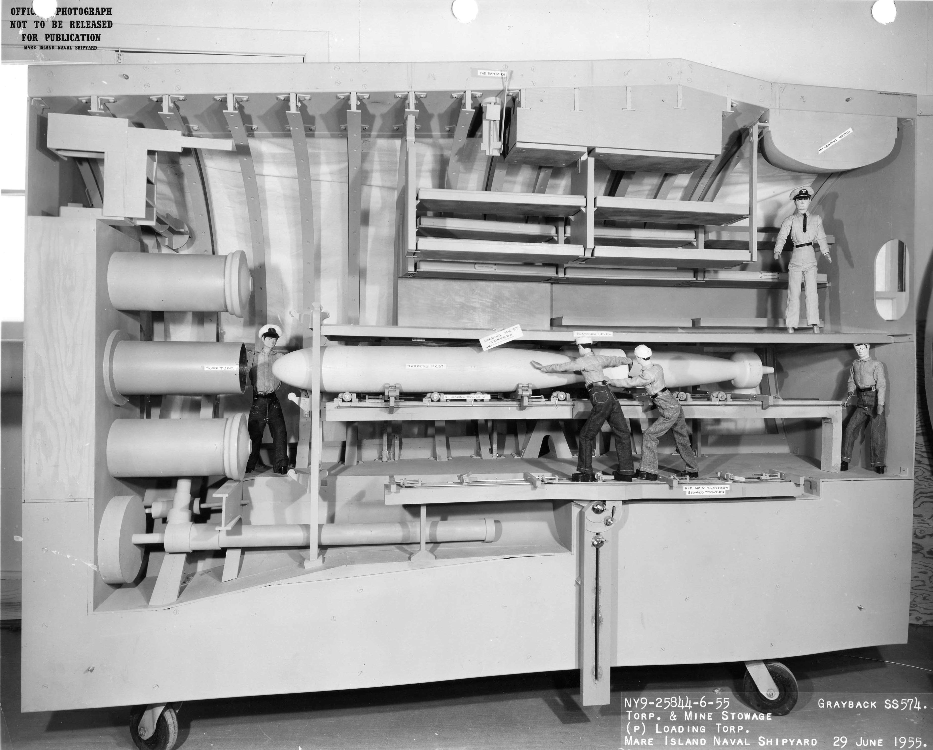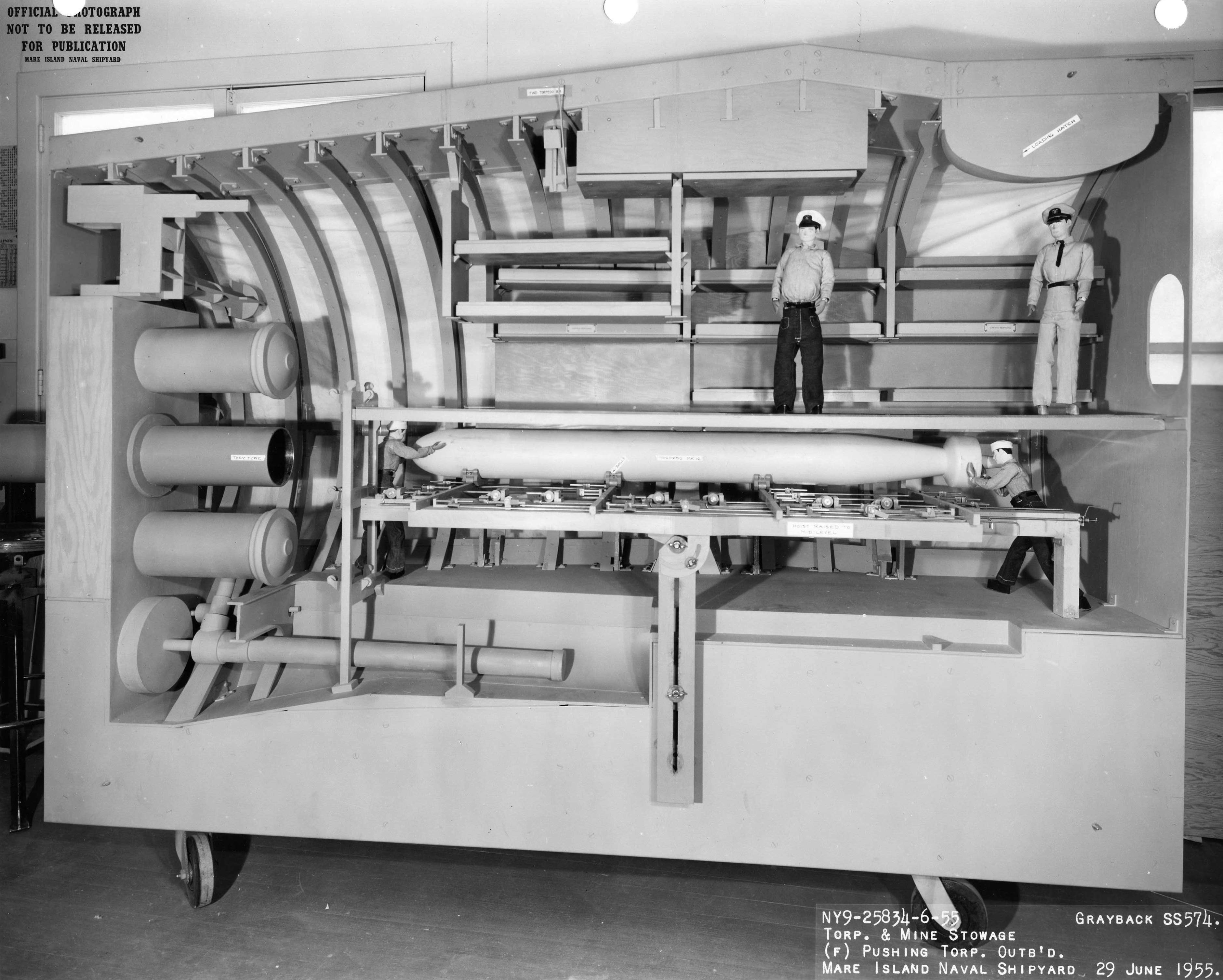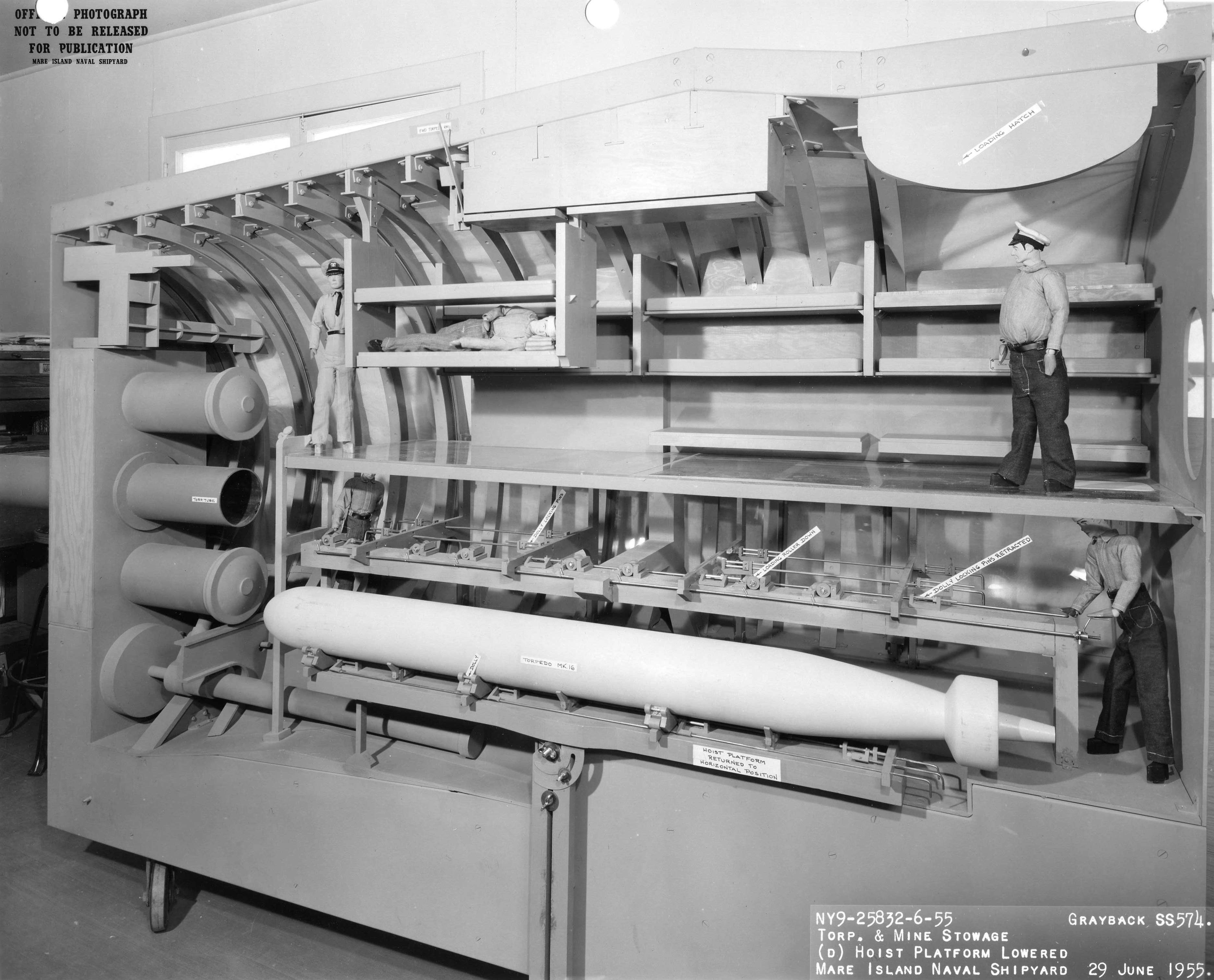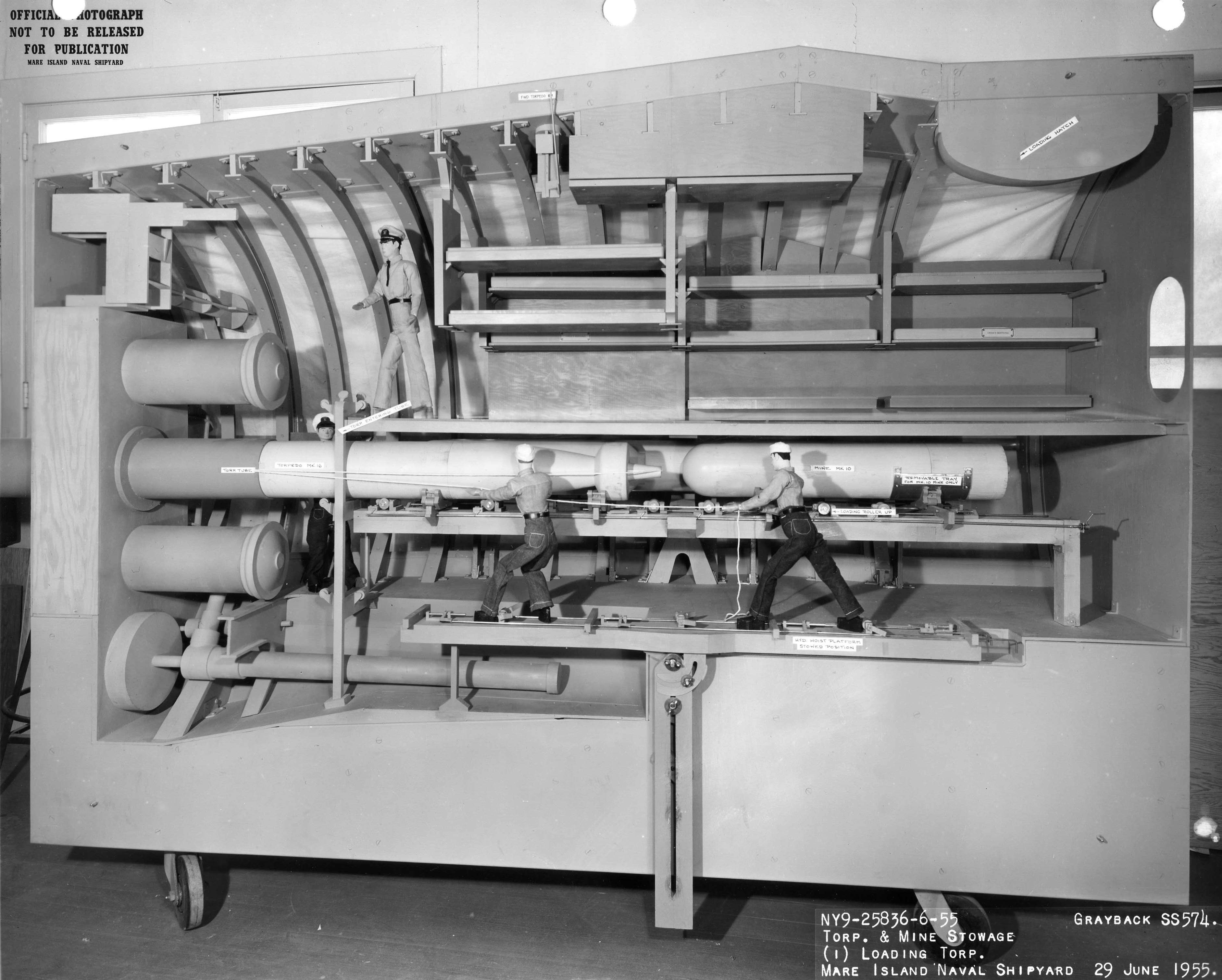 ![]() | 707k | Mk-16 Torpedo shown being moved from the torpedo hoist platform onto the torpedo racks in forward torpedo room of the Mare Island's mock-up of the SS configuration of Grayback (SSG-574). | U.S. Navy / Mare Island Photo # 25834-6-55, courtesy of Darryl L. Baker. | |