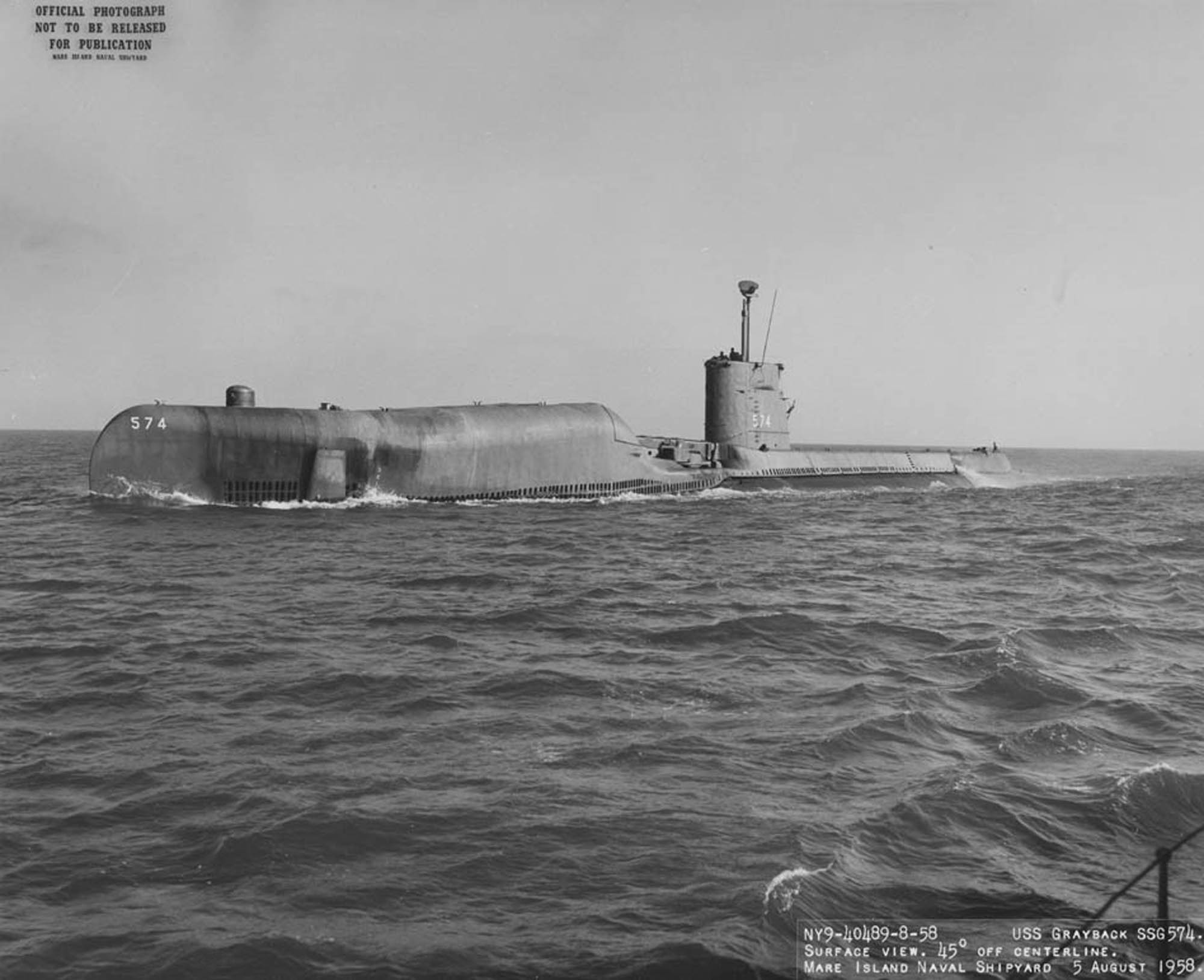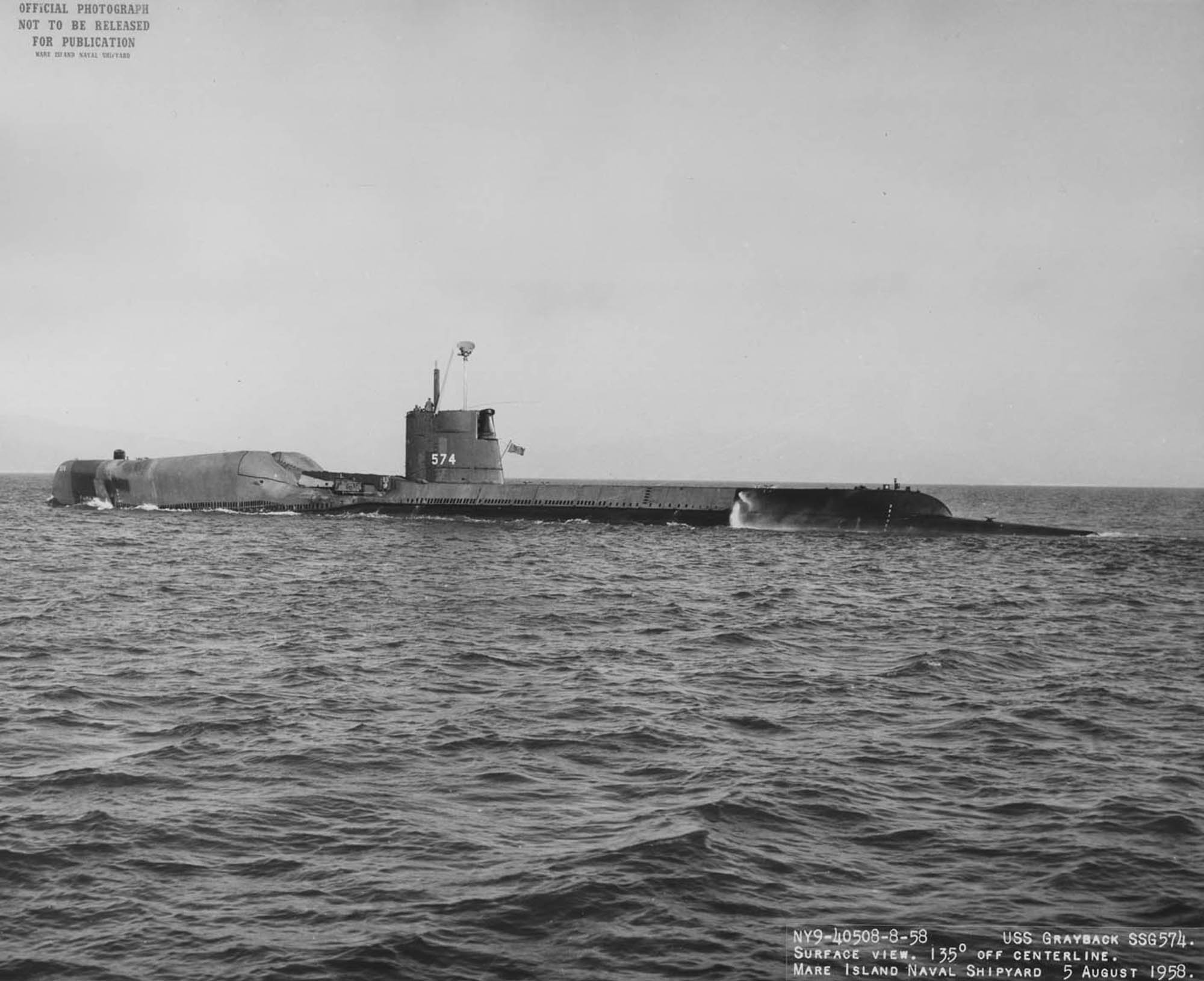 ![]() | 217k | Grayback (SSG-574) surface view, 5 August 1958. | Mare Island Navy Yard Ship Files, NARA San Francisco, Photo # NY9-40508-8-58, courtesy of Tracy White @ Researcher @ Large. | |