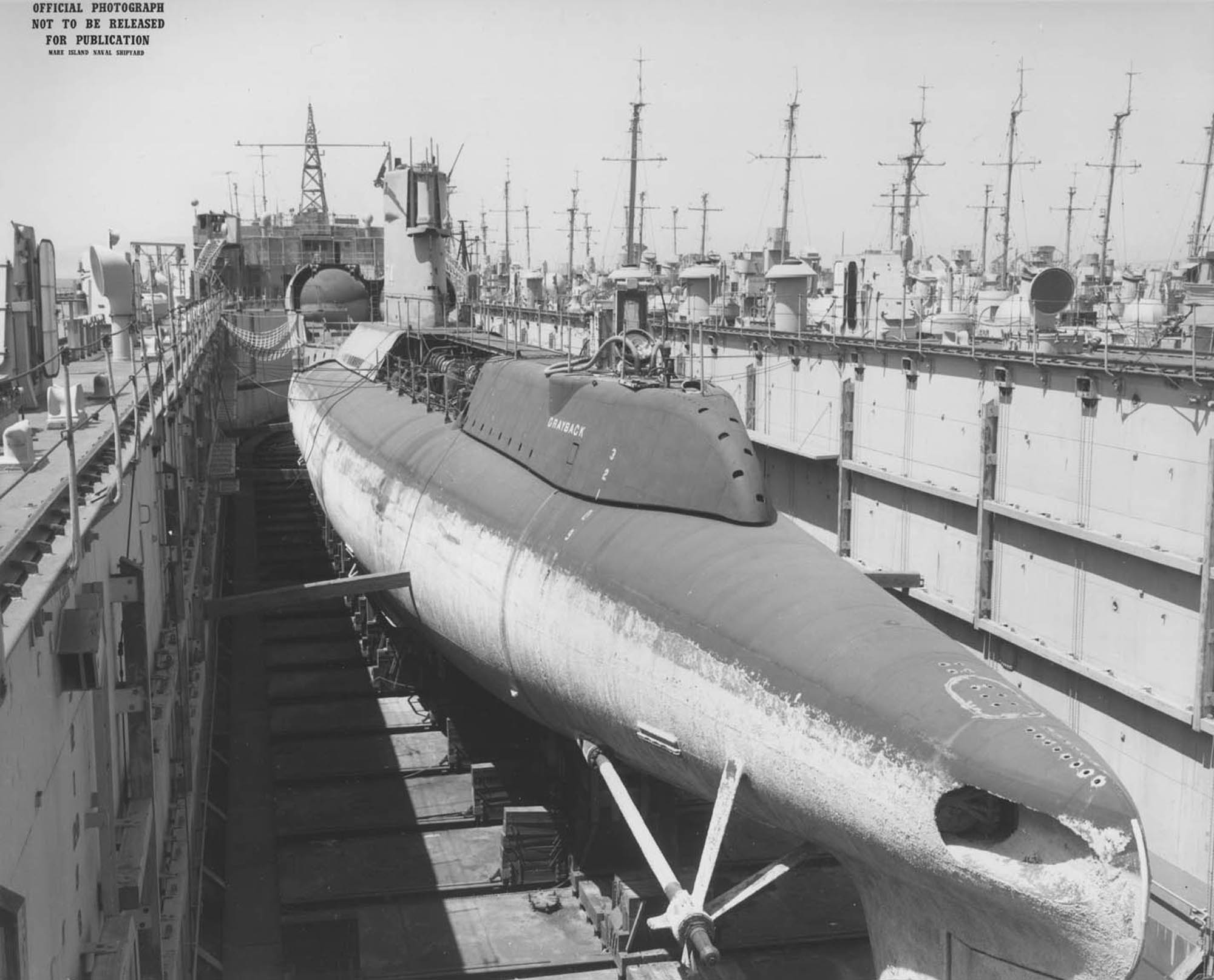 ![]() | 227k | Grayback (SSG-574) in ARD 10 at the Mare Island Reserve Fleet, 16 July 1965 while being converted to a submarine troop transport. | Text i.d. courtesy of Darryl L. Baker. Mare Island Navy Yard Ship Files, NARA San Francisco, Photo # 69045, courtesy of Tracy White @ Researcher @ Large. |