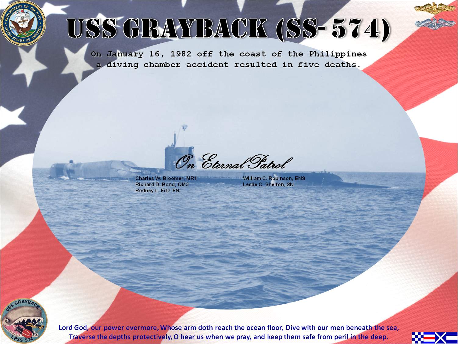 ![]() | 199k | Commemorative photo honoring the memory of the crew of the Grayback (SSG-574) who died in a diving chamber accident on 16 January 1982. | Photo courtesy of Raymond Fritz. ET1(SS). | |