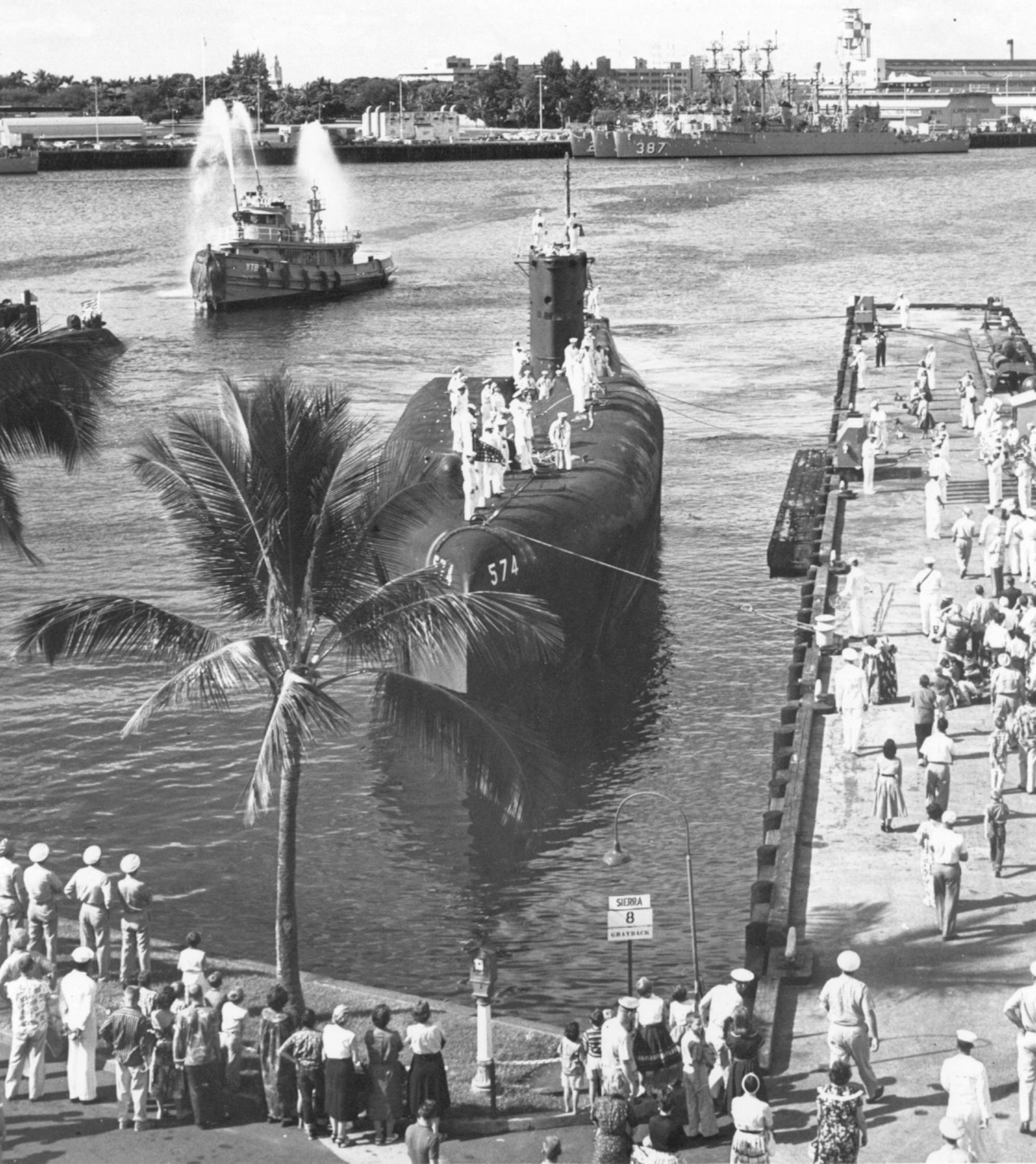 ![]() | 413k | Grayback (SSG-574) in Honolulu, 1959. | Photograph by Charles Hansen. | |