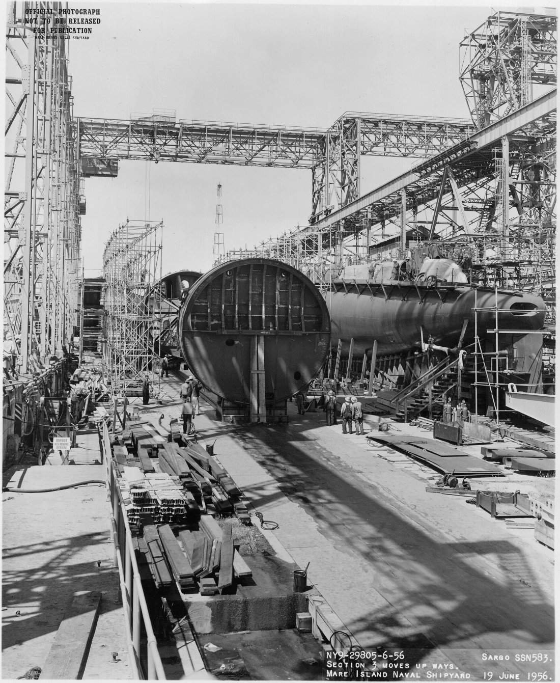 ![]() | 232k | Section 3 of the Sargo (SSN-583) is shown being moved up the building ways at Mare Island Naval Shipyard on 19 June 1956. The Grayback (SSG-574) is shown on the building ways to the right. | USN photo # NY9 29805-6-56, courtesy of Darryl L. Baker. | |
