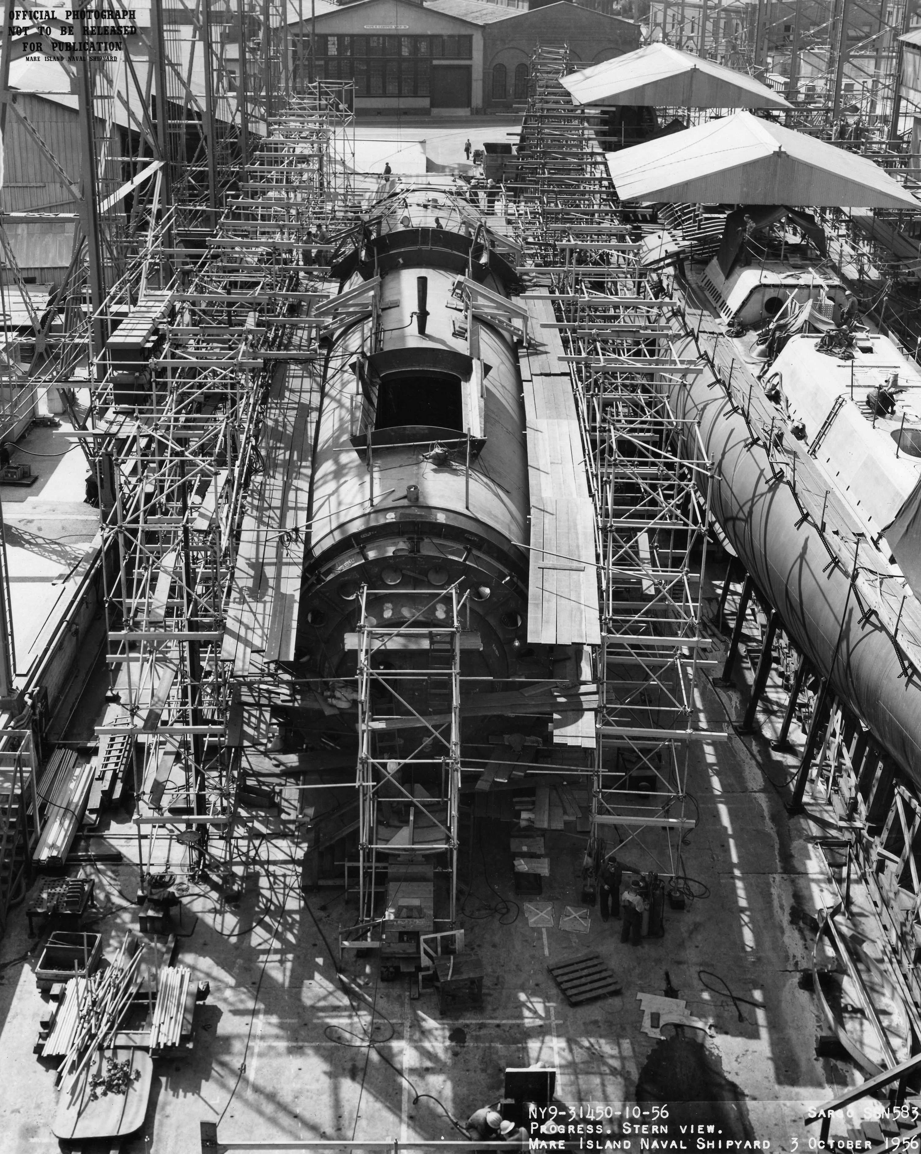 ![]() | 1.30k | Various hull sections for the Sargo (SSN-583) are shown on the building ways at Mare Island on 3 October 1956. View is looking towards the bow of the boat. Grayback (SSG-574) is alongside to the right. | USN photo # 31450-10-56, courtesy of Darryl L. Baker. | |