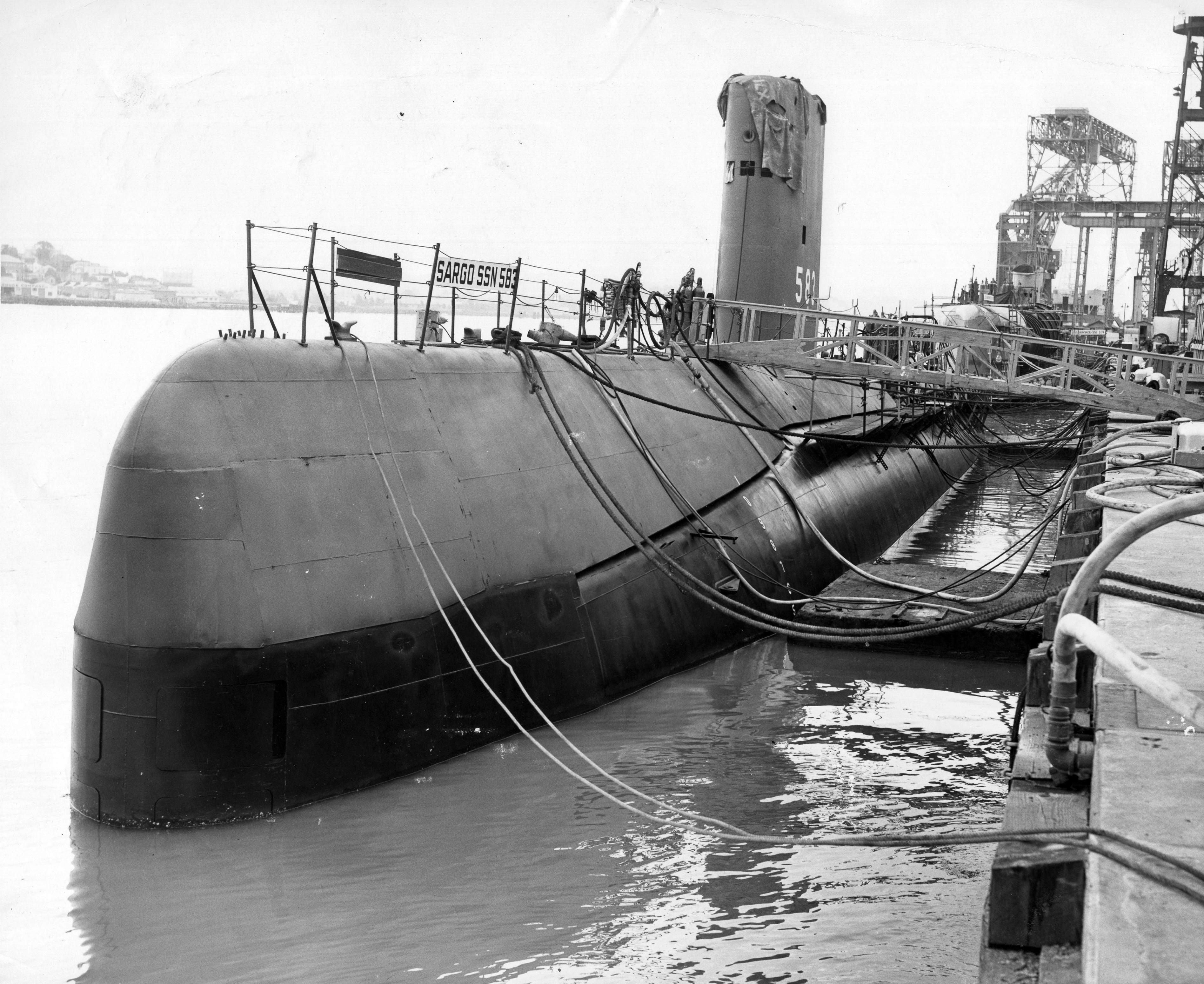 ![]() | 1.10k | Sargo (SSN-583) at her outfitting berth after her launching at Mare Island. Grayback (SSG-574) is aft of Sargo. | USN photo # 37333-10-57 TH courtesy of Vallejo Naval and Museum via Darryl L. Baker. | |