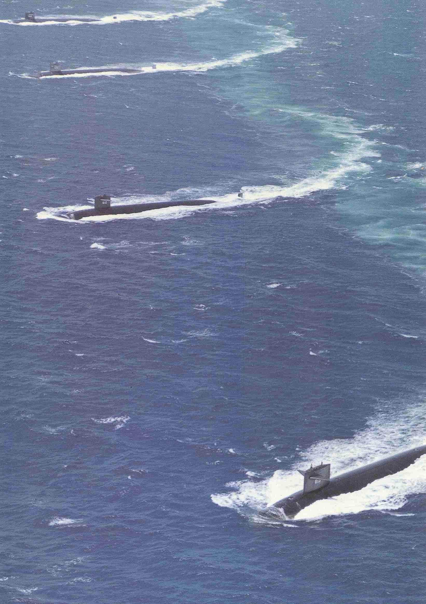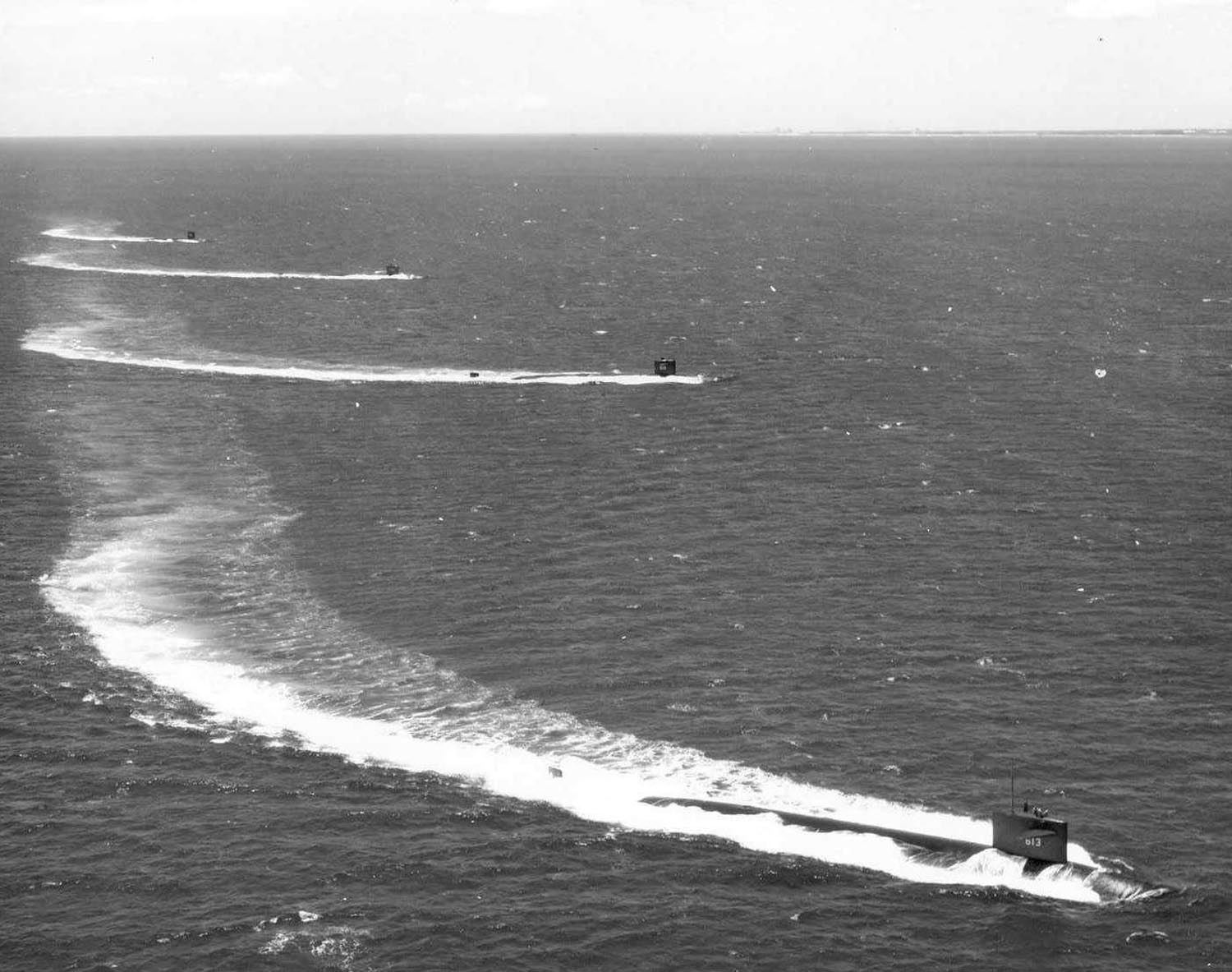 192k | Four Thresher Class boats exercise on 20 May 1968: Plunger (SSN-595), Barb (SSN-596), Guardfish (SSN-612) & Flasher (SSN-613). |