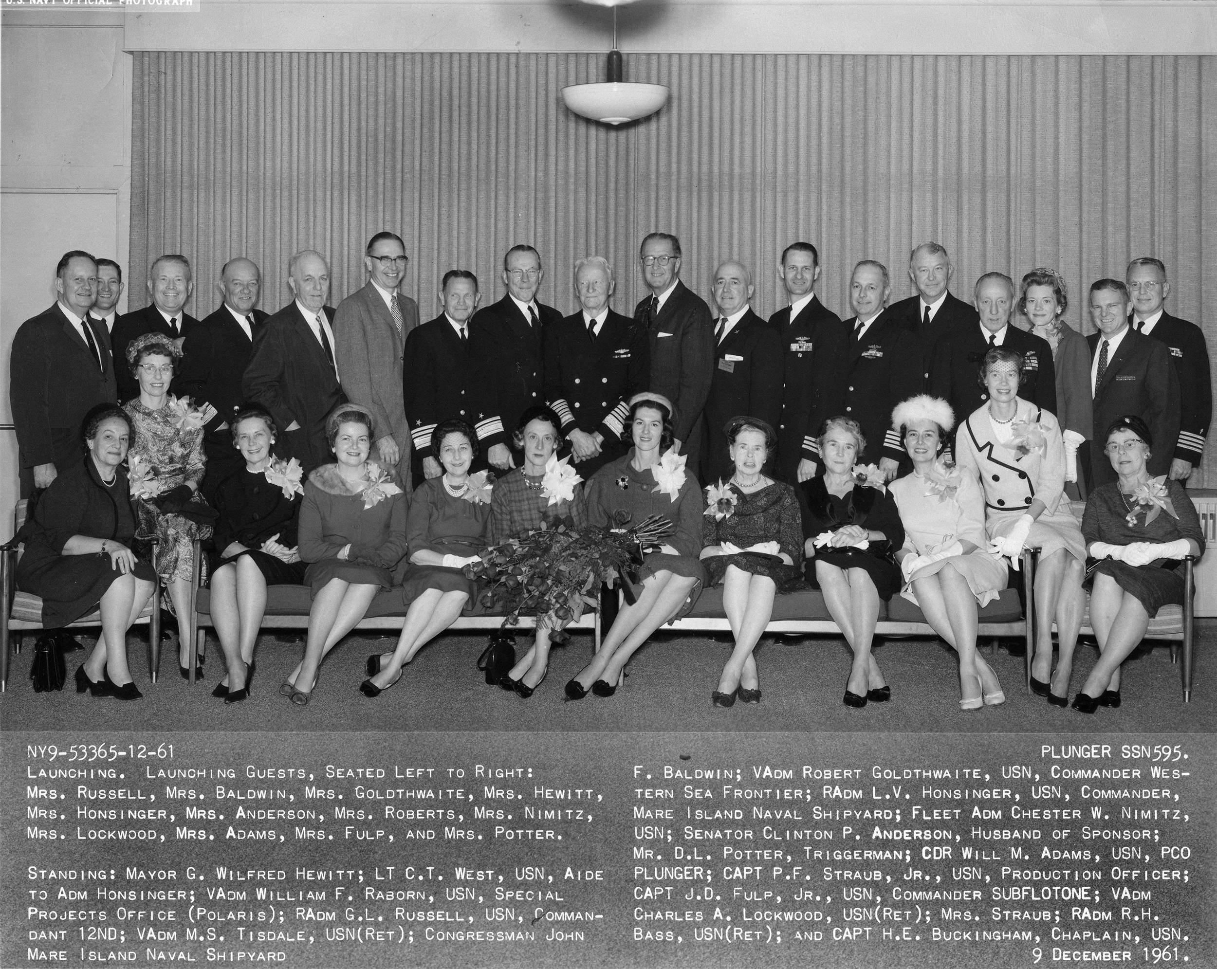 2.85k | Mrs. Clinton P. Anderson, sponsor of Plunger (SSN-595) on the right and RADM L. V. Honsinger, Commander, Mare Island Naval Shipyard at reception after the Plunger's launching at Mare Island Officer Club 9 December 1961. | Photo from files of the Vallejo Naval & Historical Museum, courtesy of Darryl L. Baker. | |