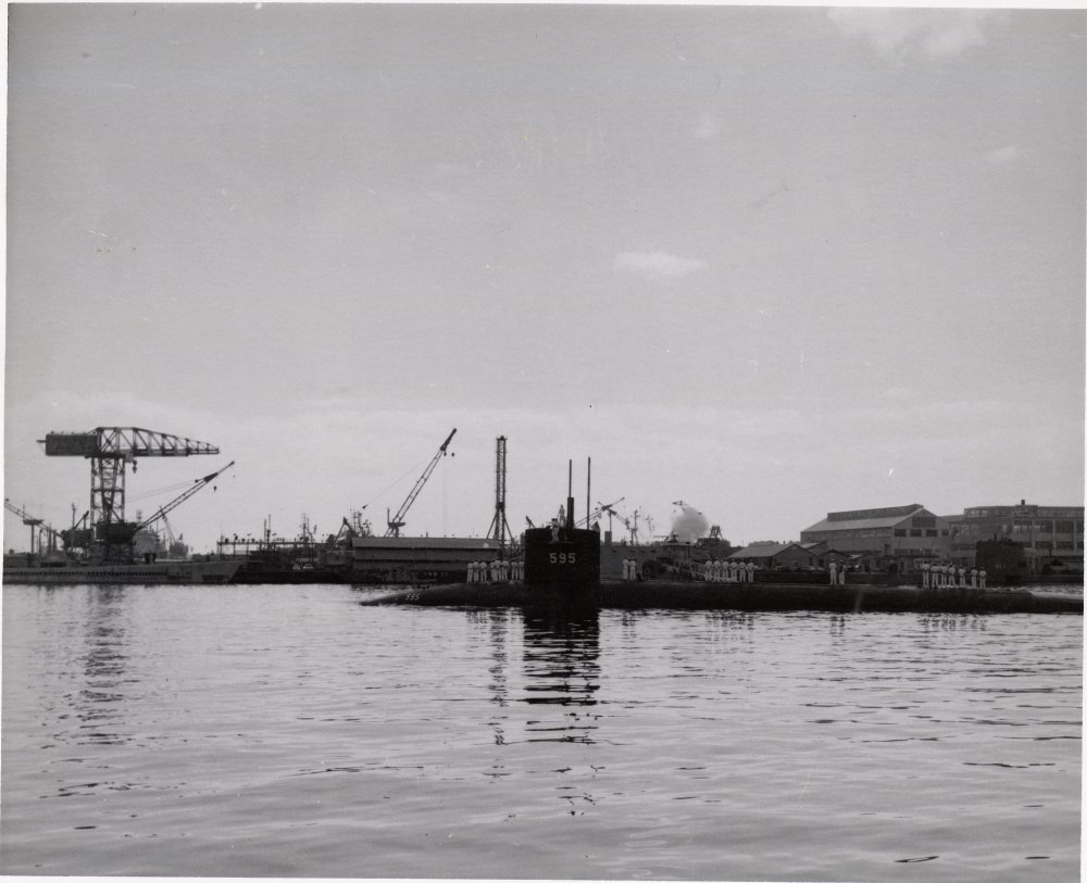 101k | Plunger (SSN-595) glides past Pearl Harbor Naval Shipyard on 12 January 1963. This was her first deployment after commissioning at Mare Island Naval Shipyard on 21 November 1962. | USN photo courtesy of Darryl L. Baker. | |