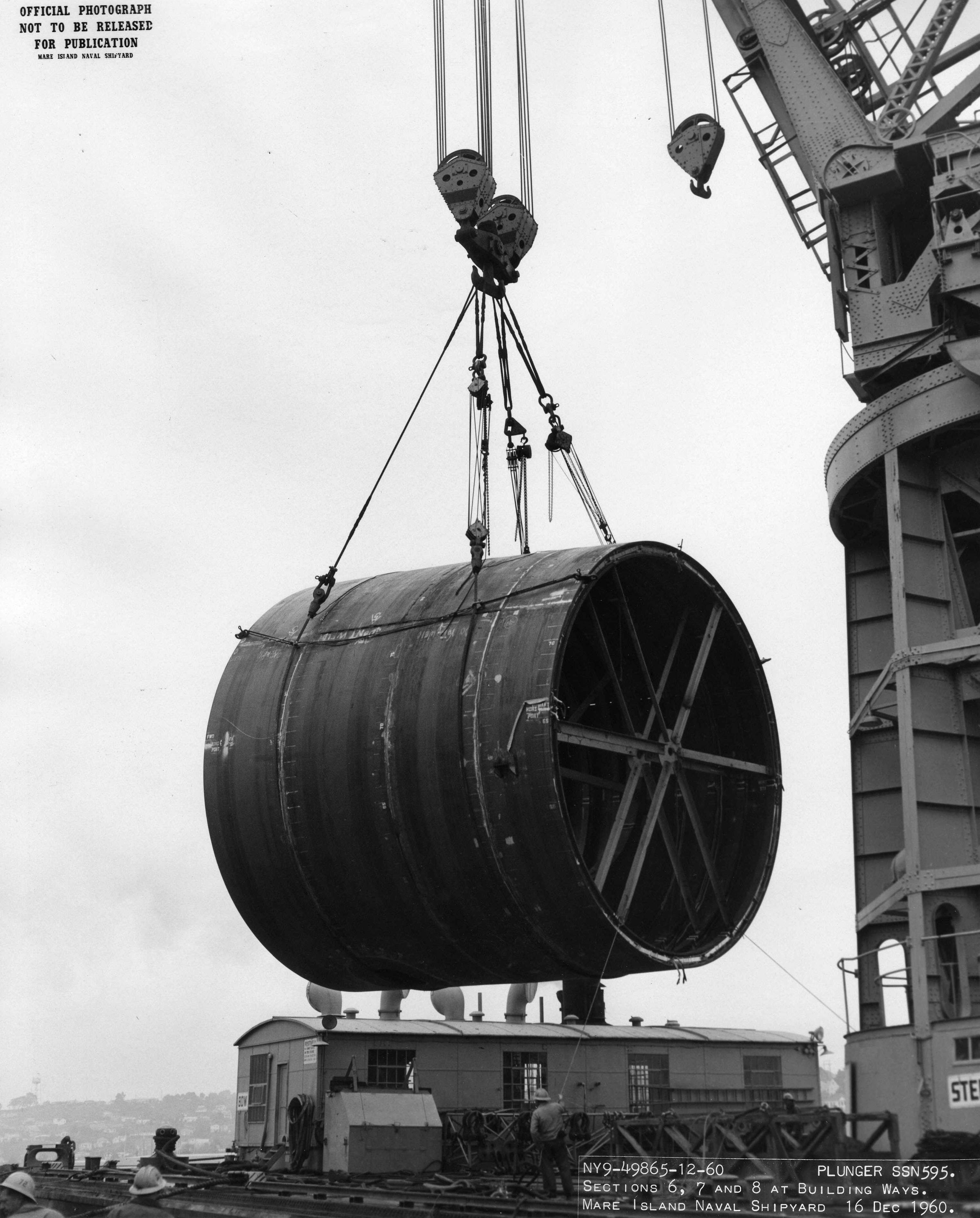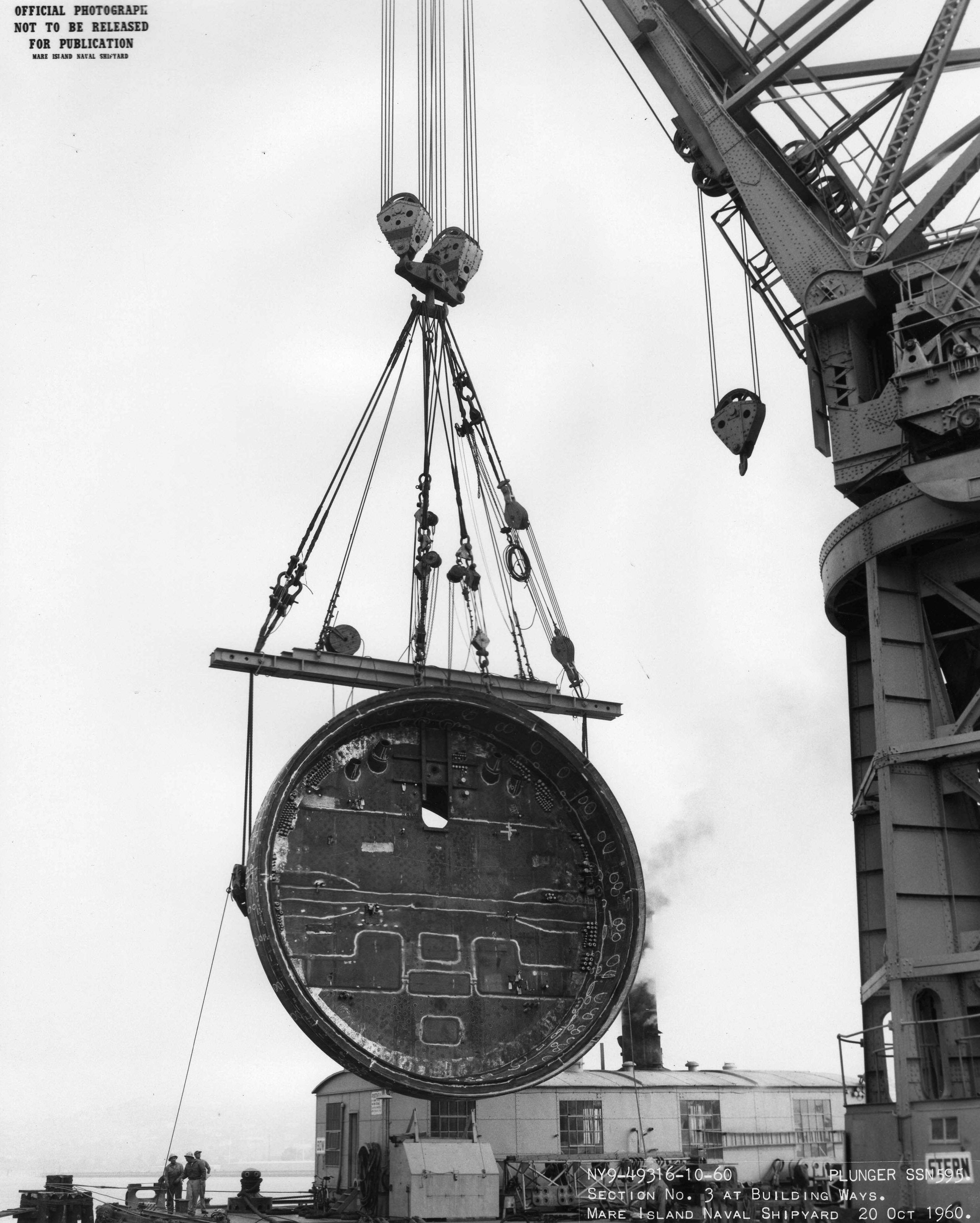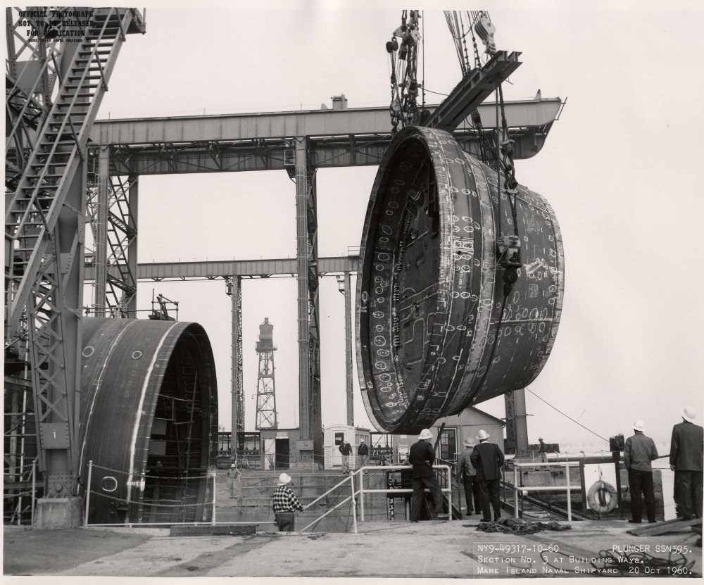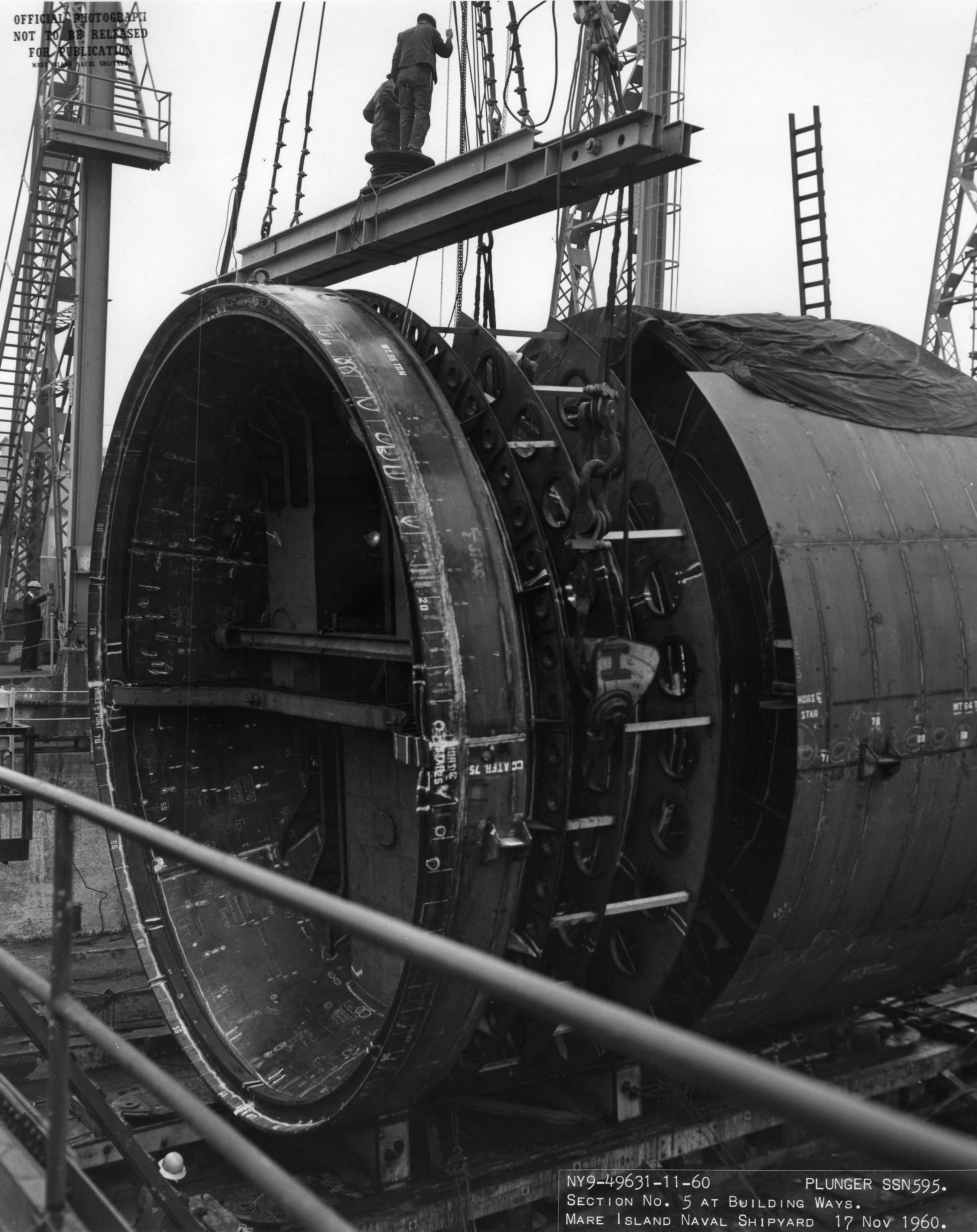 170k | Section #3 (aft bulkhead section) of the Plunger (SSN-595) is lifted onto the building ways on 20 October 1960 at Mare Island Naval Shipyard. The after sections of the ship were transported to the ways and put in place by the shipyard's 150 ton floating crane. | USN photo # NY9-49317-10-60, courtesy of Darryl L. Baker. | |