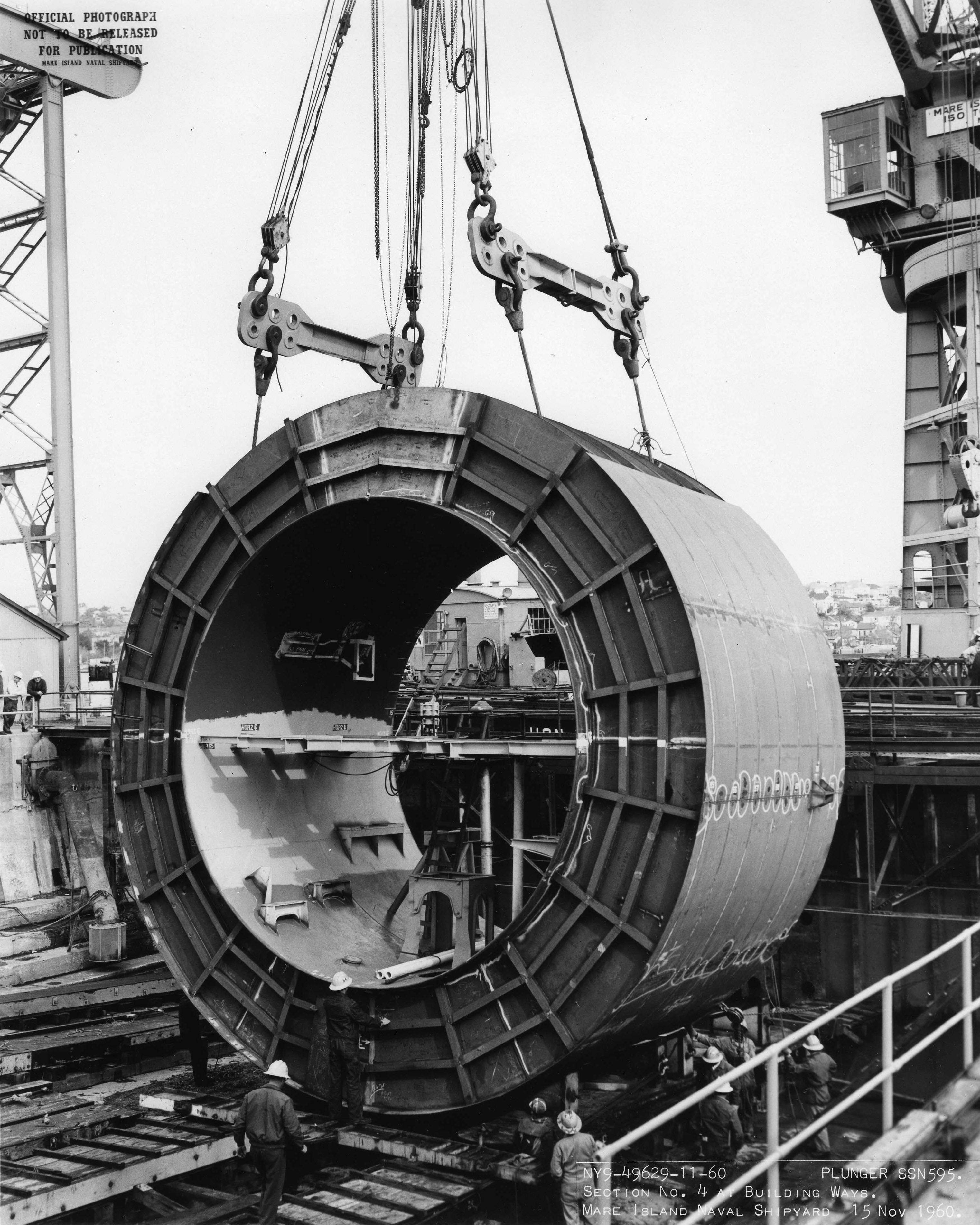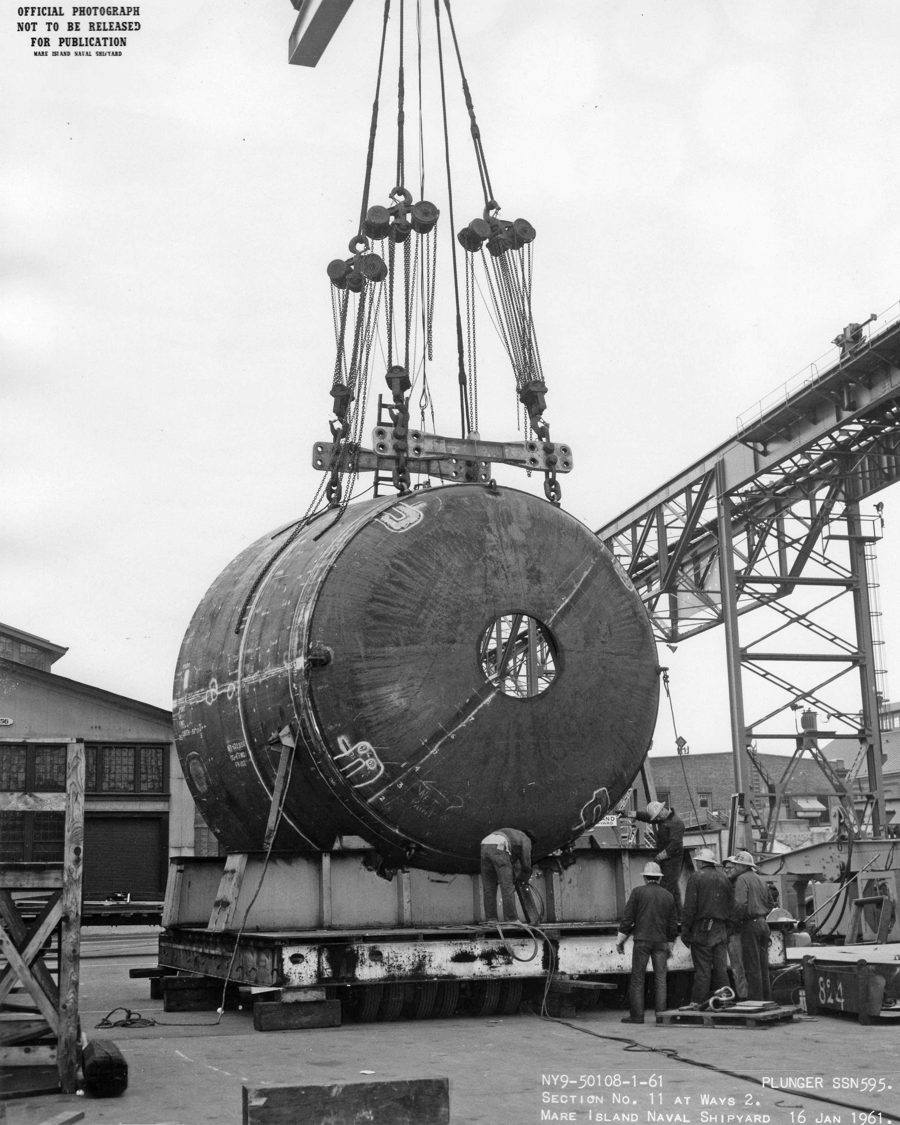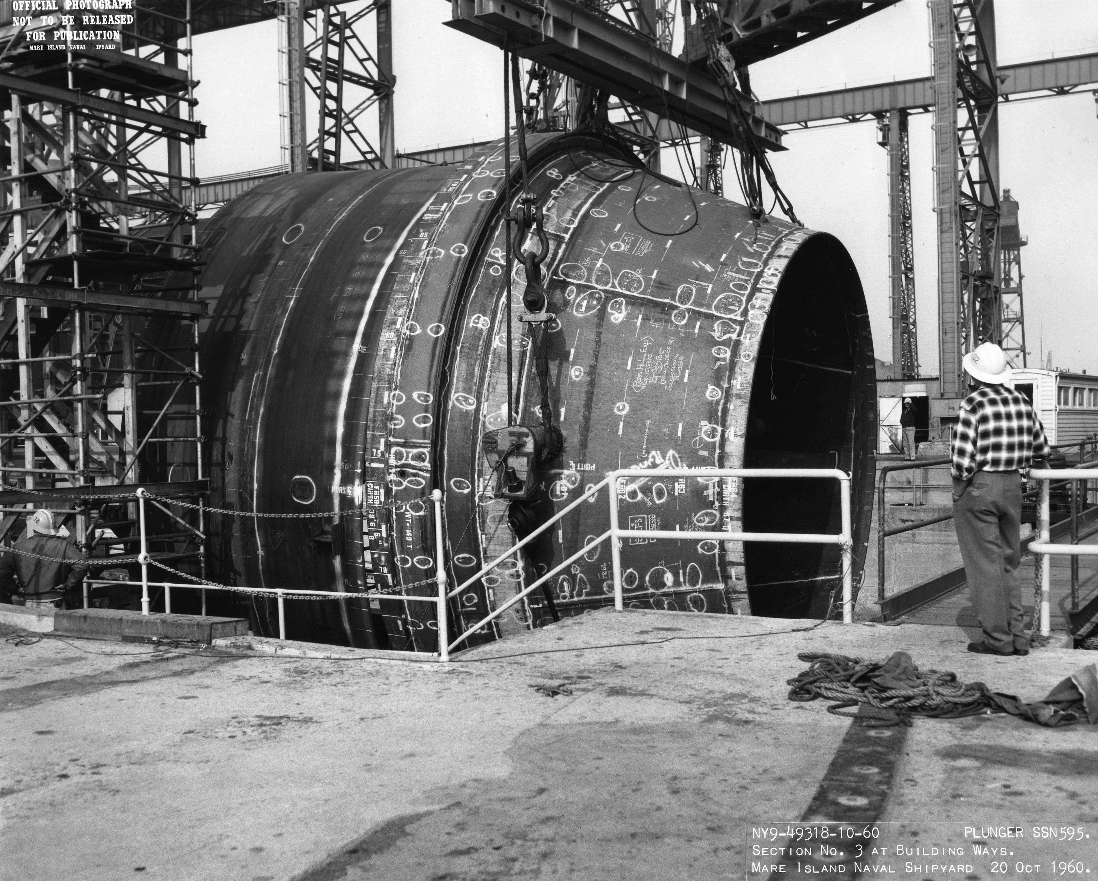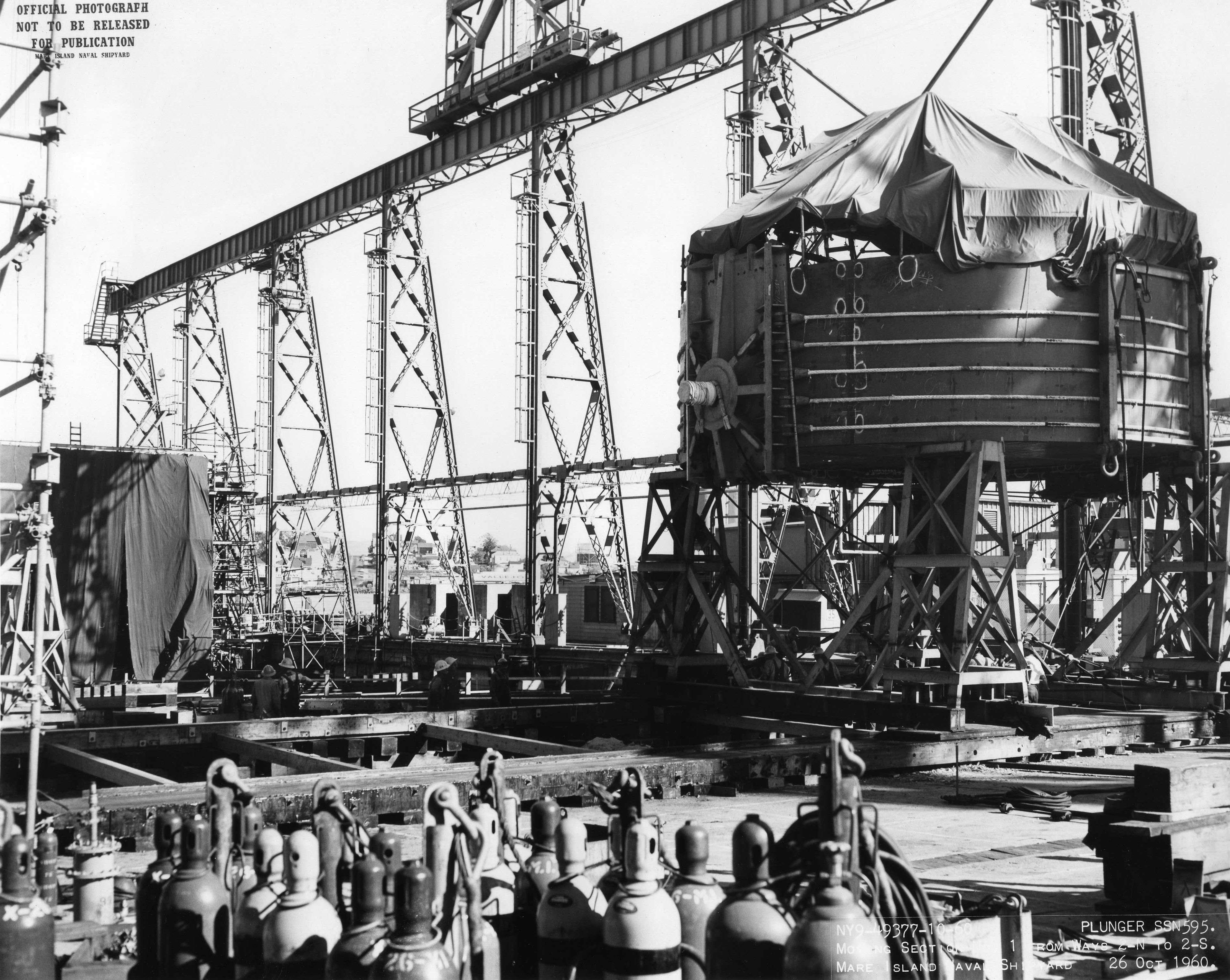 170k | Section #3 (aft bulkhead section) of the Plunger (SSN-595) is lifted onto the building ways on 20 October 1960 at Mare Island Naval Shipyard. The after sections of the ship were transported to the ways and put in place by the shipyard's 150 ton floating crane. | USN photo # NY9-49317-10-60, courtesy of Darryl L. Baker. | |