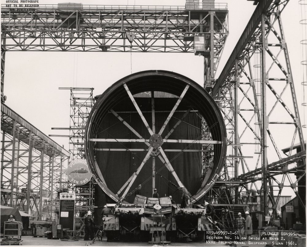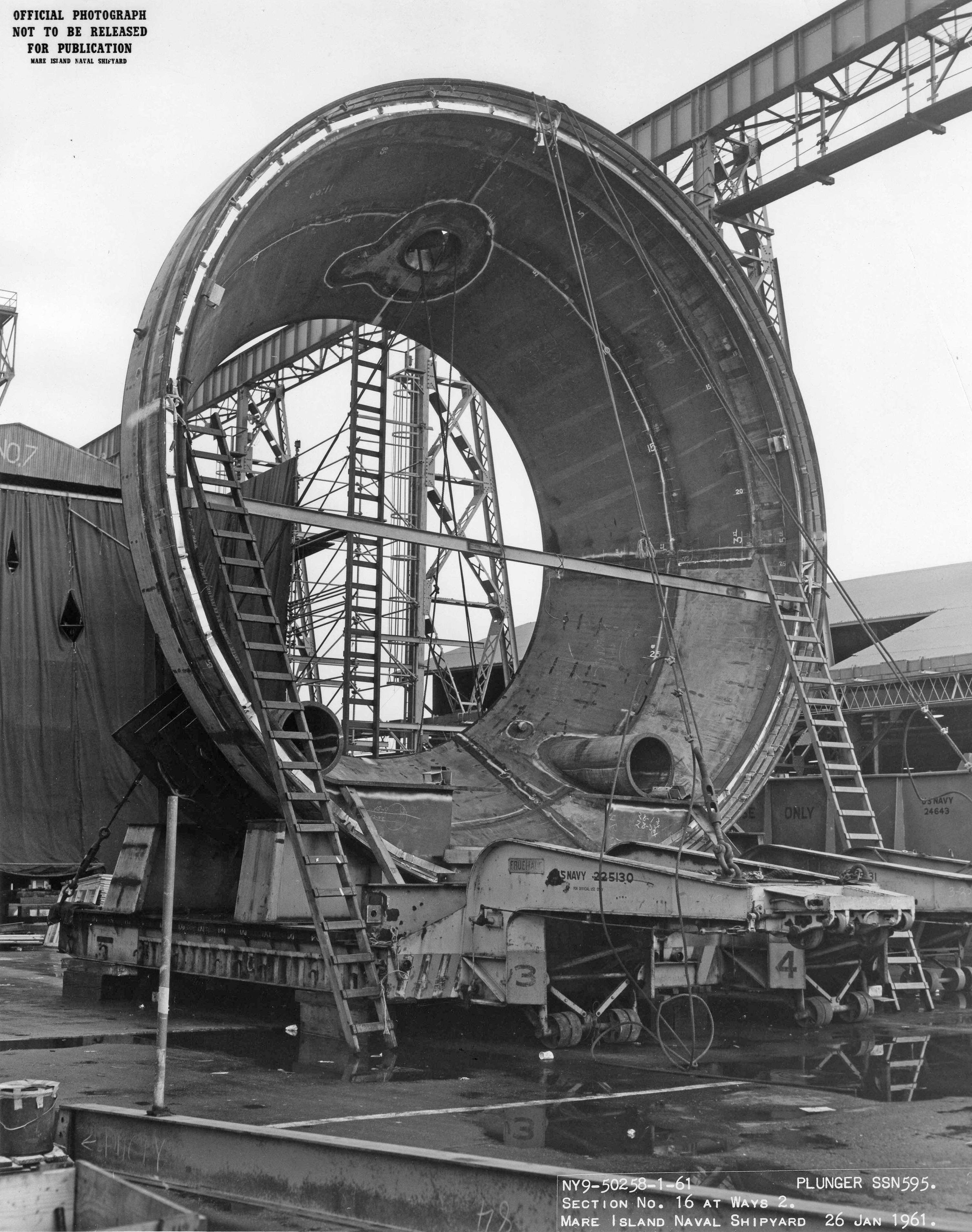 206k | Section # 14 of the Plunger (SSN-595) is shown on trailer used to transport the section from the southern hull fabrication area to the building ways on 5 January 1961 at Mare Island Naval Shipyard. | USN photo # NY9-49997-1-61, courtesy of Darryl L. Baker. | |