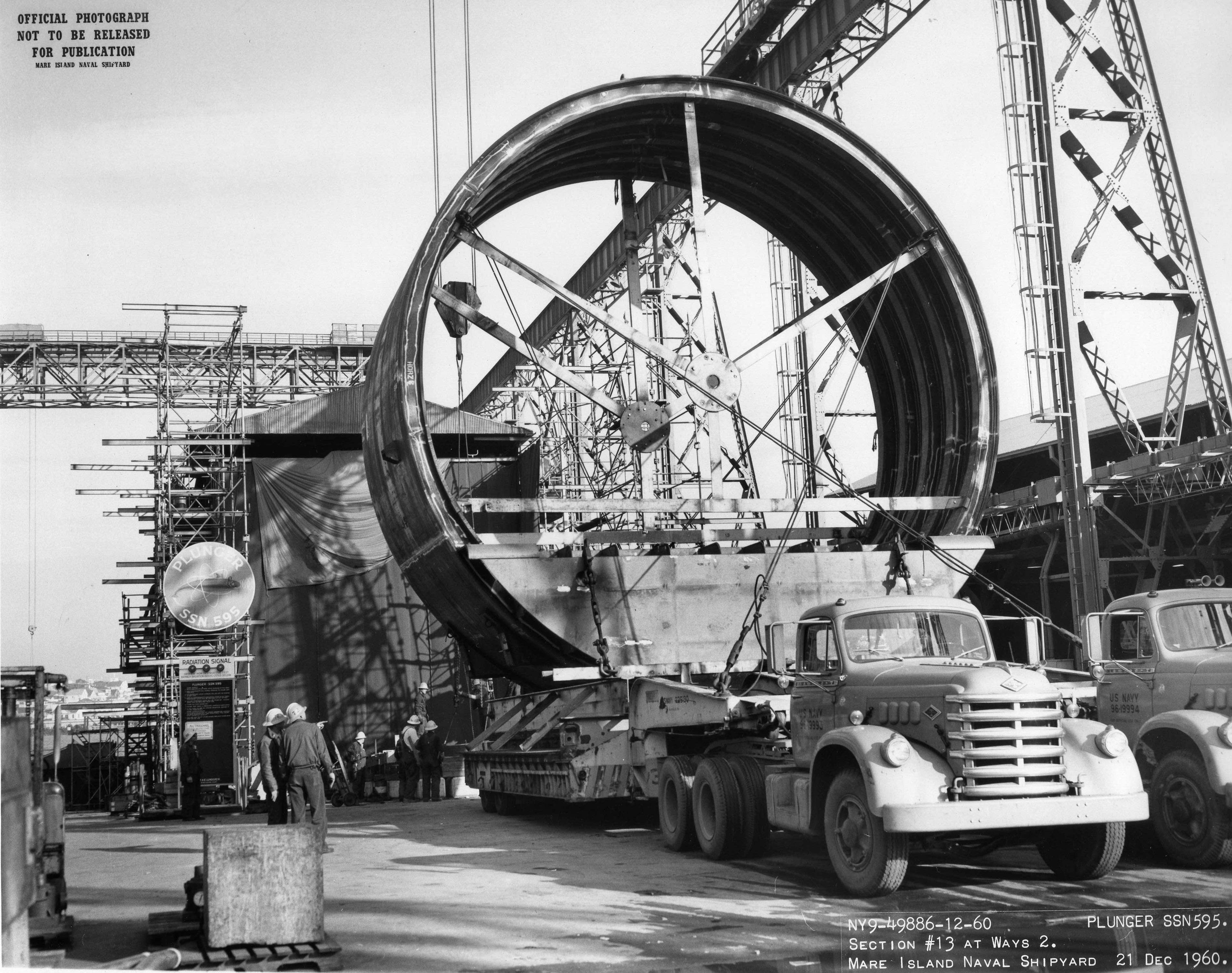 1.10k | Sections # 13 for Plunger (SSN-595) is shown arriving at the ways at Mare Island on 21 December 1960. | USN photo # 49886-12-60, contributed by Darryl L. Baker. | |