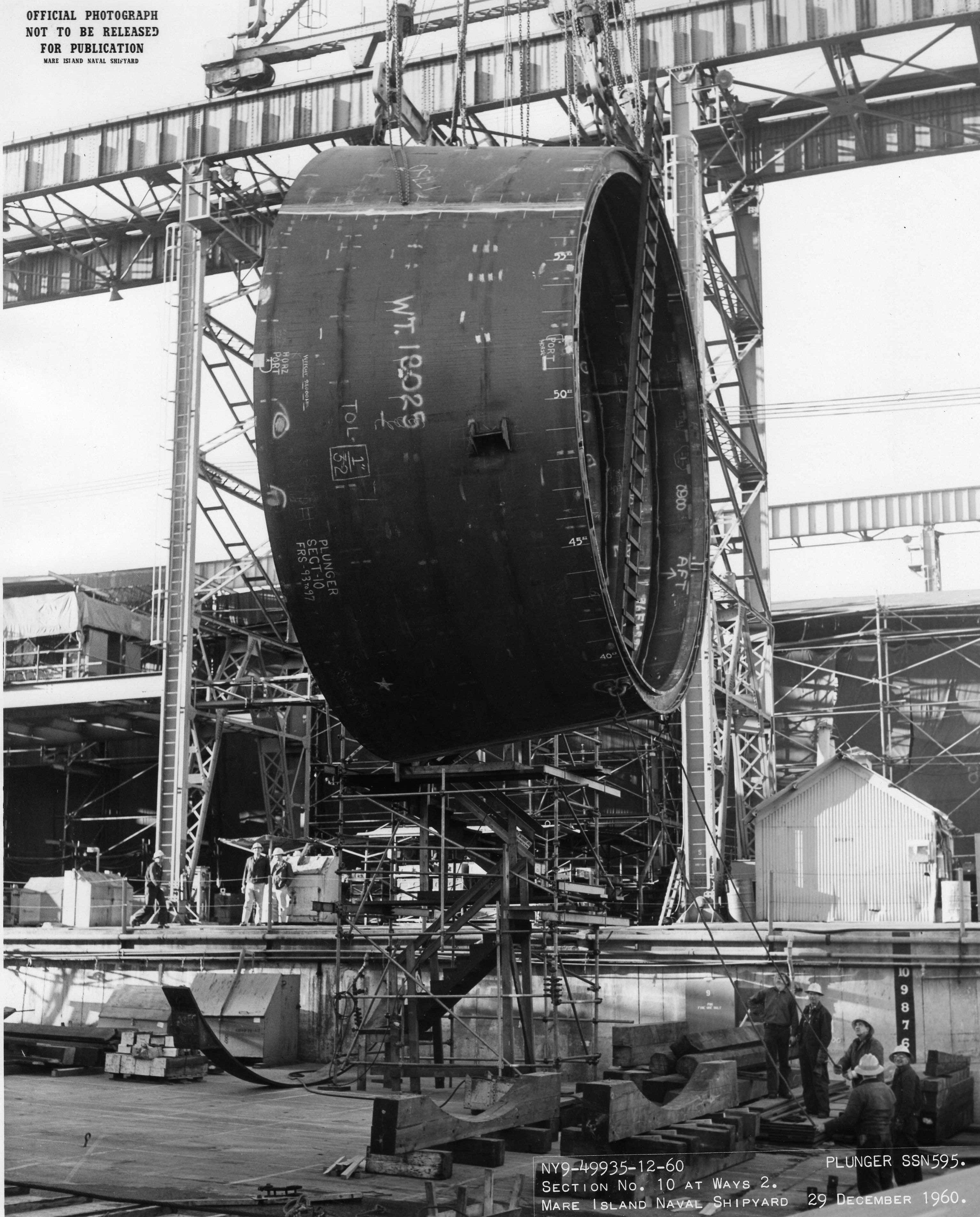 1.00k | Sections # 10 for Plunger (SSN-595) is shown being placed on the ways at Mare Island on 29 December 1960. | USN photo # 49935-12-60, contributed by Darryl L. Baker. | |