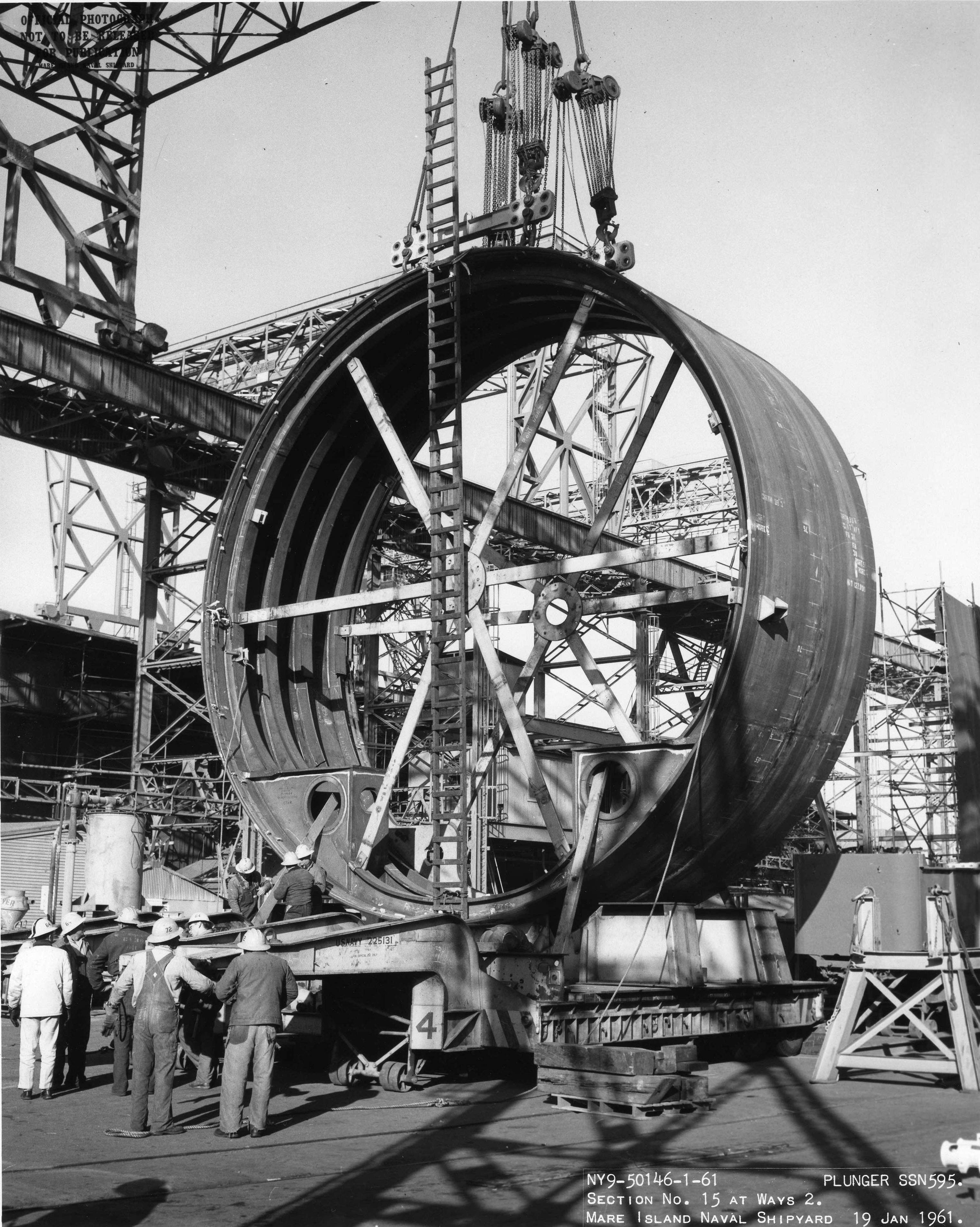 1.20k | Section # 15 for Plunger (SSN-595) is shown being placed on the ways at Mare Island on Mare Island on 19 January 1961. | USN photo # 50146-1-61, contributed by Darryl L. Baker. | |