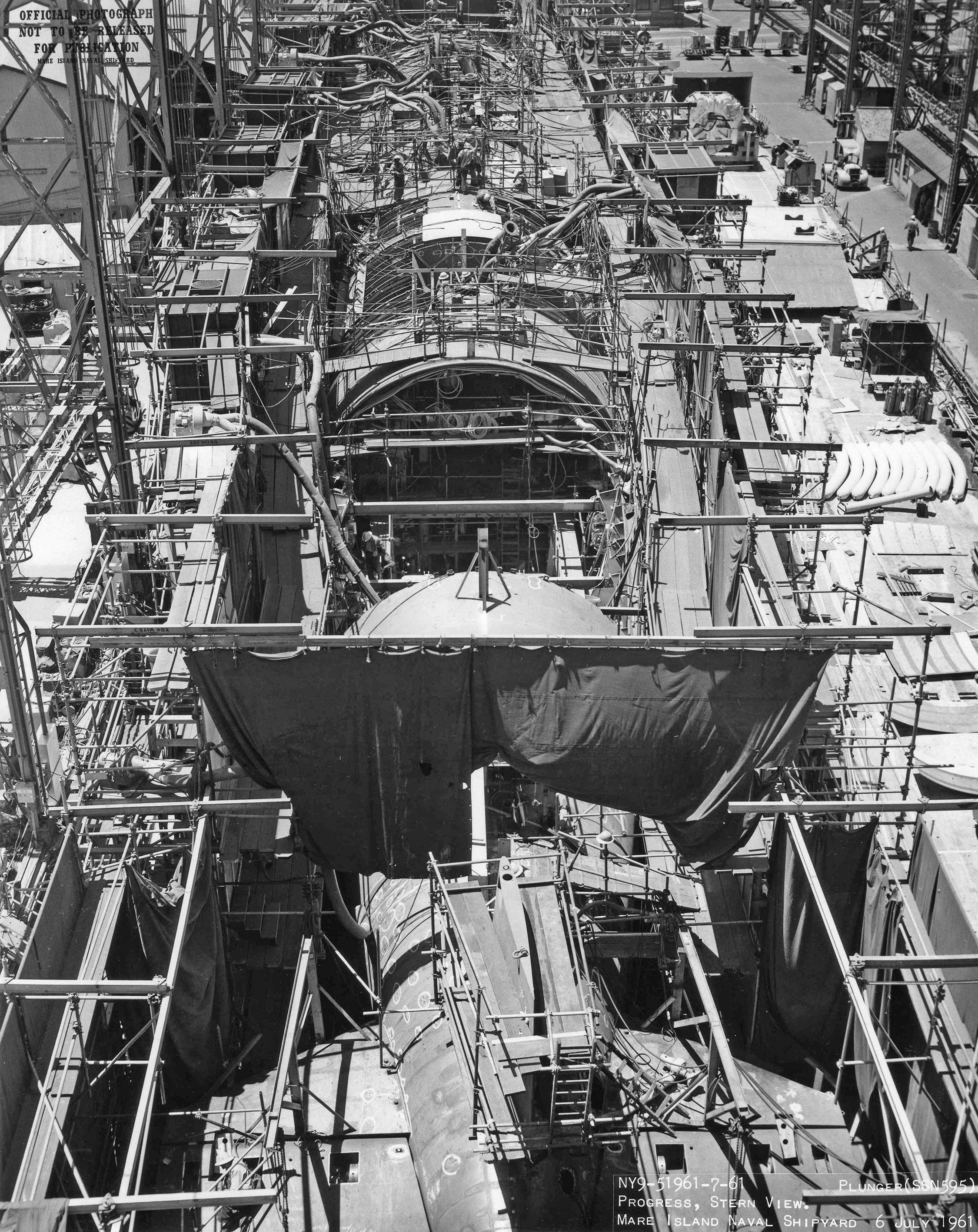 1.50k | Progress view looking toward the bow of Plunger (SSN-595) on the ways at Mare Island on 6 July 1961. | USN photo # NY9-51961-7-61, courtesy of Darryl L. Baker. | |