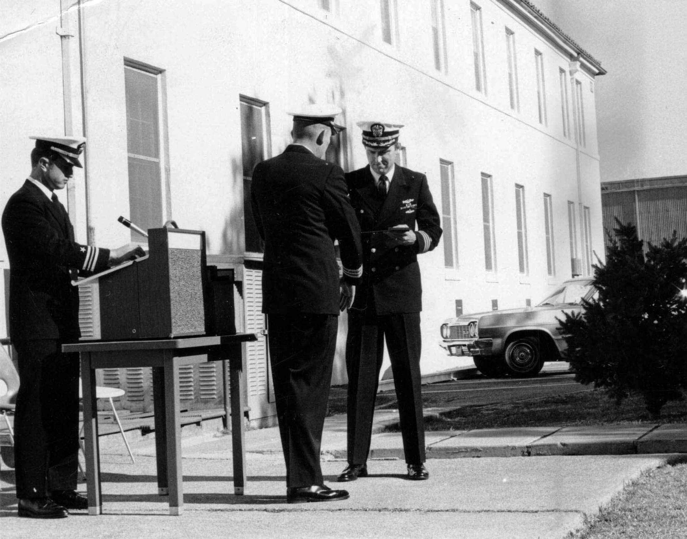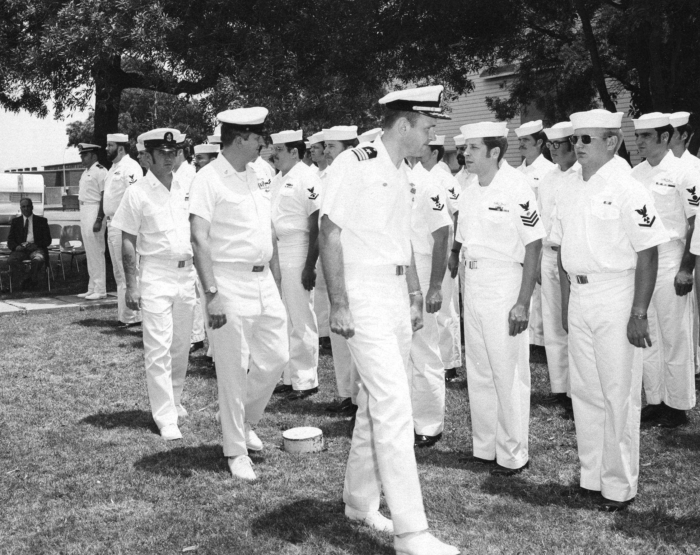 1.50k | Retirement ceremonies for QMC Merle Vaughn (left) and MMCS Eugene Hayes (Center) following CDR A. L. Wilderman, commanding officer Plunger (SSN-595) at Mare Island in July 1973. | USN photo courtesy of the Valllejo Naval and Historical Museum via Darryl L. Baker. | |