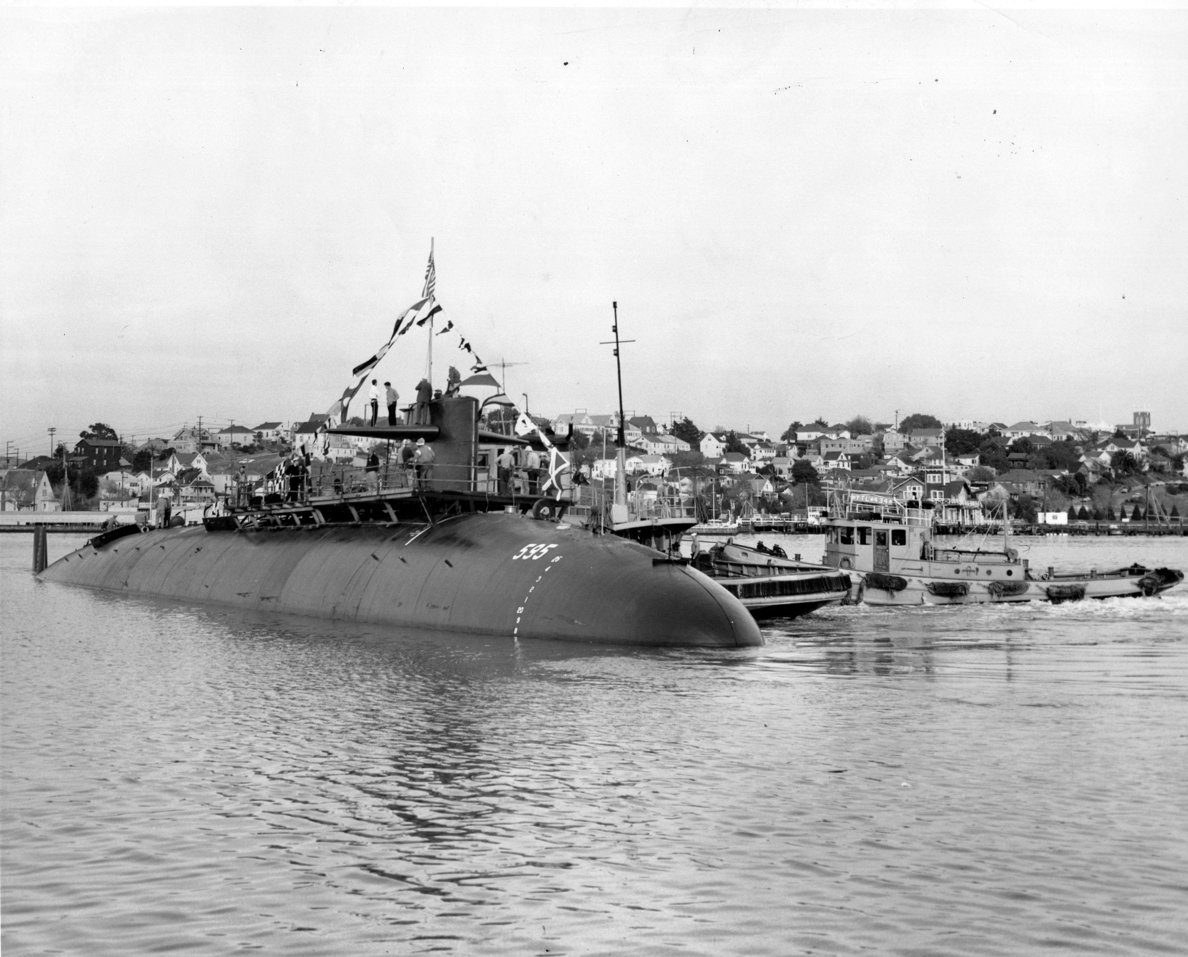 835k | The Plunger (SSN-595) is in the middle of the Mare Island Channel after her launching at Mare Island. YTL 434 is in the background. | USN photo # 53364-12-61 courtesy of the Vallejo Naval and Historical Museum via Darryl L. Baker. | |