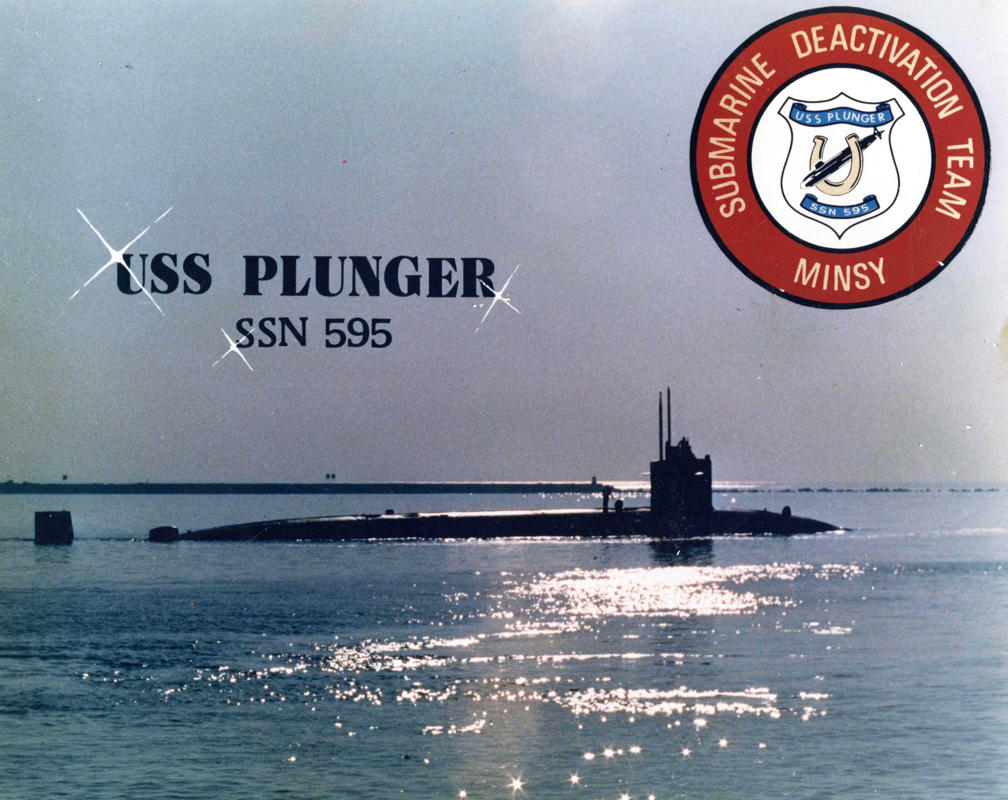 751k | US Navy photo presented to Mare Island Submarine Deactivation Team members marking the end of Plunger's (SSN-595) active naval service. | Photo 232800-5-89 from files of the Vallejo Naval & Historical Museum, courtesy of Darryl L. Baker. | |