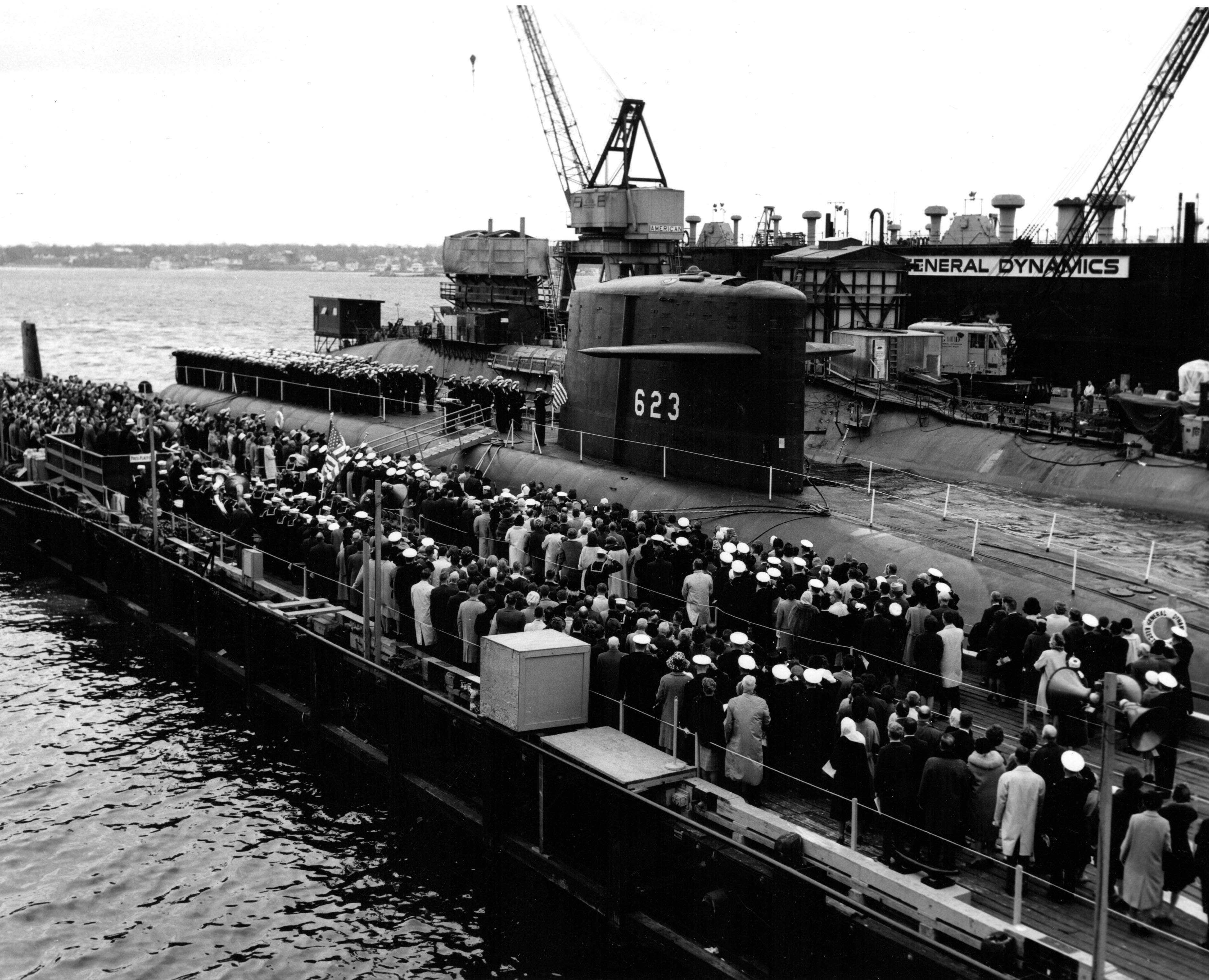 ![]() | 919k | The Nathan Hale (SSBN-623) crowd at the commissioning at General Dynamics Electric Boat on 23 November 1963. The Daniel Webster (SSBN-626) is the boat to the right, I believe. She would be commissioned on 9 April 1964. | Photo from the files of the Vallejo Naval & Historical Museum via Darryl L. Baker. | |