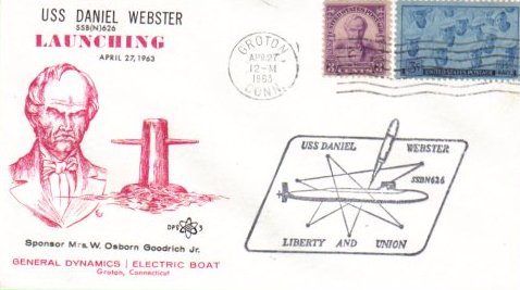 ![]() | 33k | Commemorative post mark on the occasion of the launching of the Daniel Webster (SSBN-626), 27 April 1963. | Courtesy of Jack Treutle (of blessed memory). | |