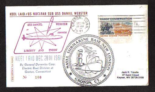 ![]() | 28k | This cover is one of 100 prepared by sponsor on the occasion of the keel laying of the Daniel Webster (SSBN-626), 28 December 1961. | Courtesy of Jack Treutle (of blessed memory). | |