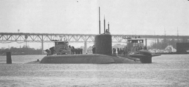 ![]() | 59k | Daniel Webster (SSBN-626) being helped by Navy yard tugs alongside a pier at the New London sub base sometime before 1974. | USN photo by JO2 Gwyneth J. Schulz from The American Submarine, by Norman Polmar, submitted by Robert Hurst. | |